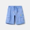 Misdyed-effect stretch cotton denim Bermuda shorts with abrasions. Internal waist adjustment. Five pockets. Multicoloured lettering embroidery on the back. Zip and button fastening.
