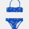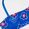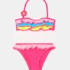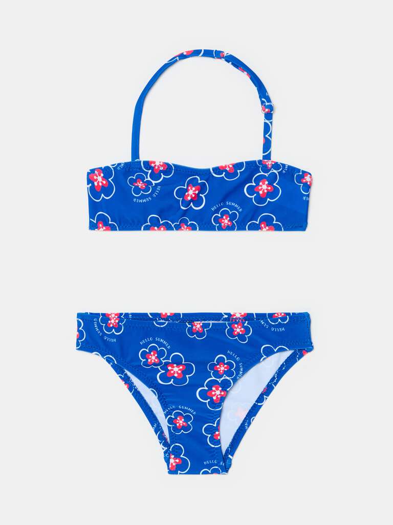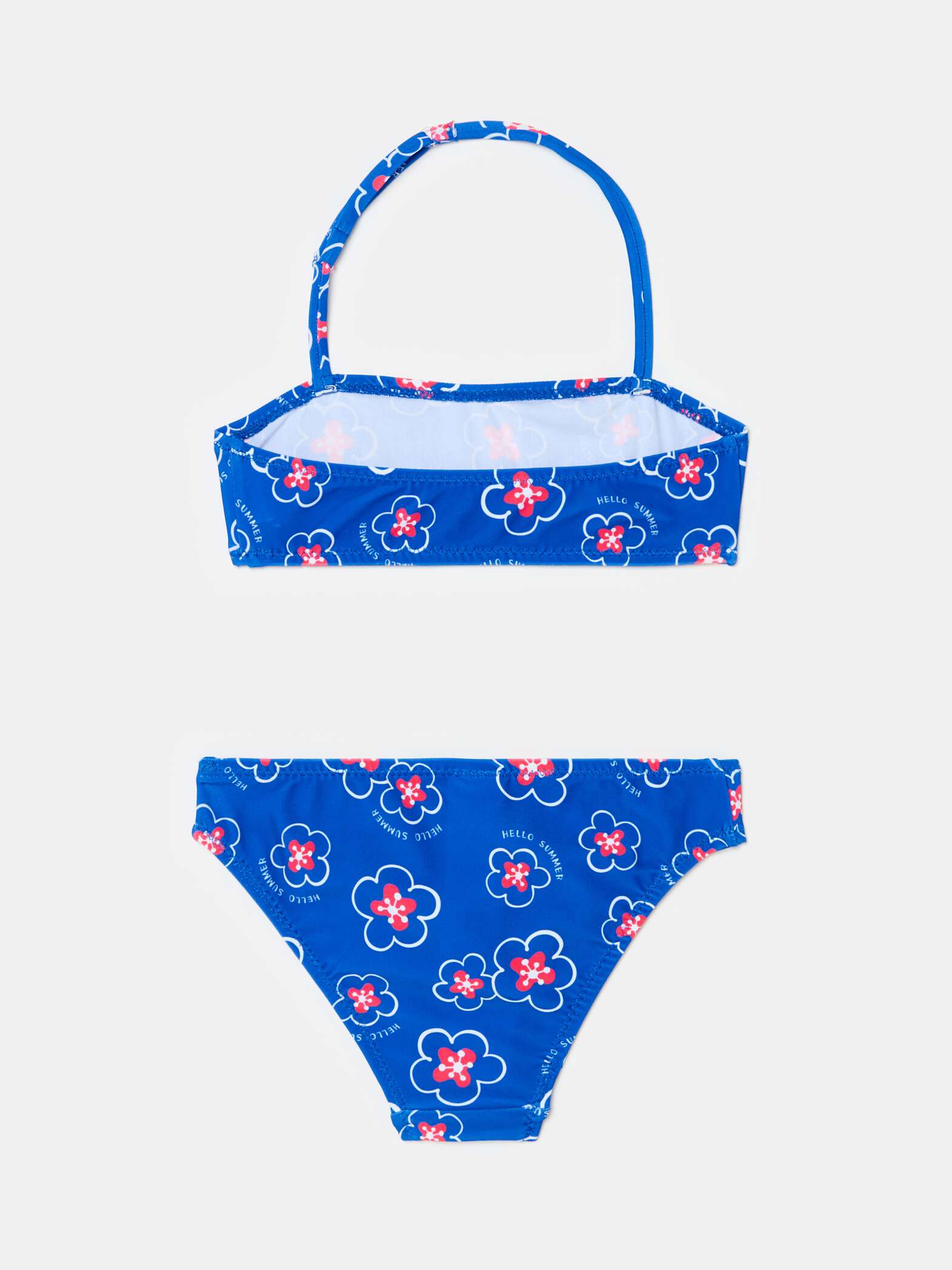 Bikini with all-over lettering and flowers pattern. Bandeau top with laces tied at the neck. This garment was made using recycled polyamides.