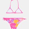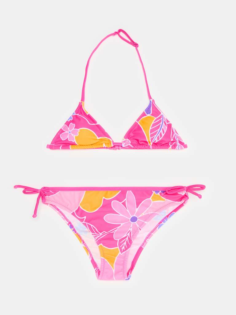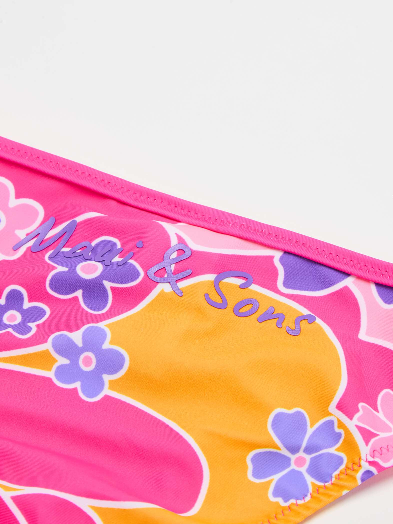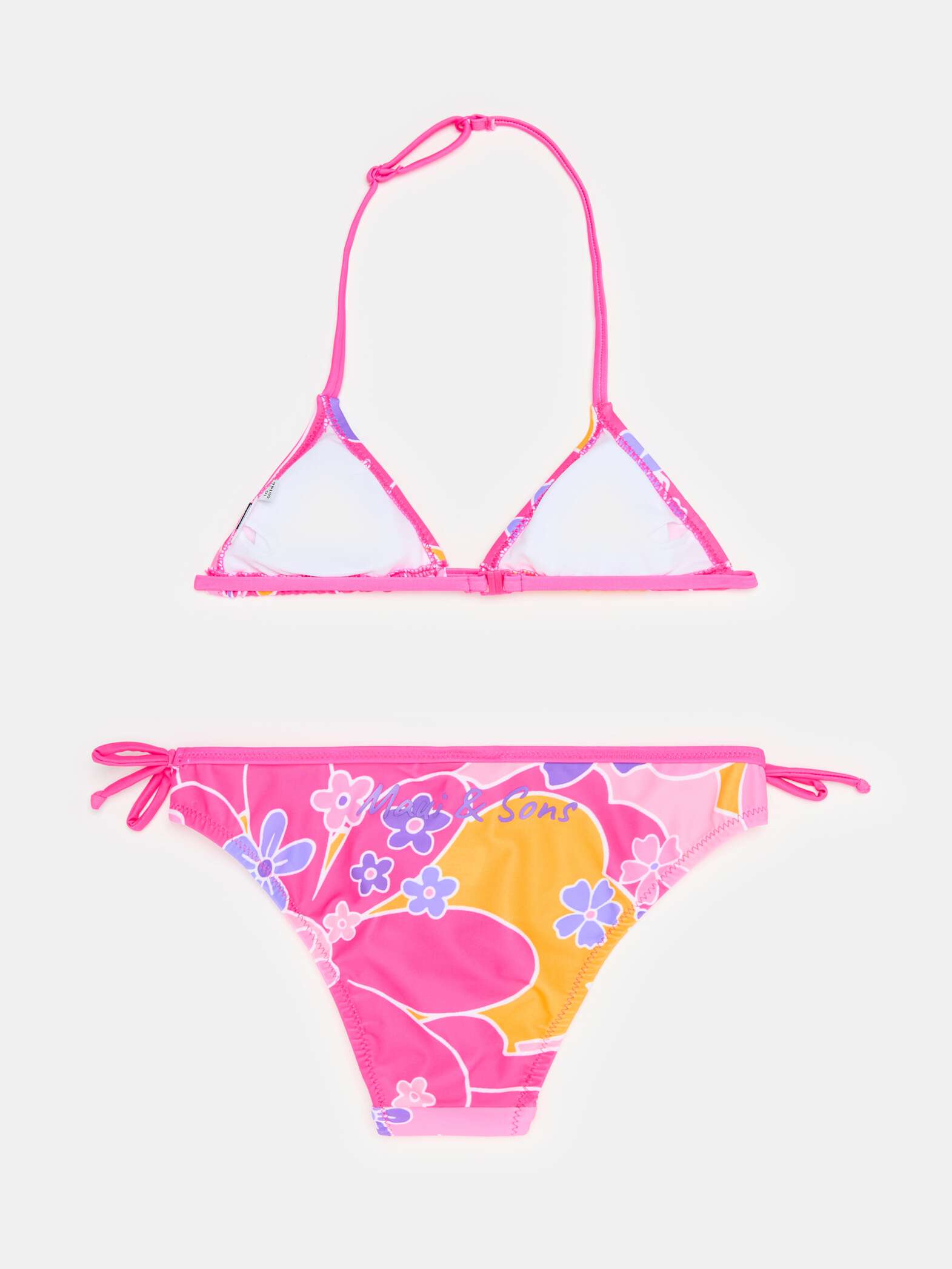 Floral patterned bikini. Triangle top with single adjustable shoulder strap. Hook fastening on the back. Bikini bottom with bows at the sides. Maui and Sons lettering print on the back. This item is made using recycled polyester.