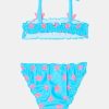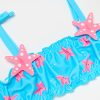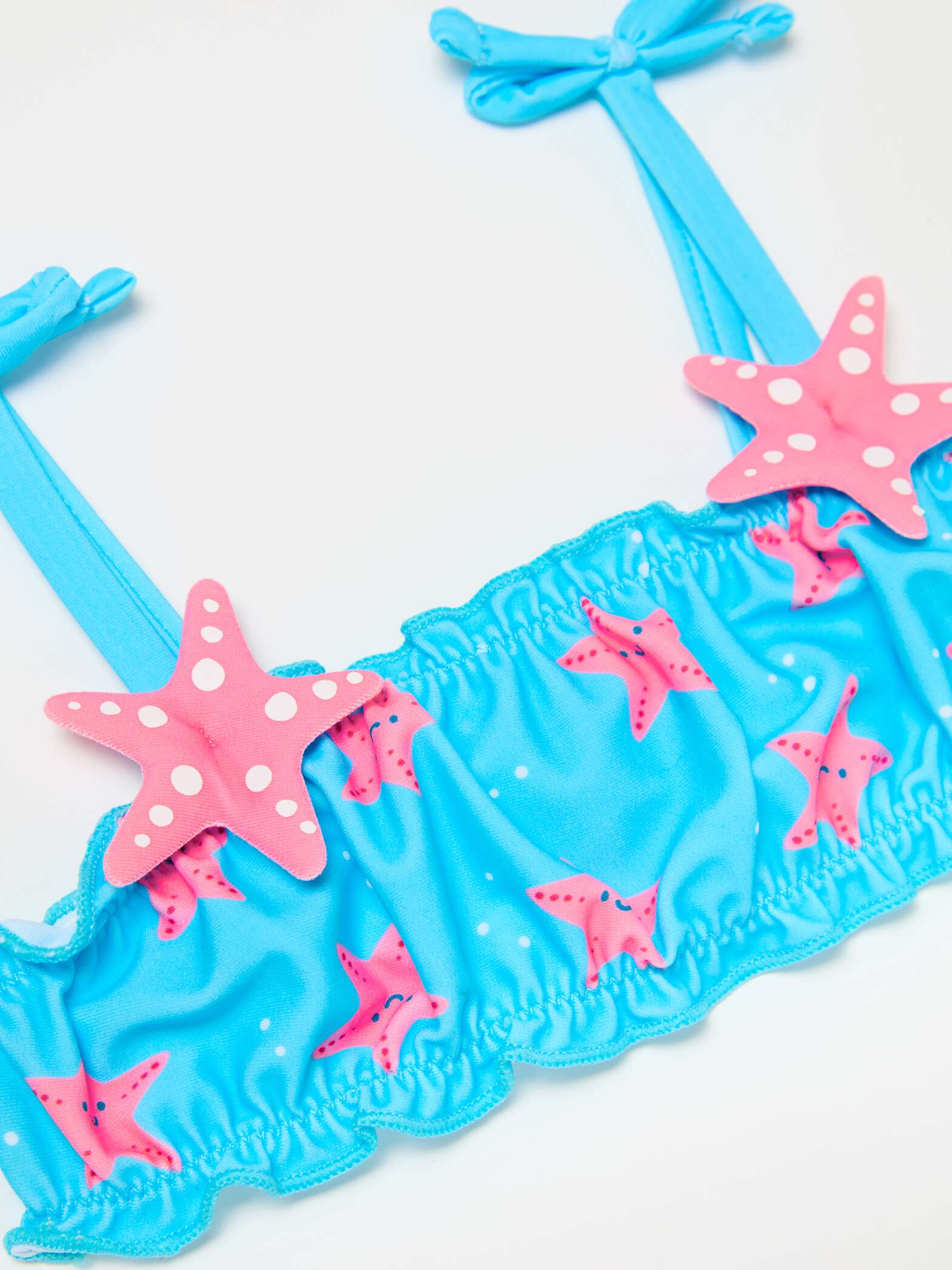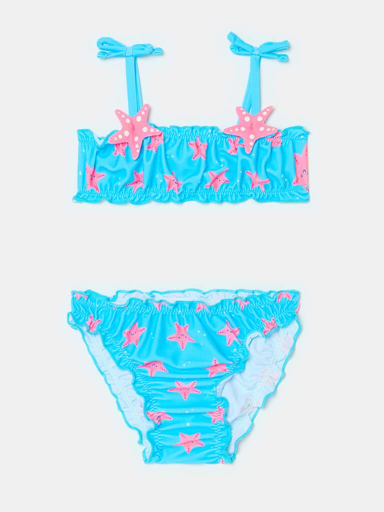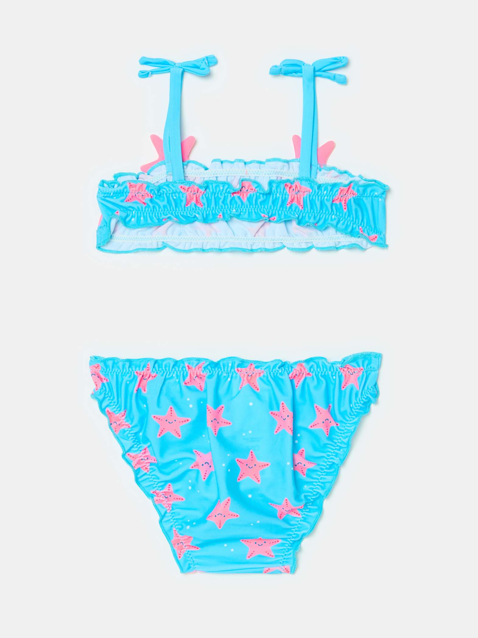 Bikini avec imprimé étoiles de mer all-over et bordure froncée. Haut bandeau. Bretelles avec nœud et étoile de mer.
