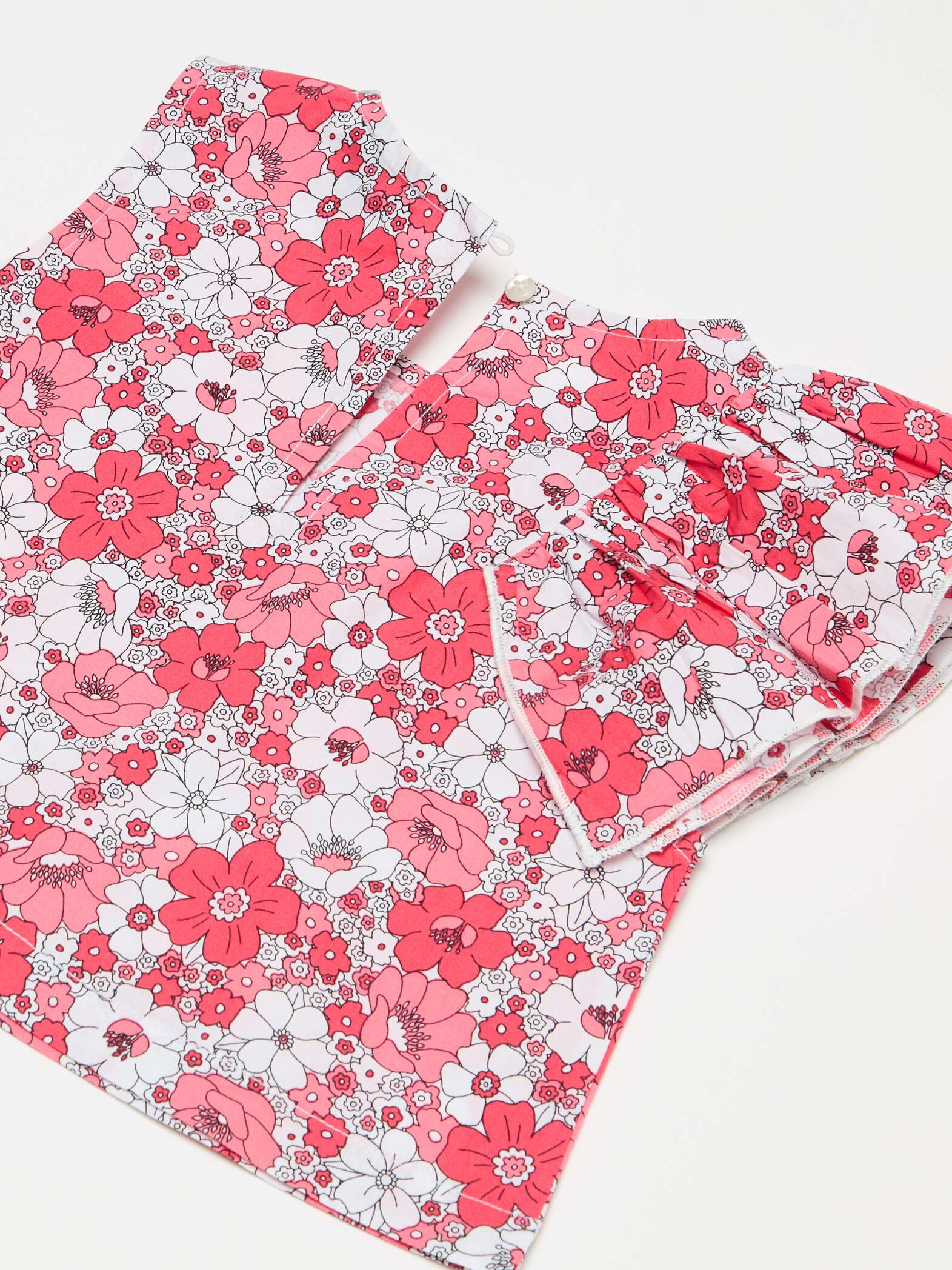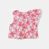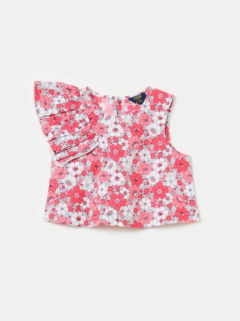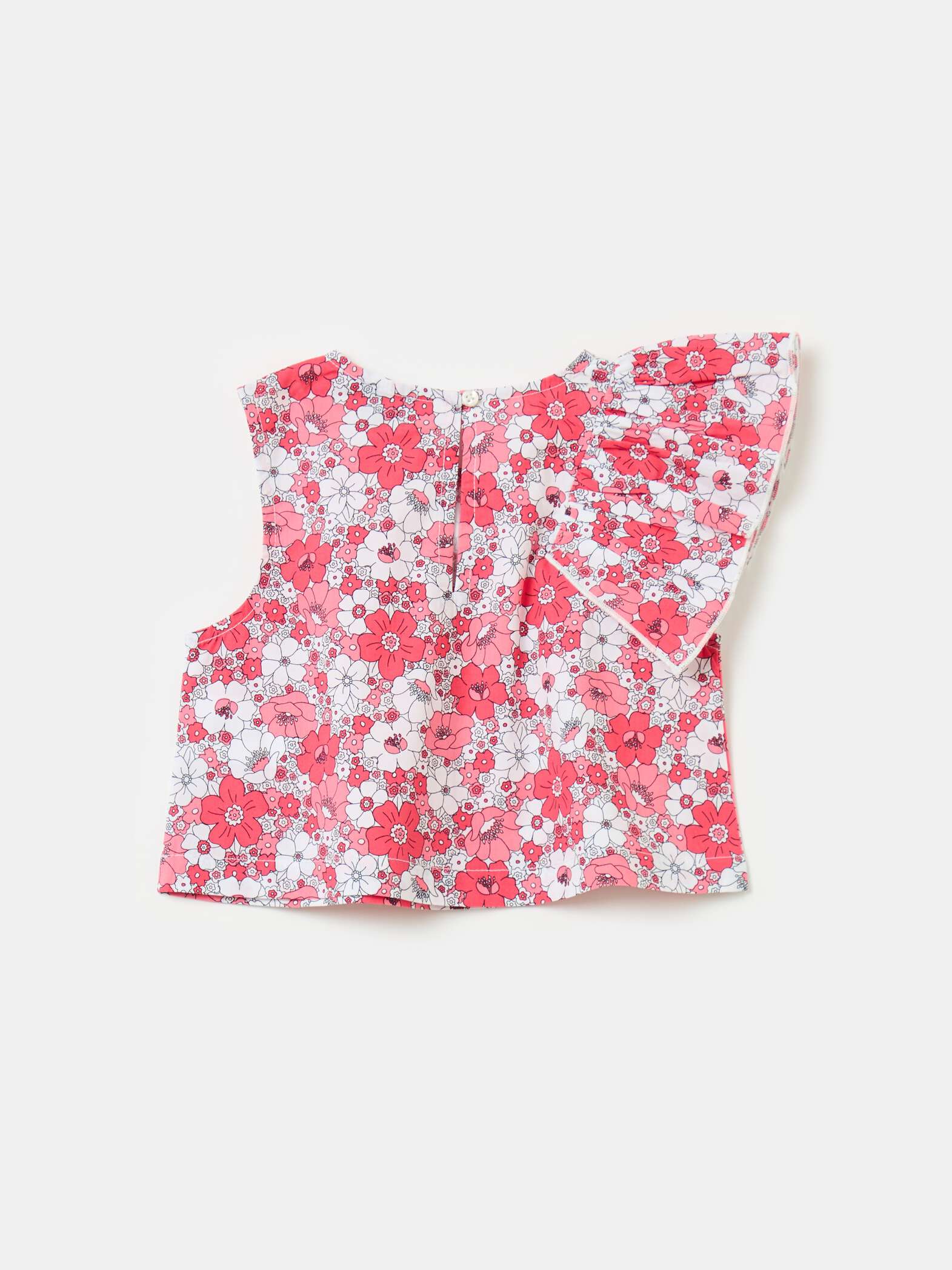 100% cotton sleeveless blouse with floral pattern. Round neck. Flounce at the side. Button fastening on the back.