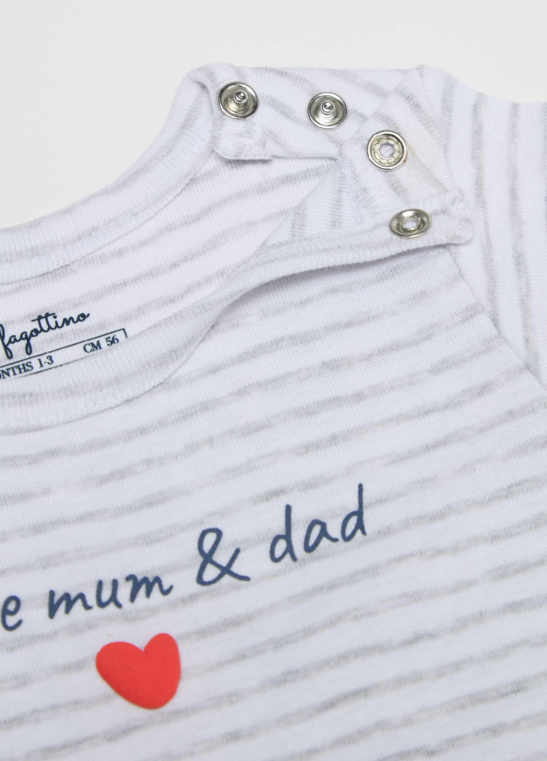 Ensemble de deux bodys à manches courtes 100% à manches courtes. Nou rond. J’adore maman et papa imprimer sur le devant. Un body avec un motif rayé. Fixation à bouton-instant sur l’épaule et l’entrejambe.