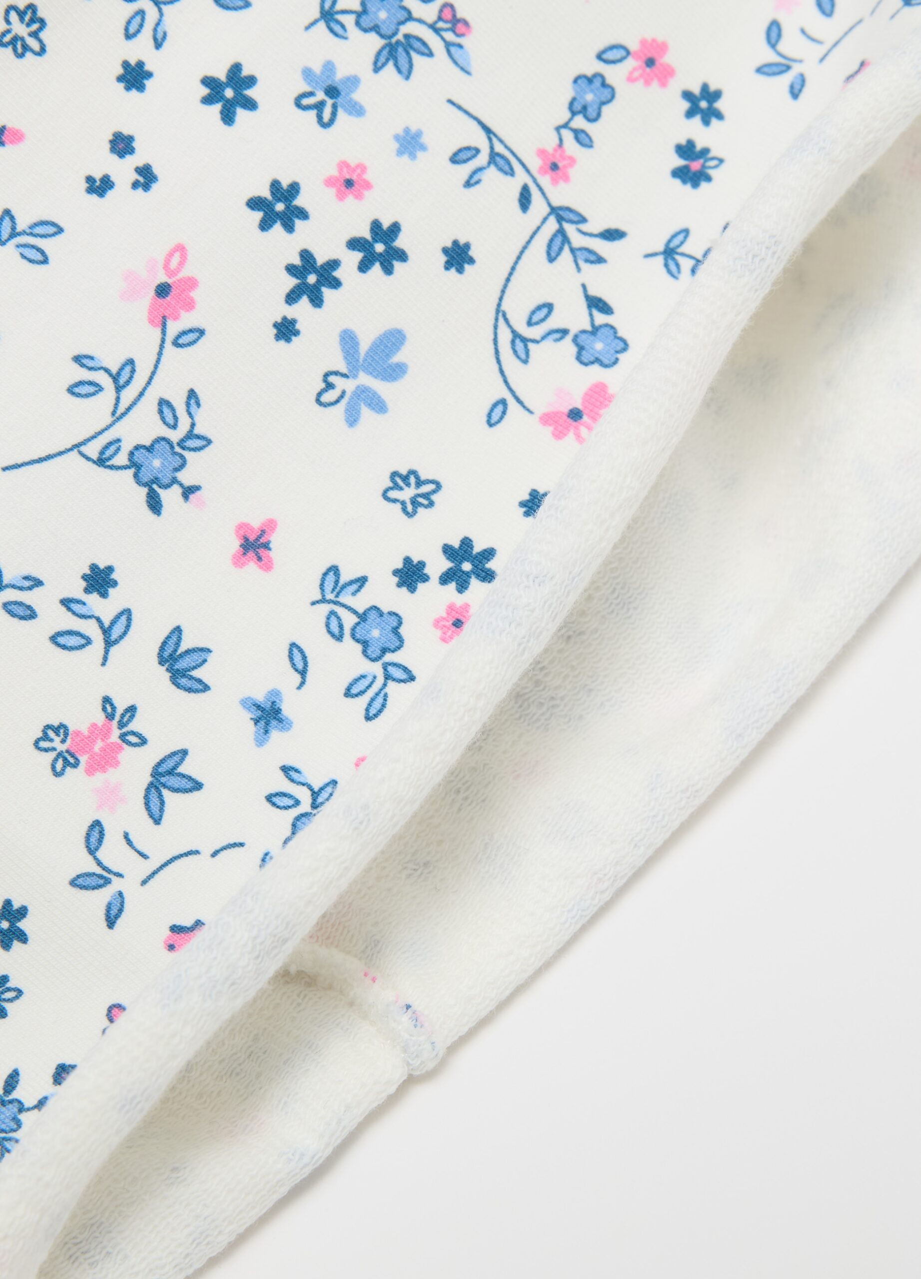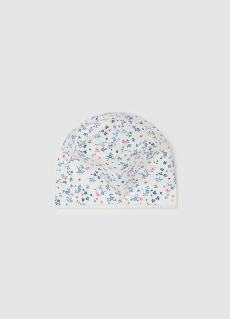 Bonnet en molleton de coton stretch (doublure polaire non grattée). Imprimé all-over petites fleurs.