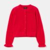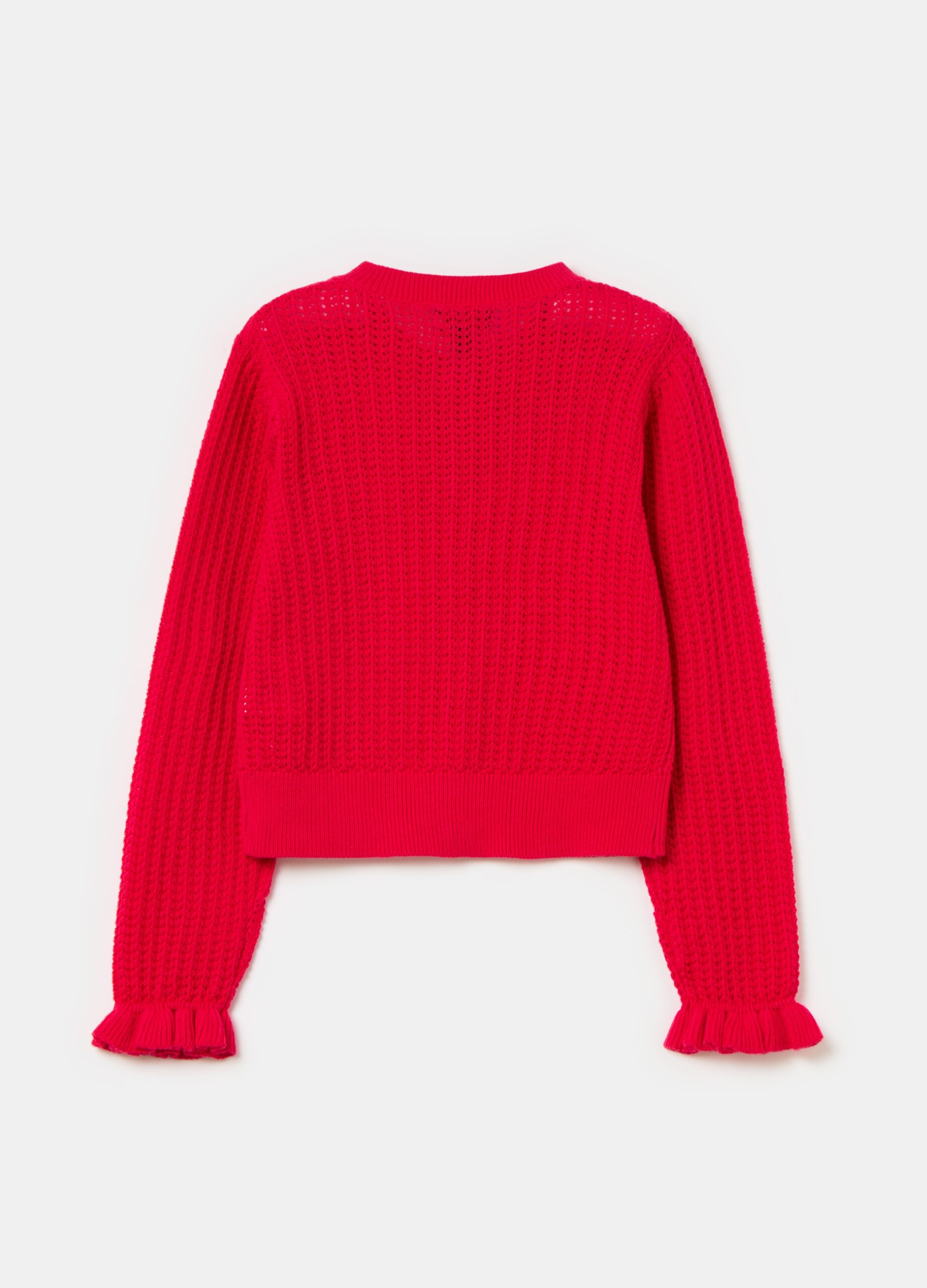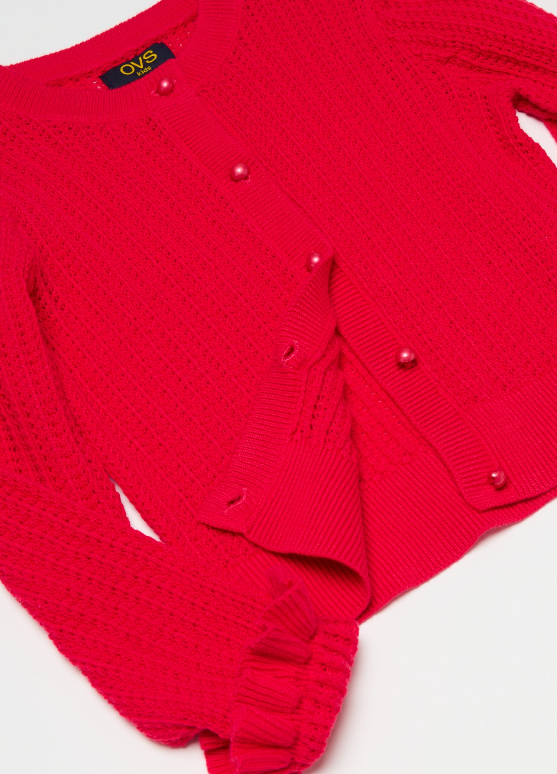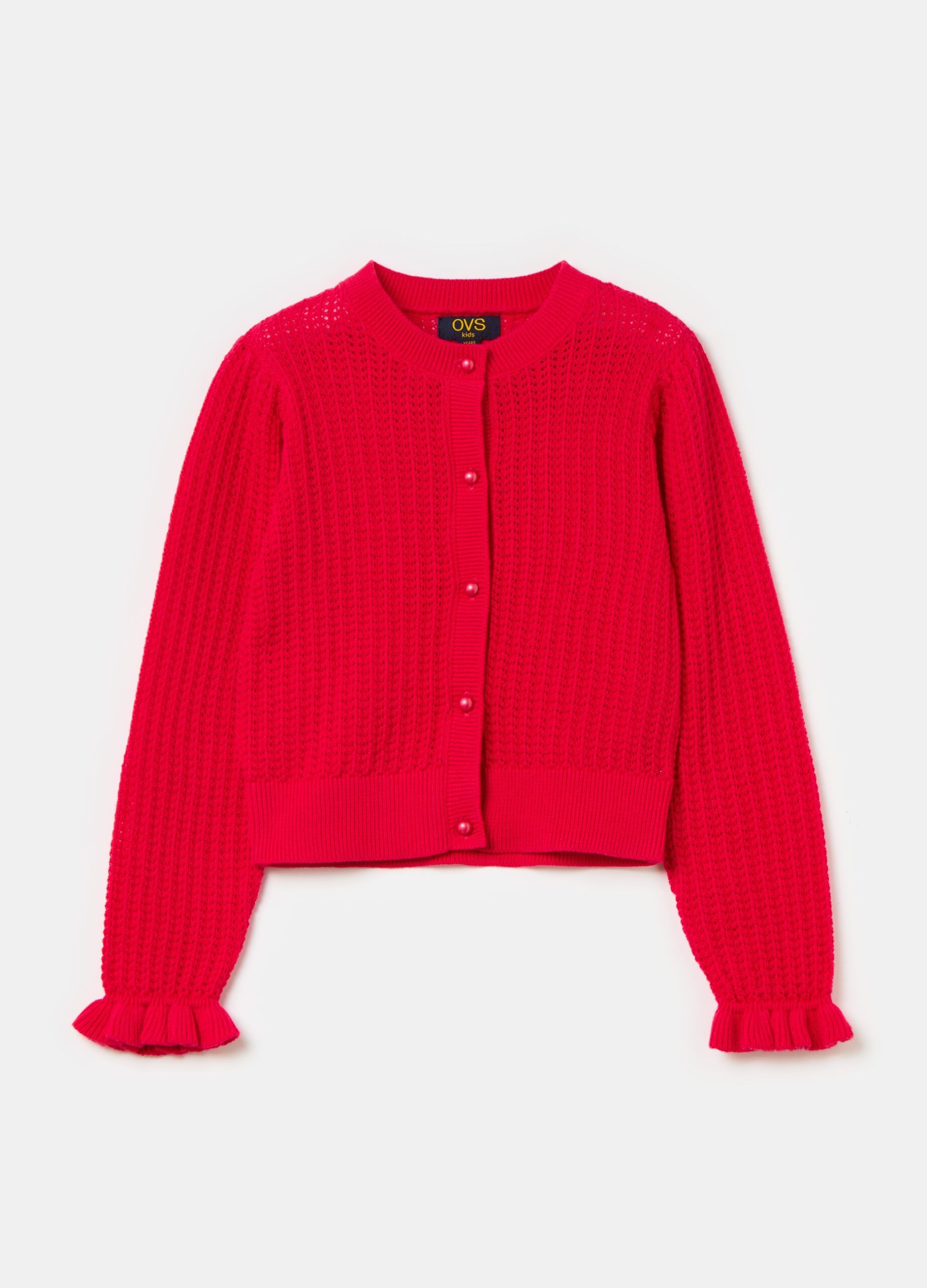 Cardigan 100% coton au design ajouré. Col rond. Poignets à volants. Bordures côtelées. Fermeture boutonnée assortie.