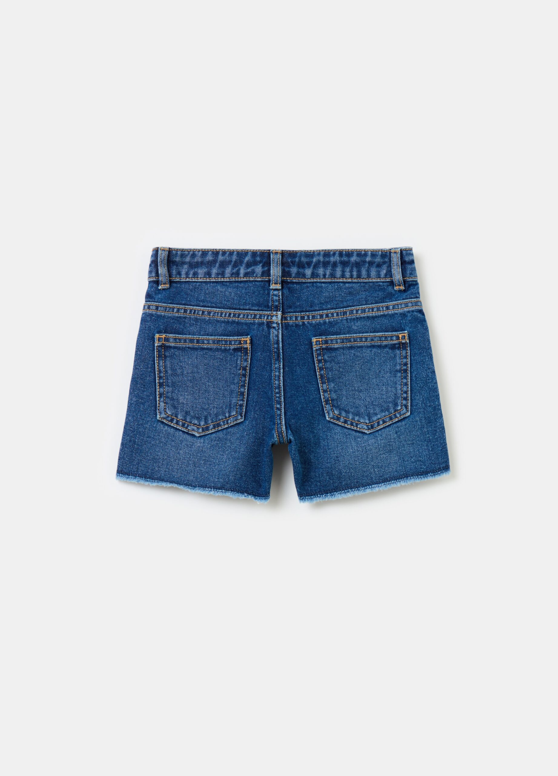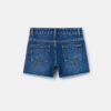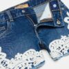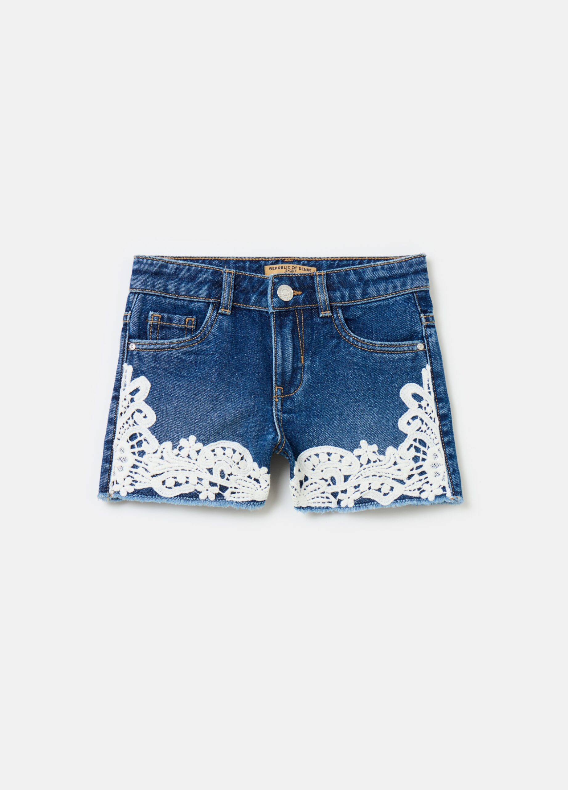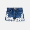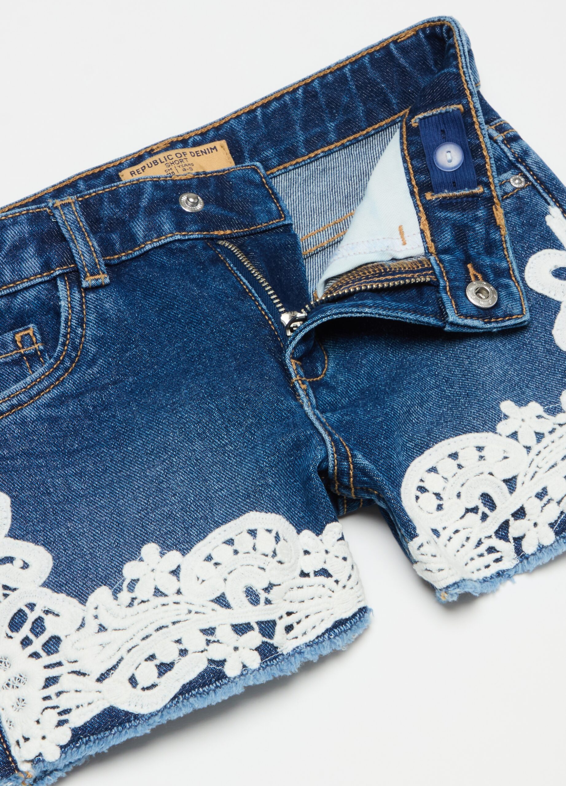 Short en denim 100% coton recyclé. Ajustement interne de la taille. Cinq poches. Application en broderie anglaise sur le devant. Fermetures zippées et boutons-pression.