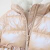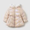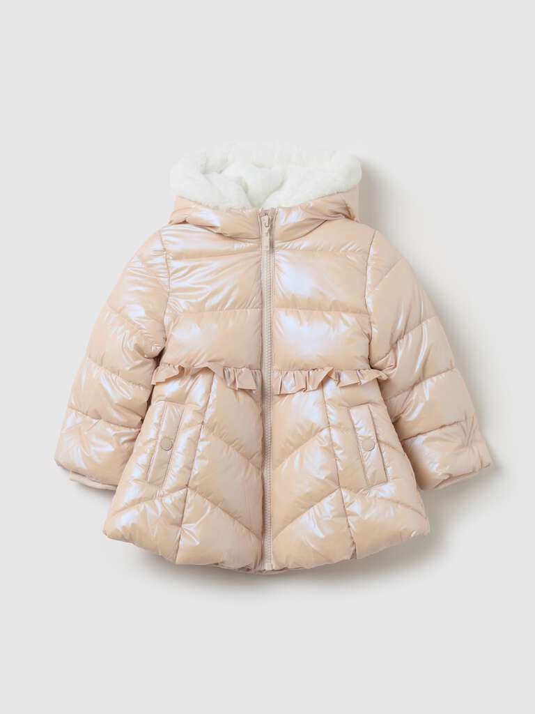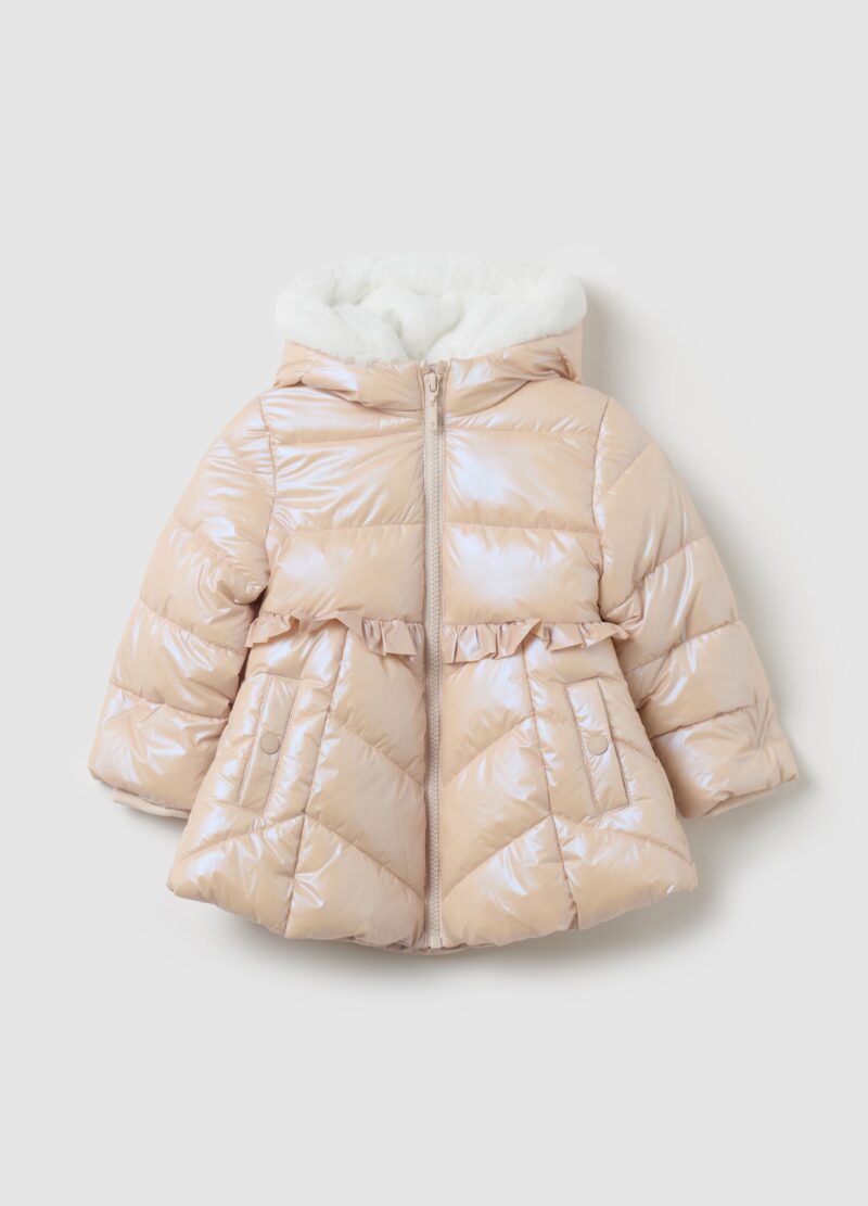 Doudoune évasée effet brillant en polyester recyclé avec capuche. Réalisée avec un rembourrage ultraléger innovant REPREVE® à impact réduit sur l’environnement. Sans perfluorocarbures, nocifs pour l’homme et l’environnement. Doublure en fausse fourrure. Volant à la taille. Deux poches verticales avec bouton-pression. Poignets élastiqués. Fermeture entièrement zippée.