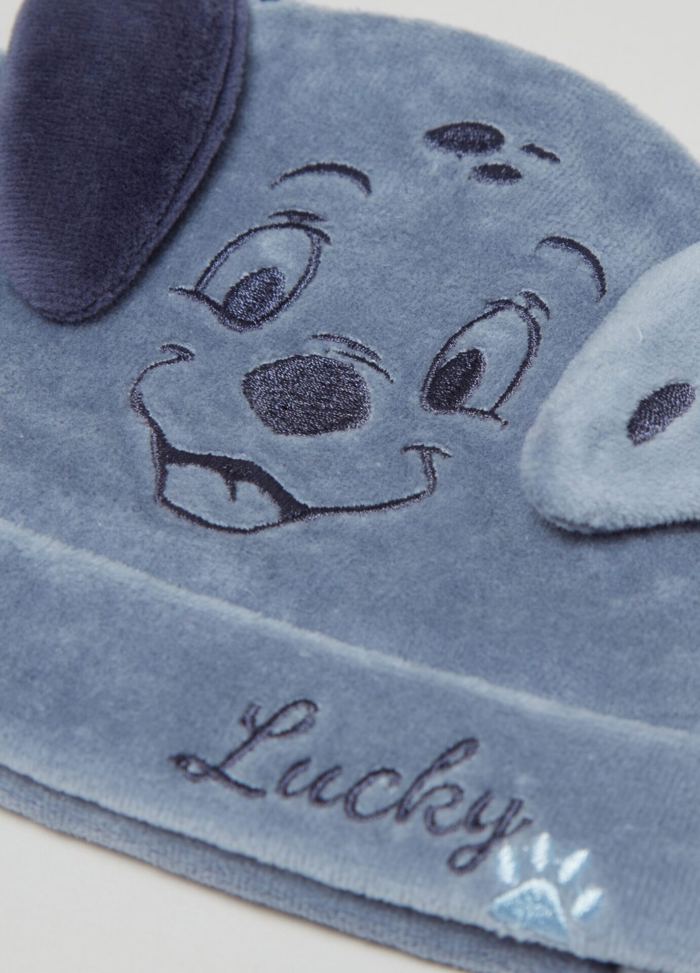 Ensemble composé de chaussons bébé en velours 100% coton et d’un bonnet avec broderie Disney Baby 101 Dalmatiens. Chapeau avec oreilles et broderie Lucky. Revers avec broderie lettrage. Chaussures bébé avec broderie chiots.