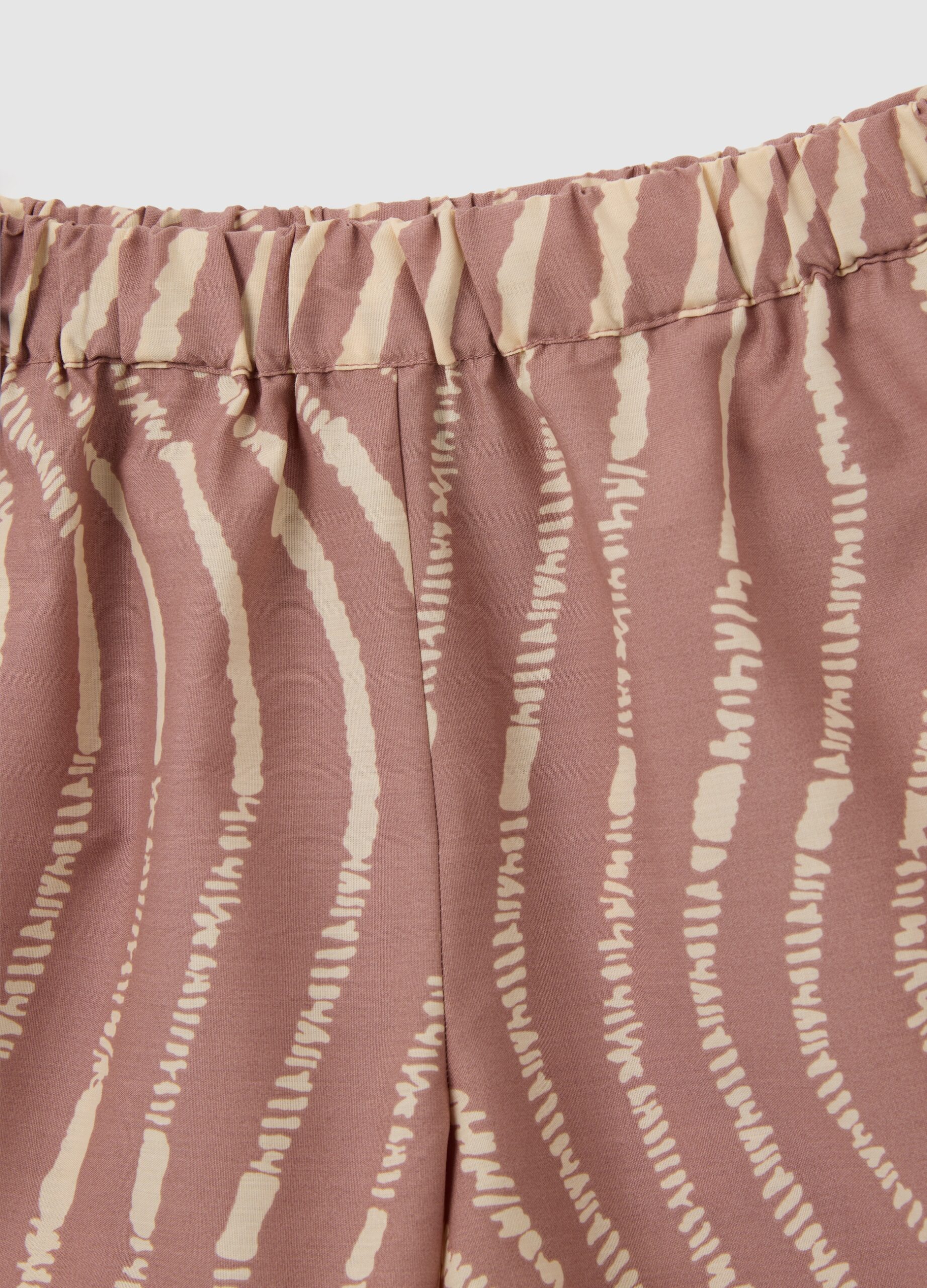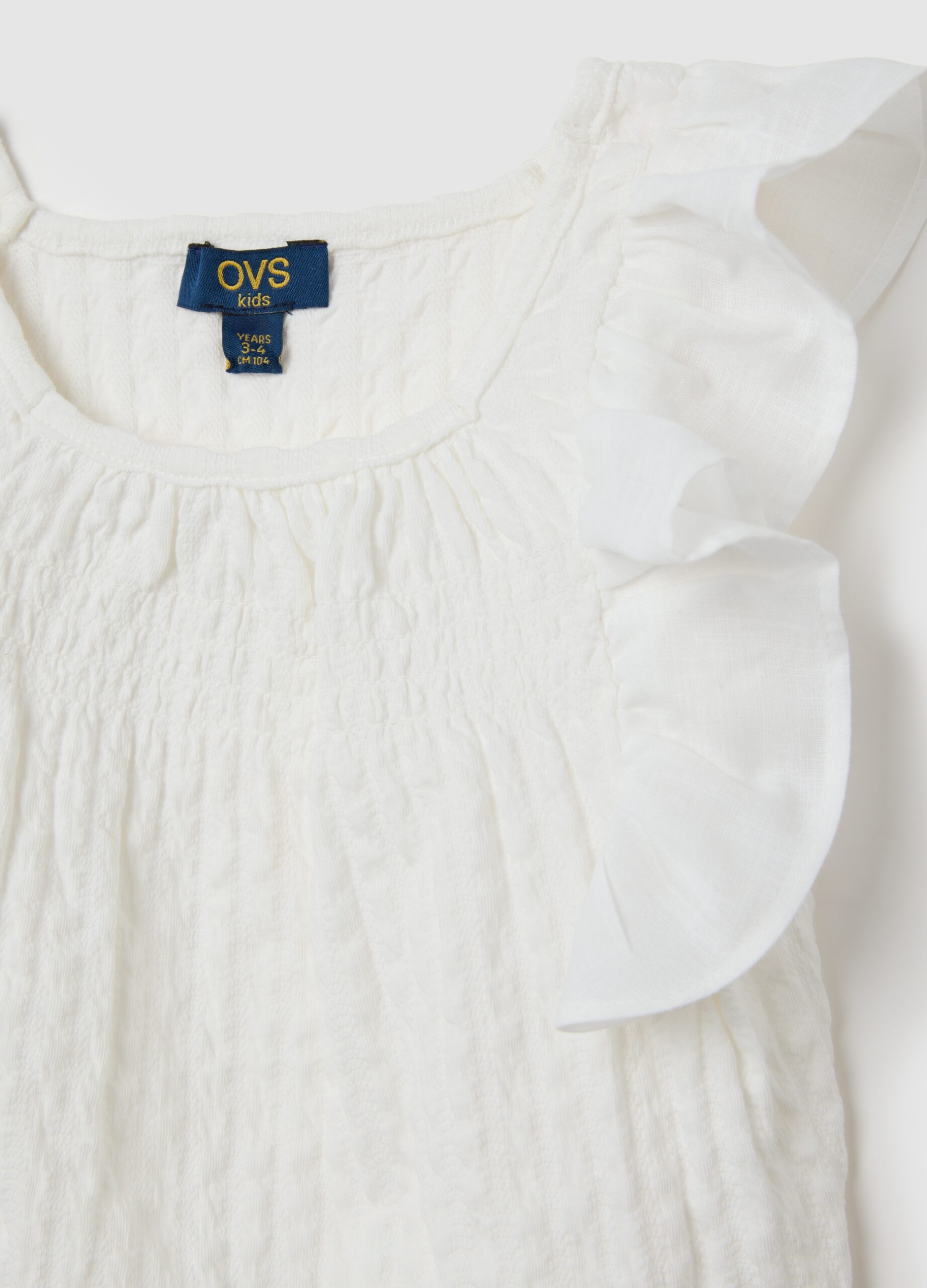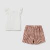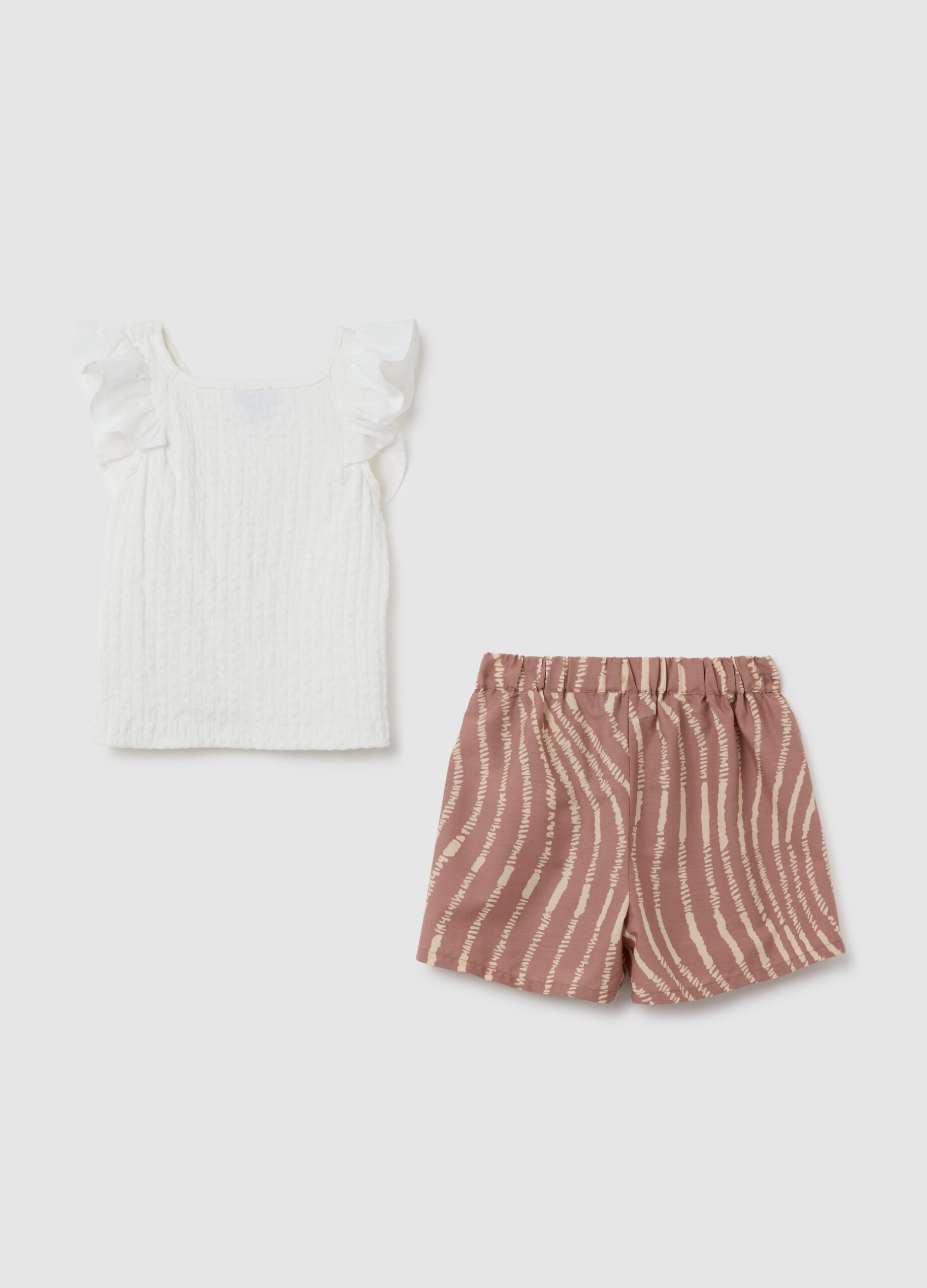 Cet ensemble de coton extensible de la ligne OVS Kids, avec un haut blanc avec des volants et des shorts bruns décorés, est parfait pour les filles âgées de 3 à 10 ans. Le haut a un design simple avec un col classique, tandis que les shorts offrent un motif décoratif qui ajoute l’originalité au look.