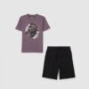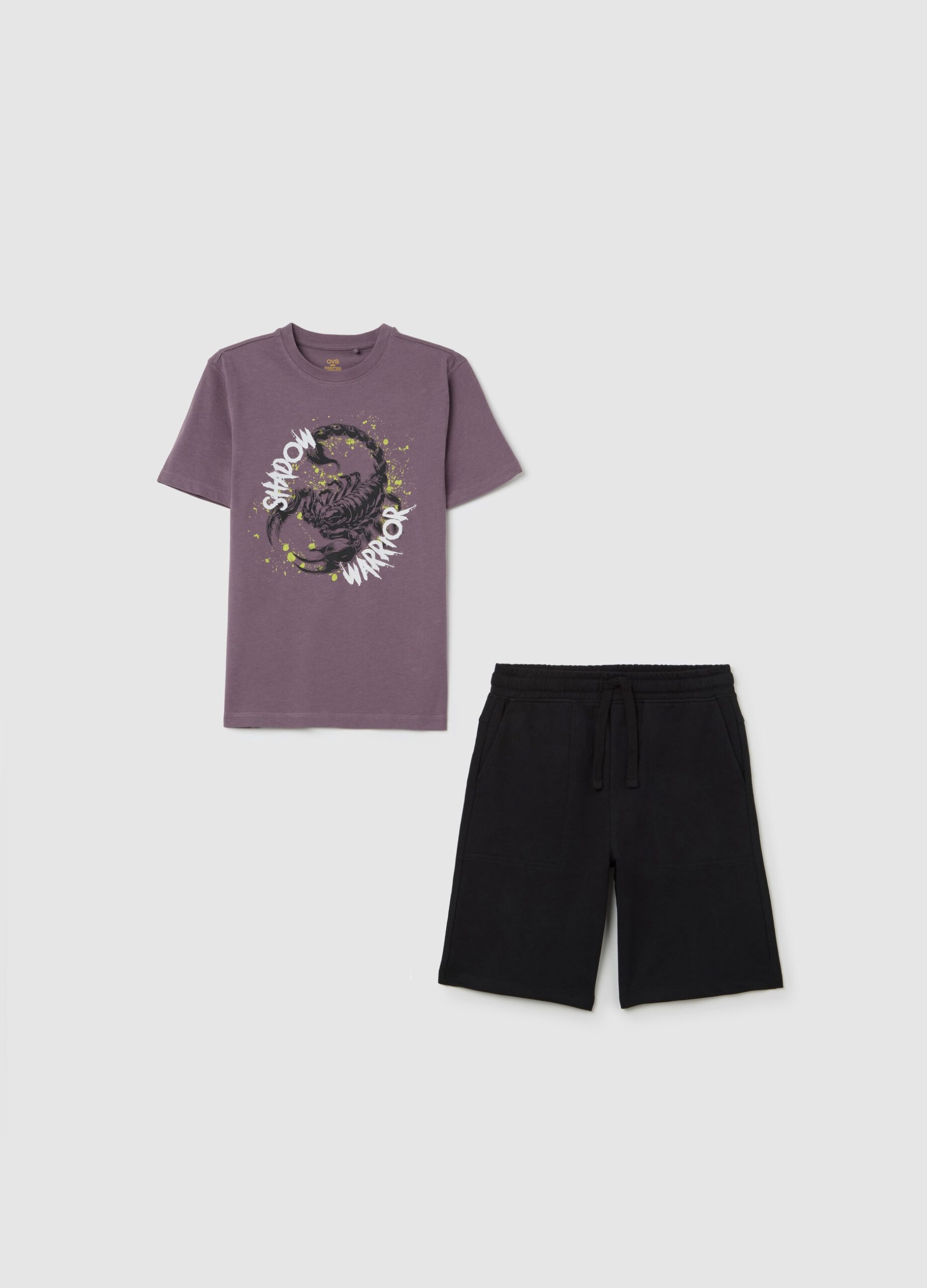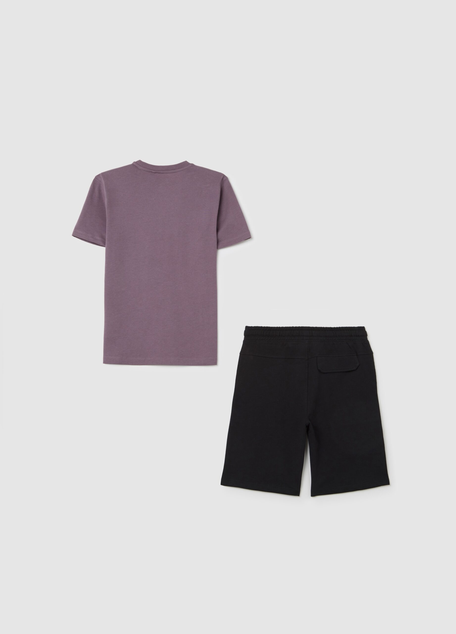 Ensemble de jogging composé d’un t-shirt et d’un short OVS Kids. T-shirt violet avec imprimé graphique à l’avant et décolleté de l’équipage. Shorts noirs avec une taille élastique pour le confort et la praticité. Fabriqué en coton pur pour une sensation confortable et douce.