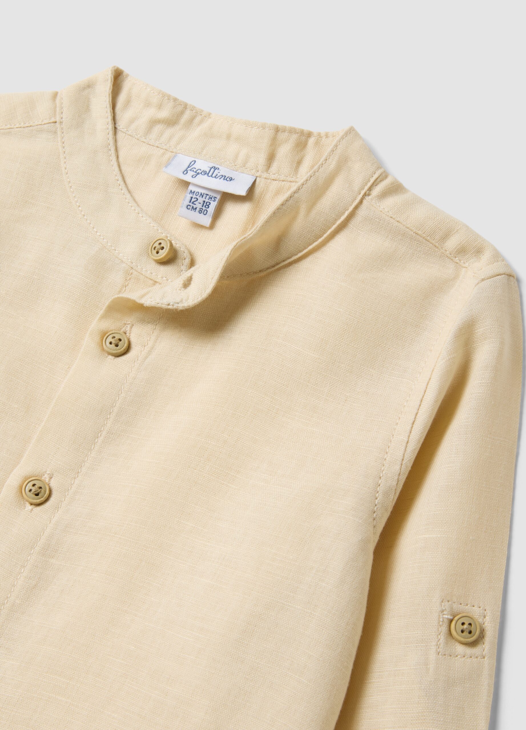 L’ensemble multicolore de la ligne Fagottino est parfait pour les enfants âgés de 9 à 36 mois. Composée d’une chemise beige à manches longues avec un col mao et d’un short rayé marron, cette tenue en mélange de lin et de coton assure confort et praticité pour le jeu quotidien. Un excellent choix pour les enfants, idéal pour toute occasion.