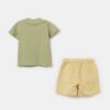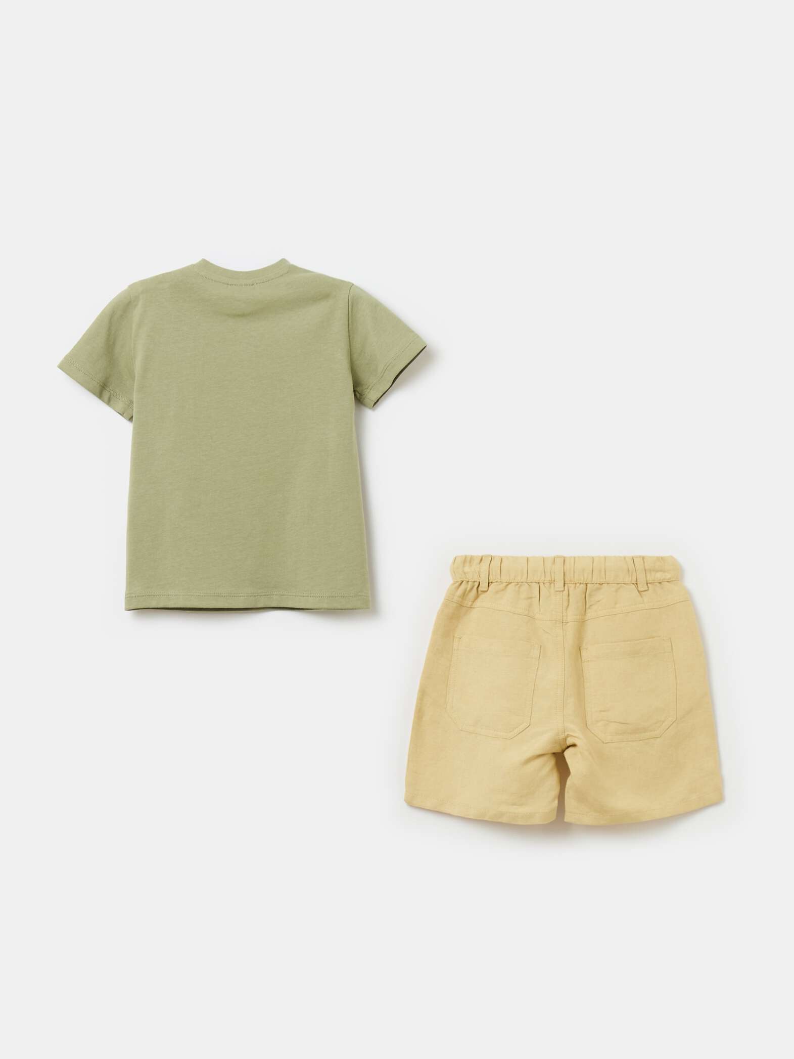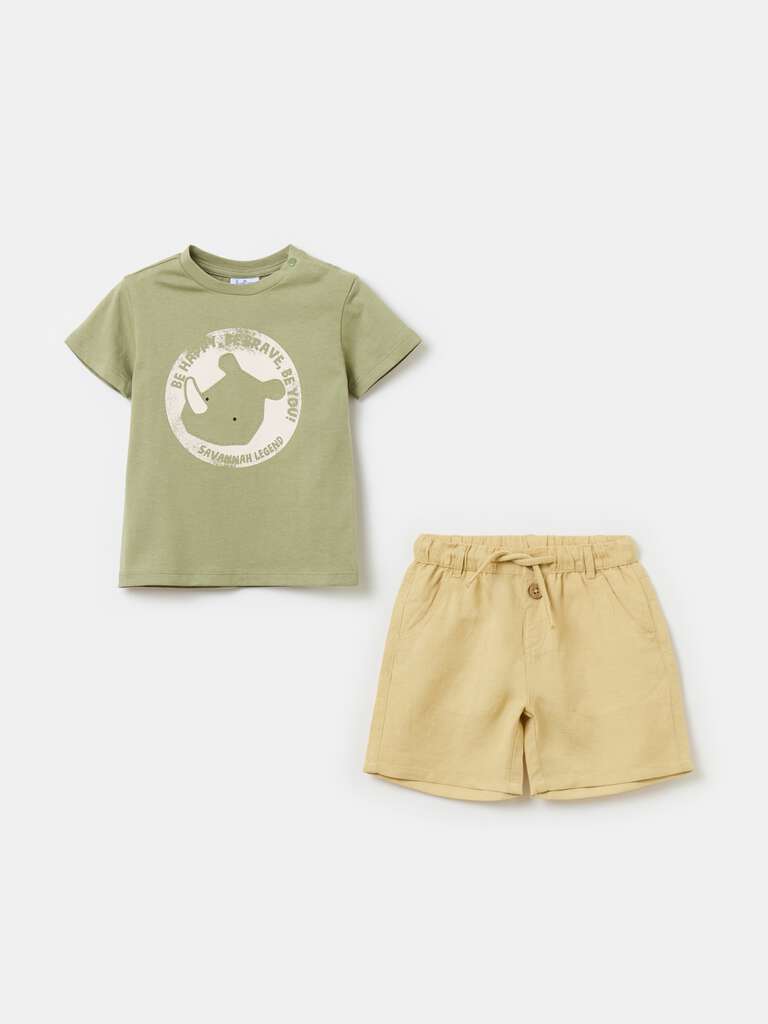 Ensemble composé d’un T-shirt 100% coton et d’un bermuda en lin et viscose. T-shirt à col rond et boutons pression sur l’épaule. Patch rhinocéros et lettrage imprimé effet vintage sur le devant. Bermuda avec taille élastique et cordon de serrage. Deux poches italiennes et deux poches plaquées au dos. Fermeture boutonnée effet bois.
