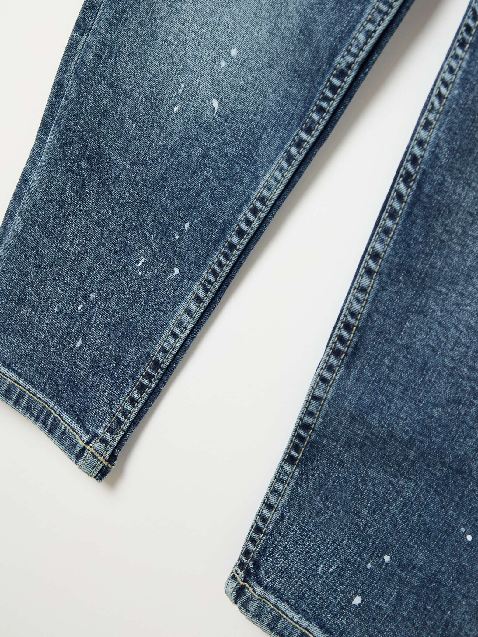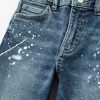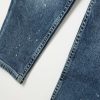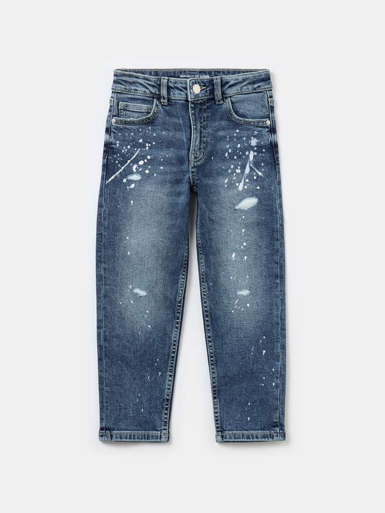 Jean coupe droite en coton stretch effet délavé. Réglage interne de la taille. Abrasions sur le devant. Imprimé effet taches de peinture sur le devant et le dos. Fermeture par zip et bouton.