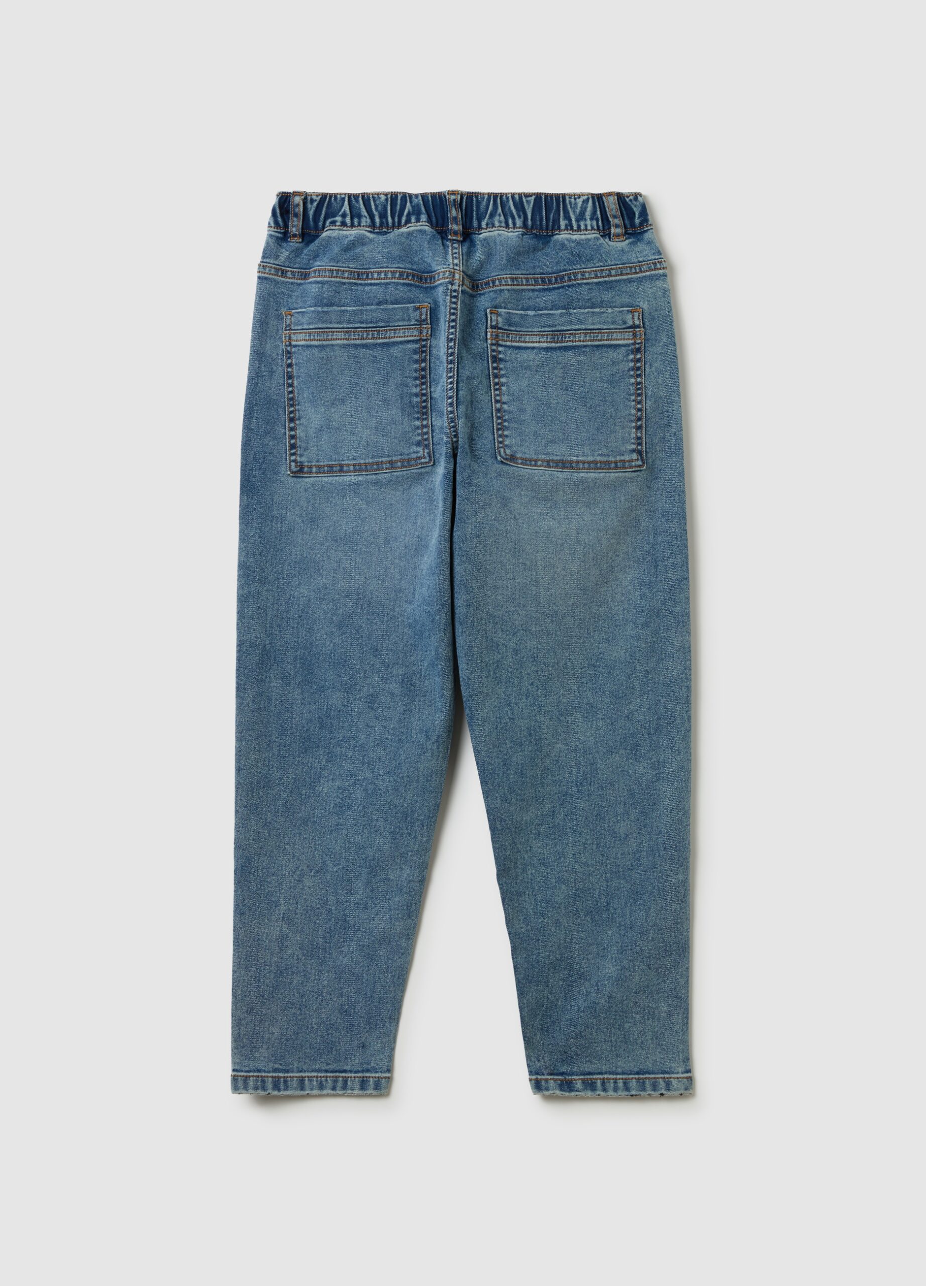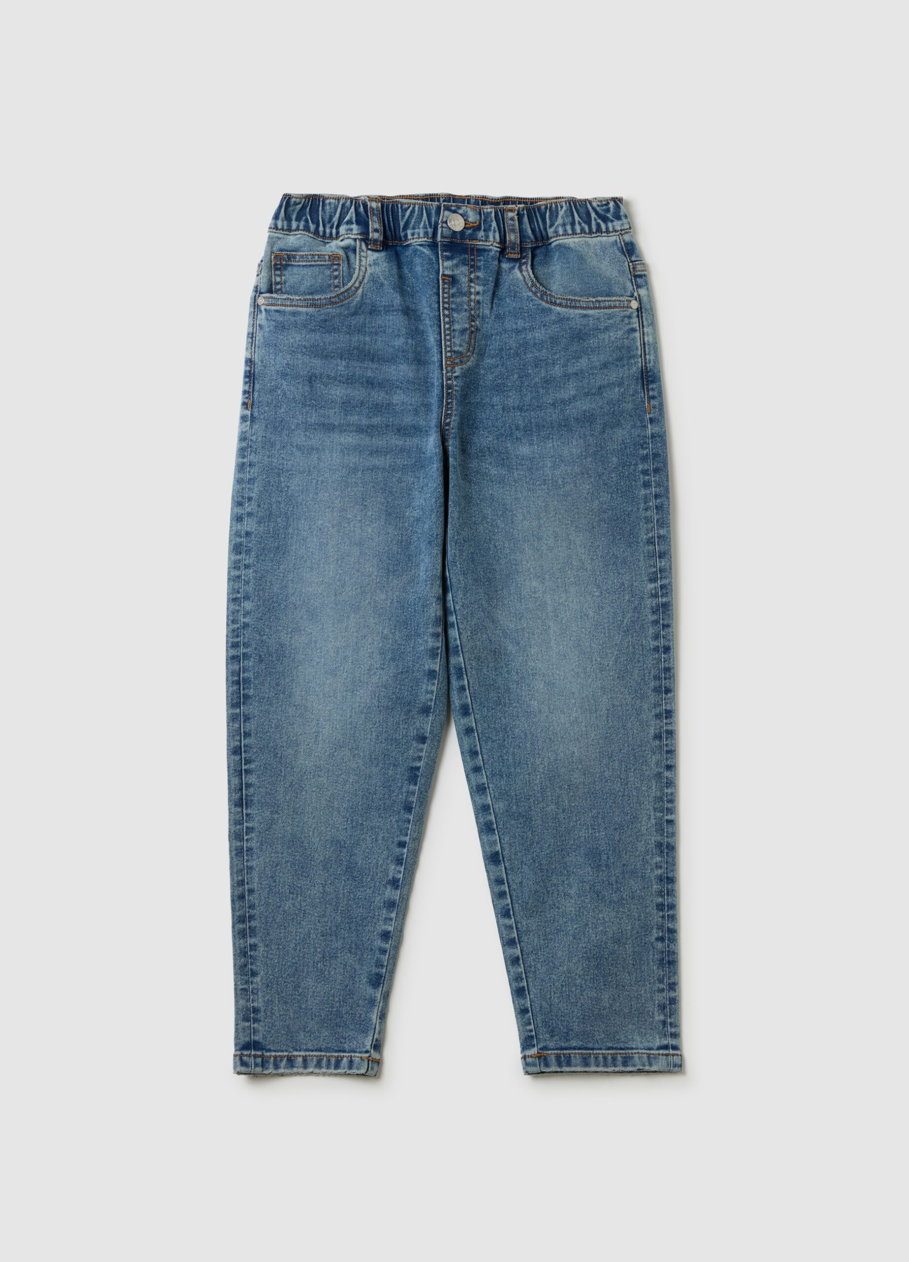 Le jean confortable dans le mélange de coton extensible avec un traitement et une confection. Taille élastique. Cinq poches. Fixation de fermeture éclair et de bouton.