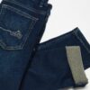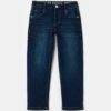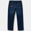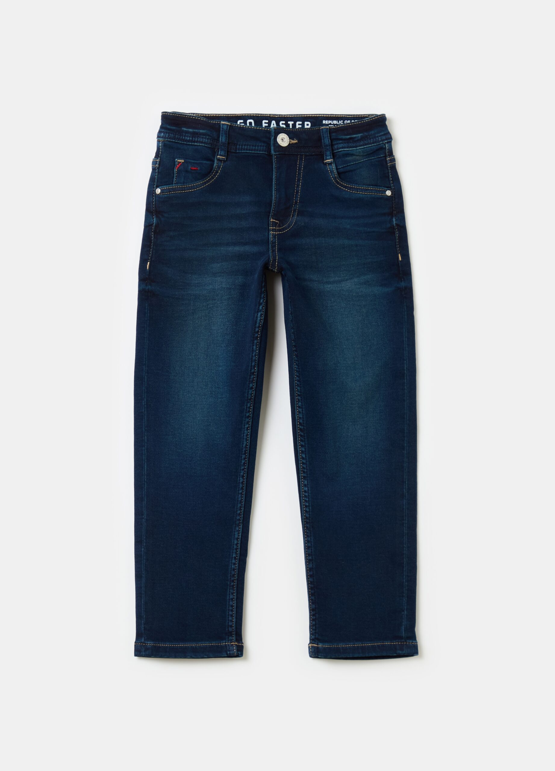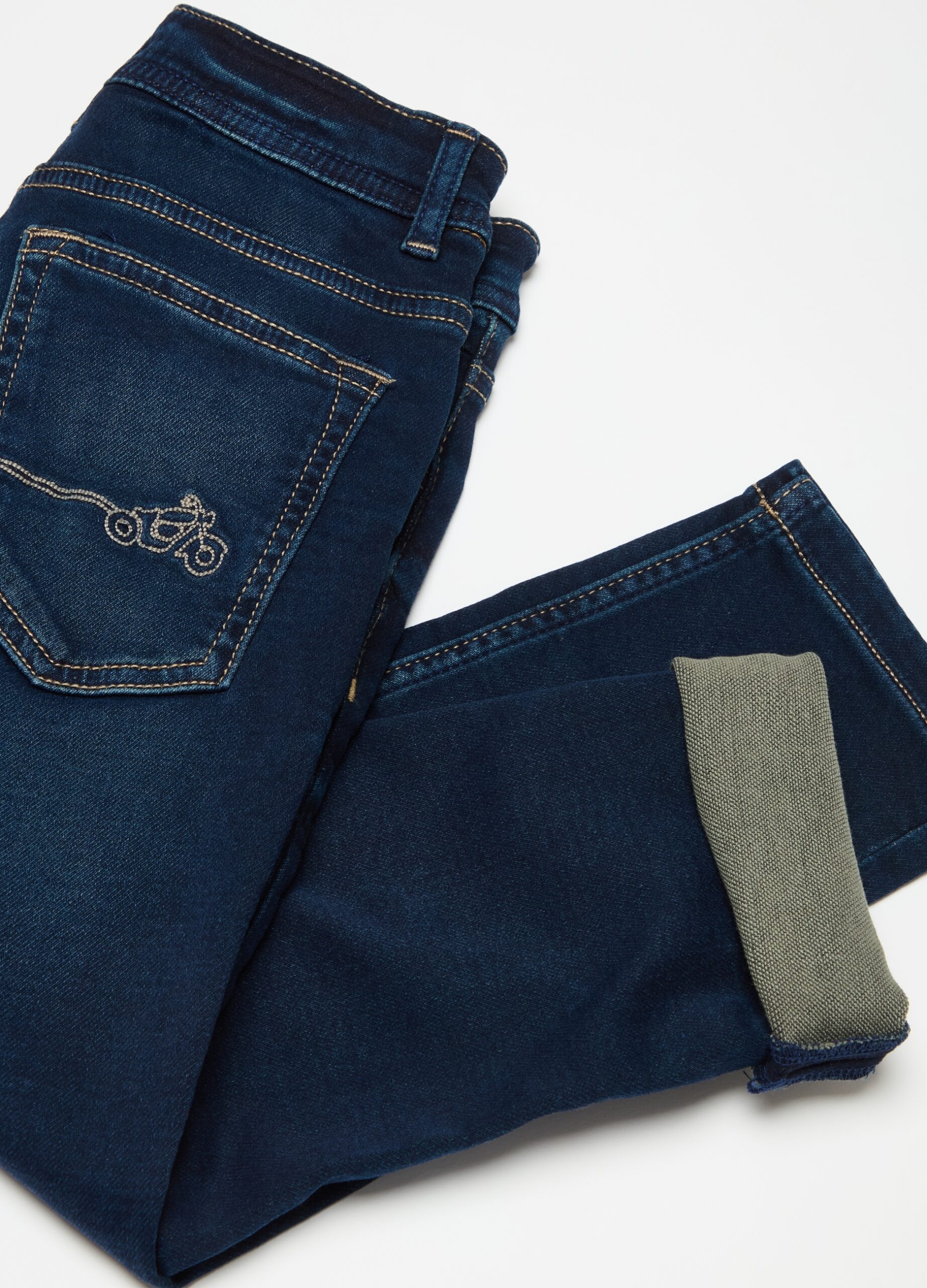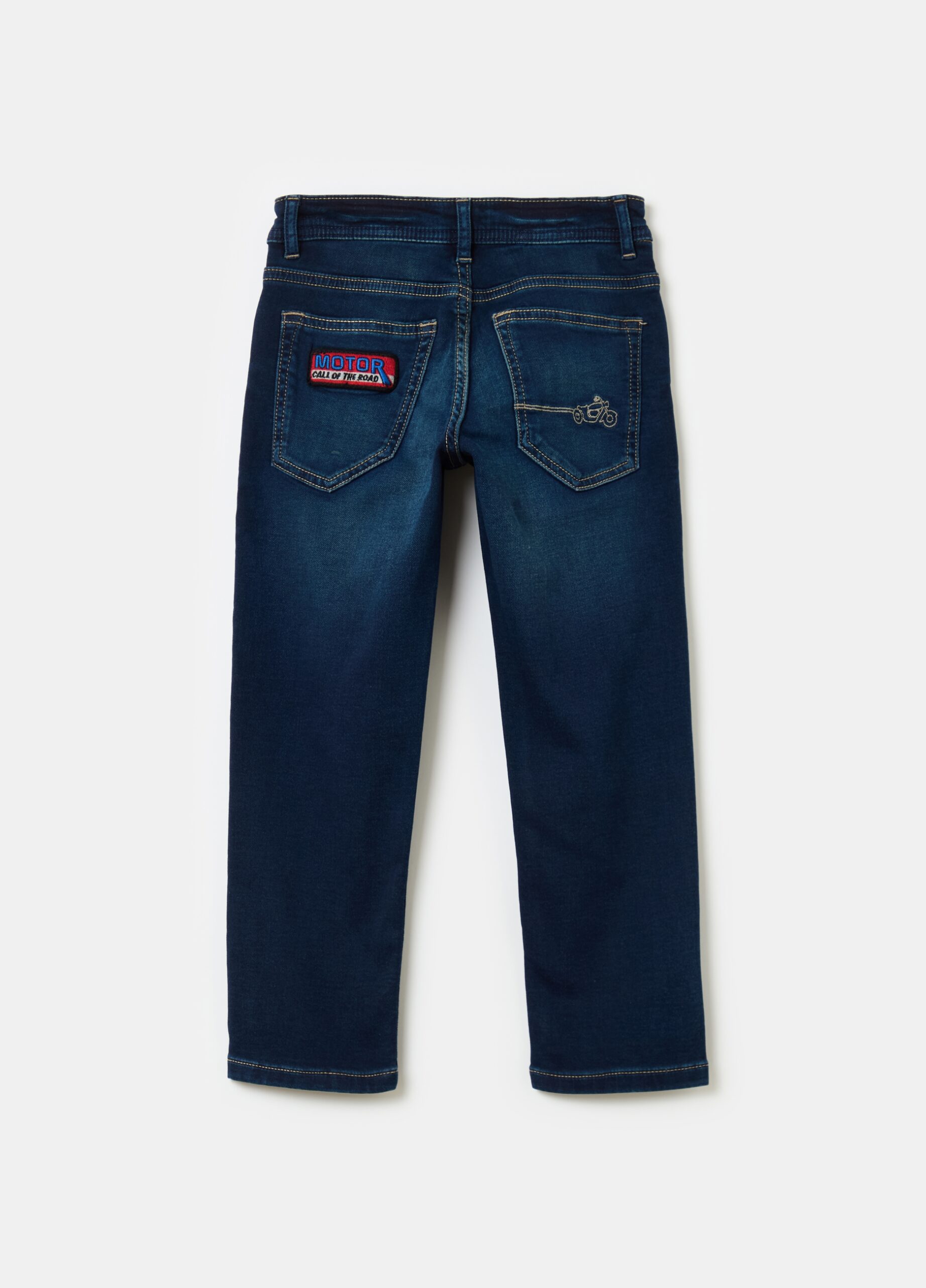 Jean coupe classique effet délavé en coton stretch. Cinq poches. Broderie motif moto et patch au dos. Fermeture zippée et boutonnée.