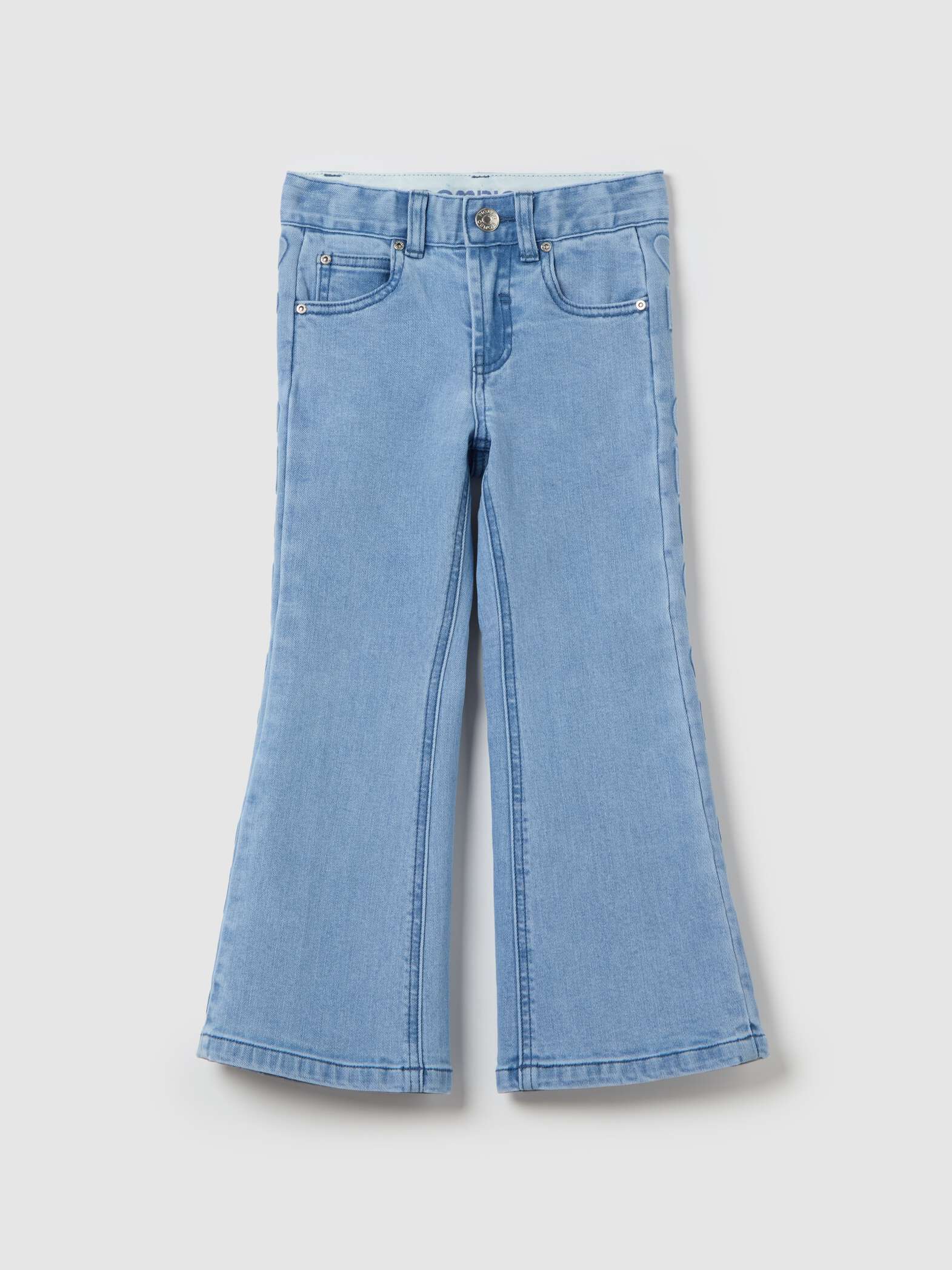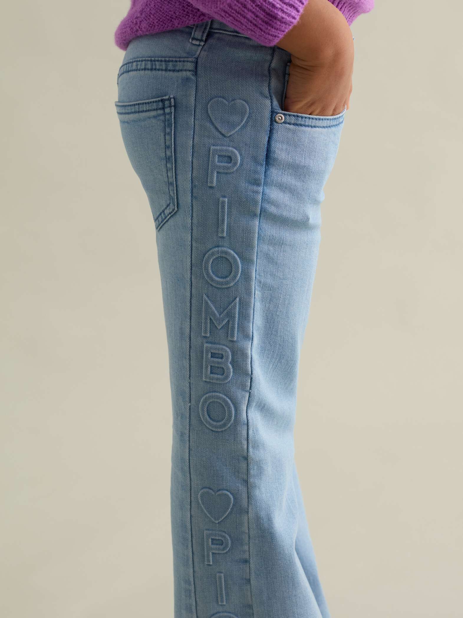Jean PIOMBO en coton stretch. Cinq poches. Bandes latérales avec imprimé logo et cœurs en relief. Fermeture par zip et bouton.