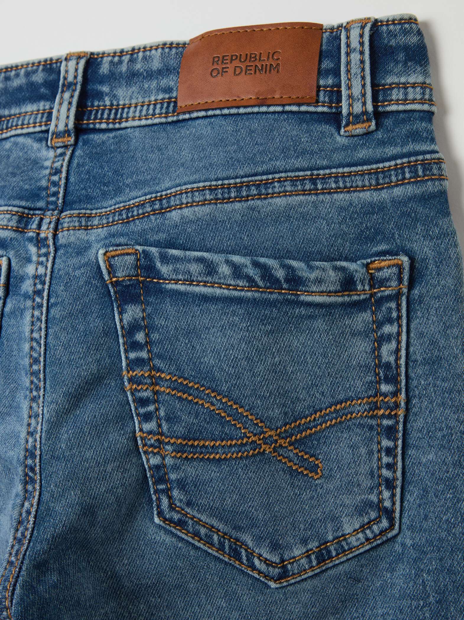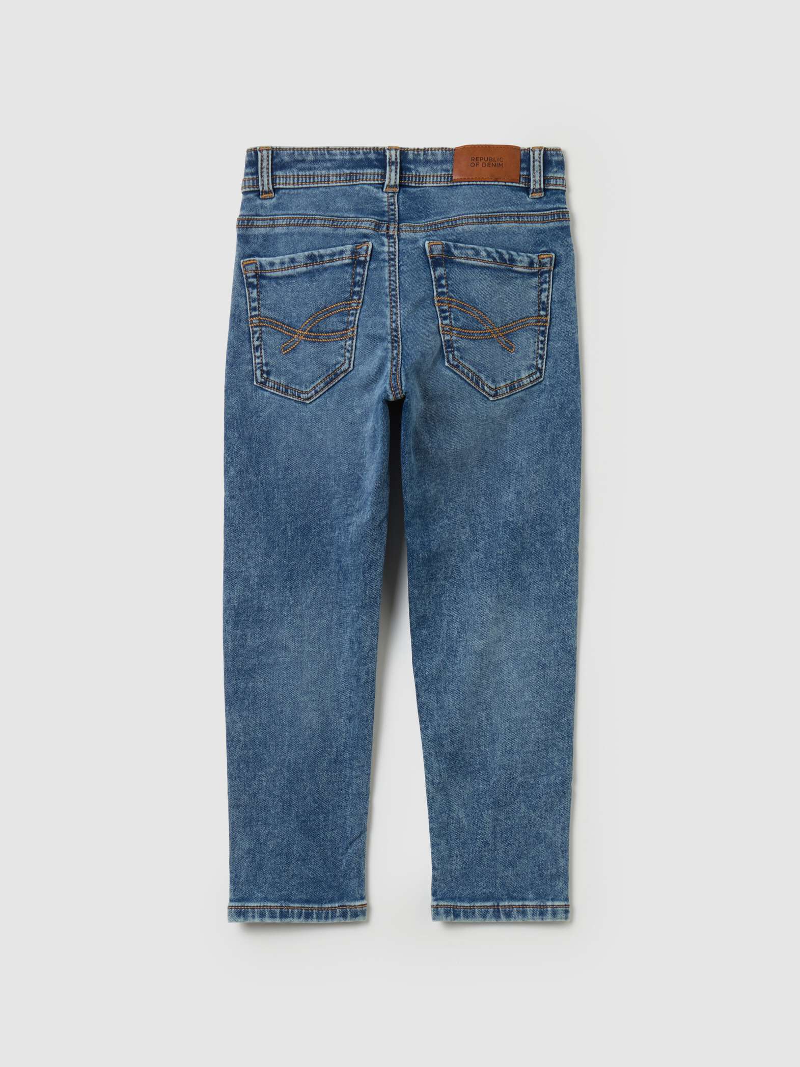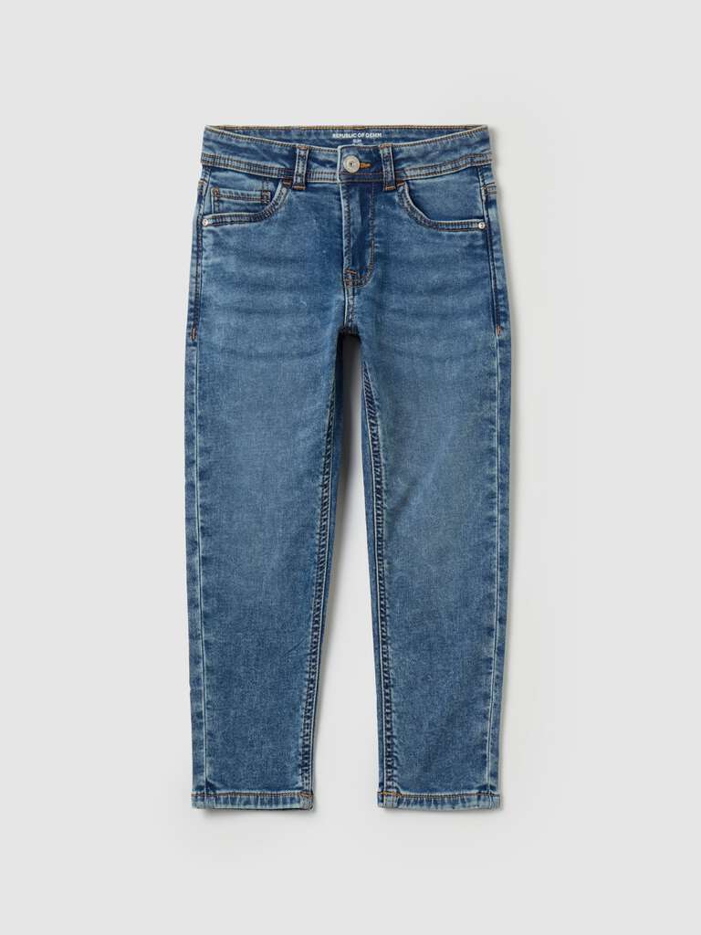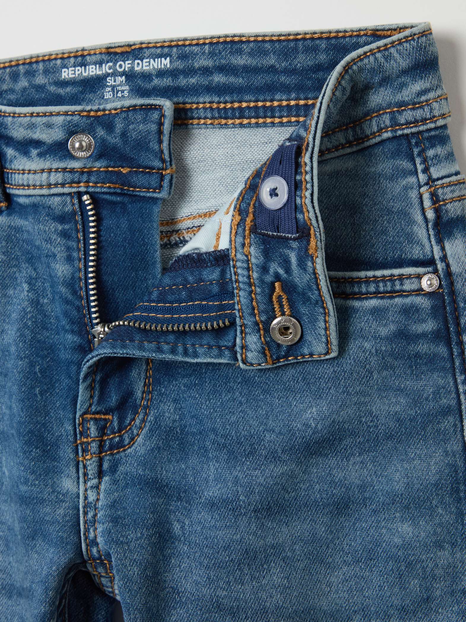 Jean slim effet décoloré en coton stretch. Réglage interne de la taille. Cinq poches. Fermeture par zip et boutons-pression.