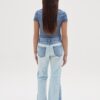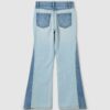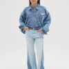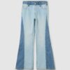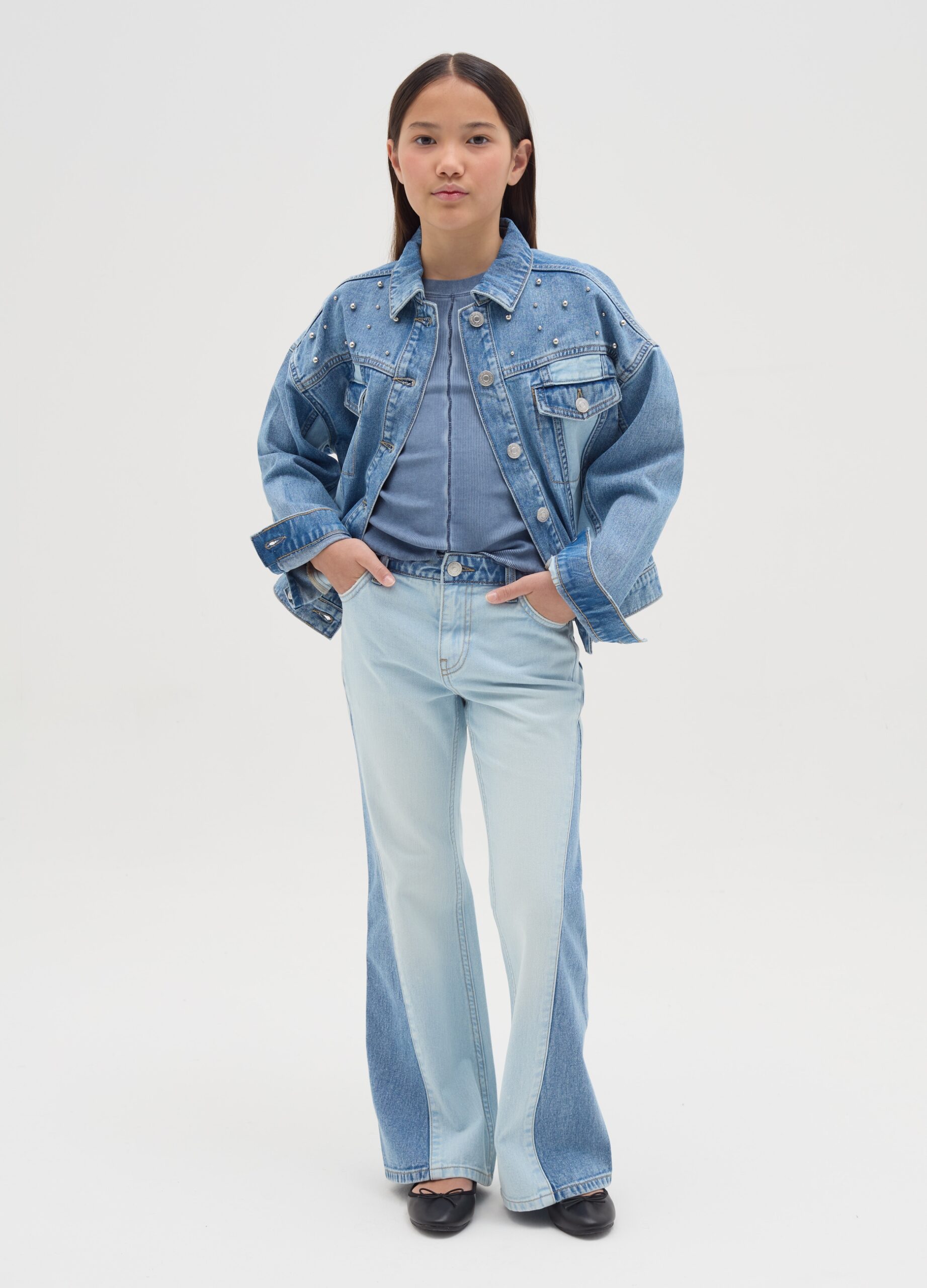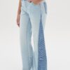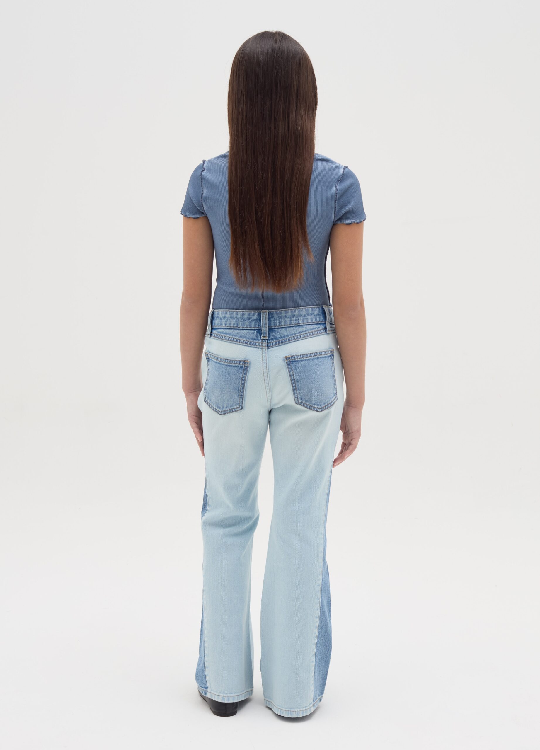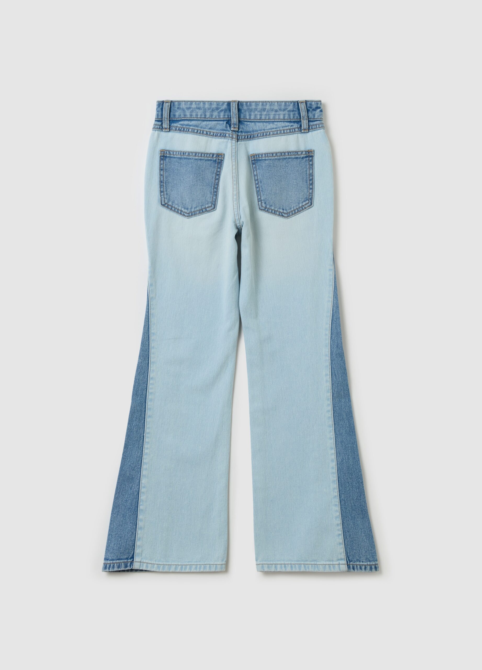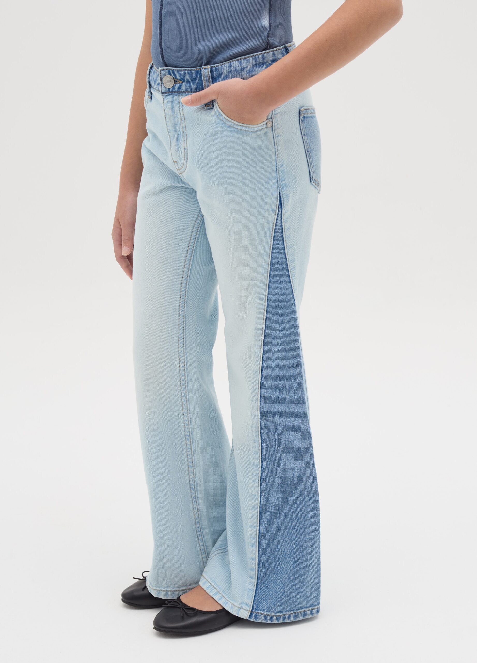 Jeans à deux tons avec des détails contrastés. Haute augmentation. Cinq poches. Fixation de fermeture éclair et de bouton.