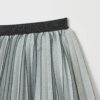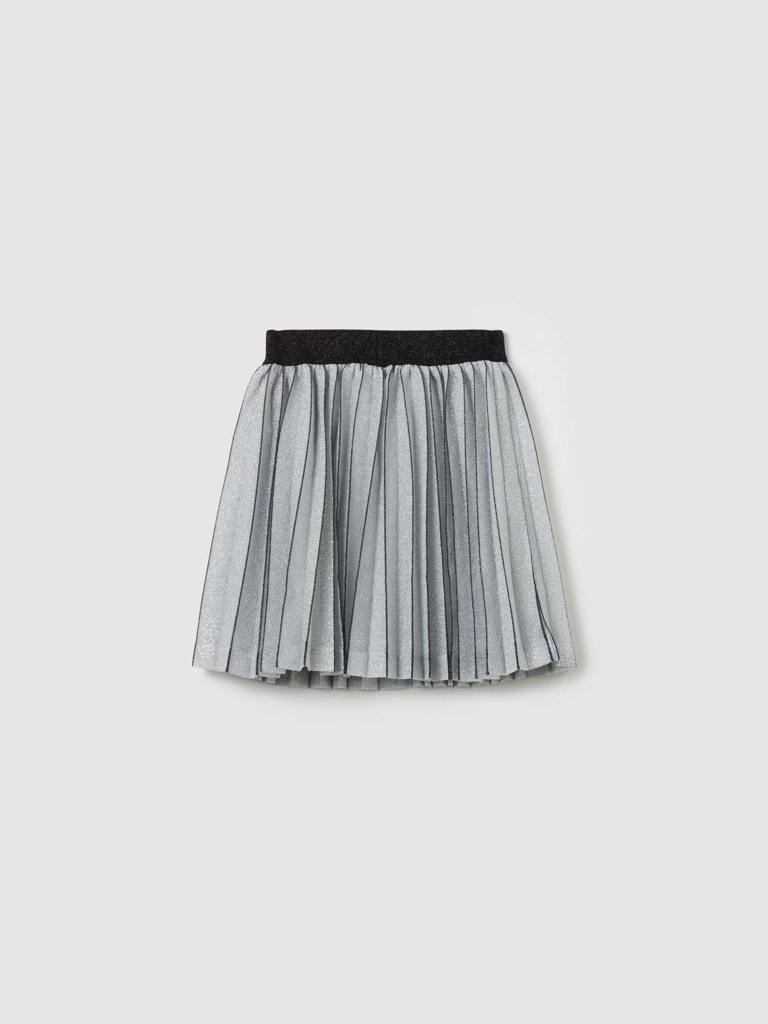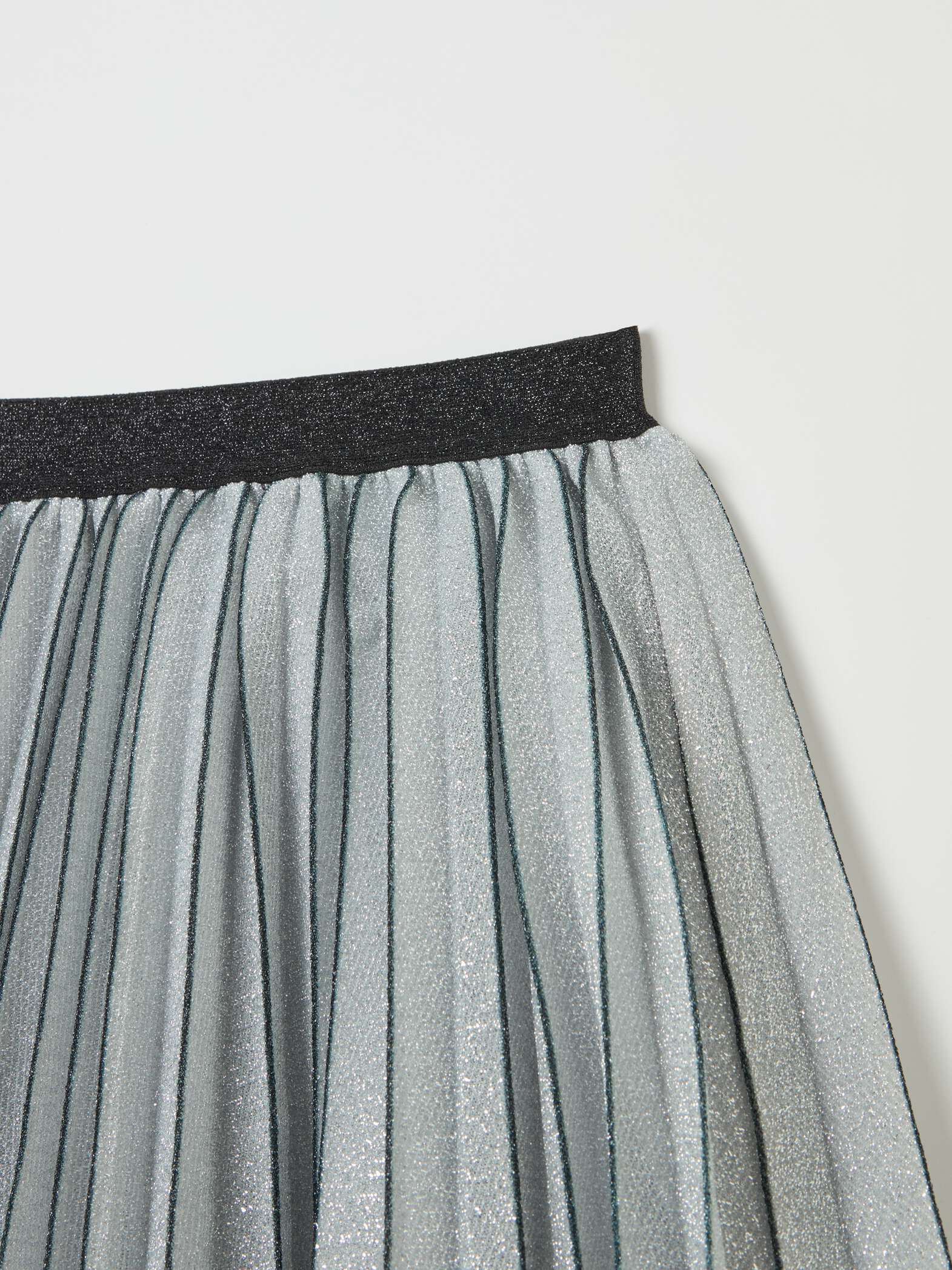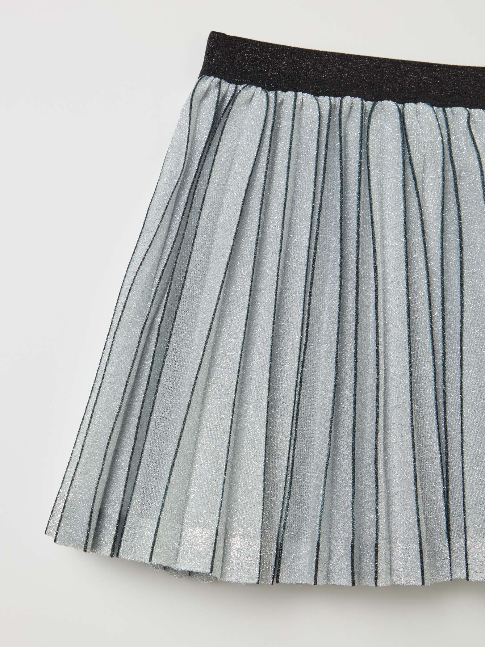 Jupe courte plissée en lurex. Elastique extérieur contrastant à la taille.