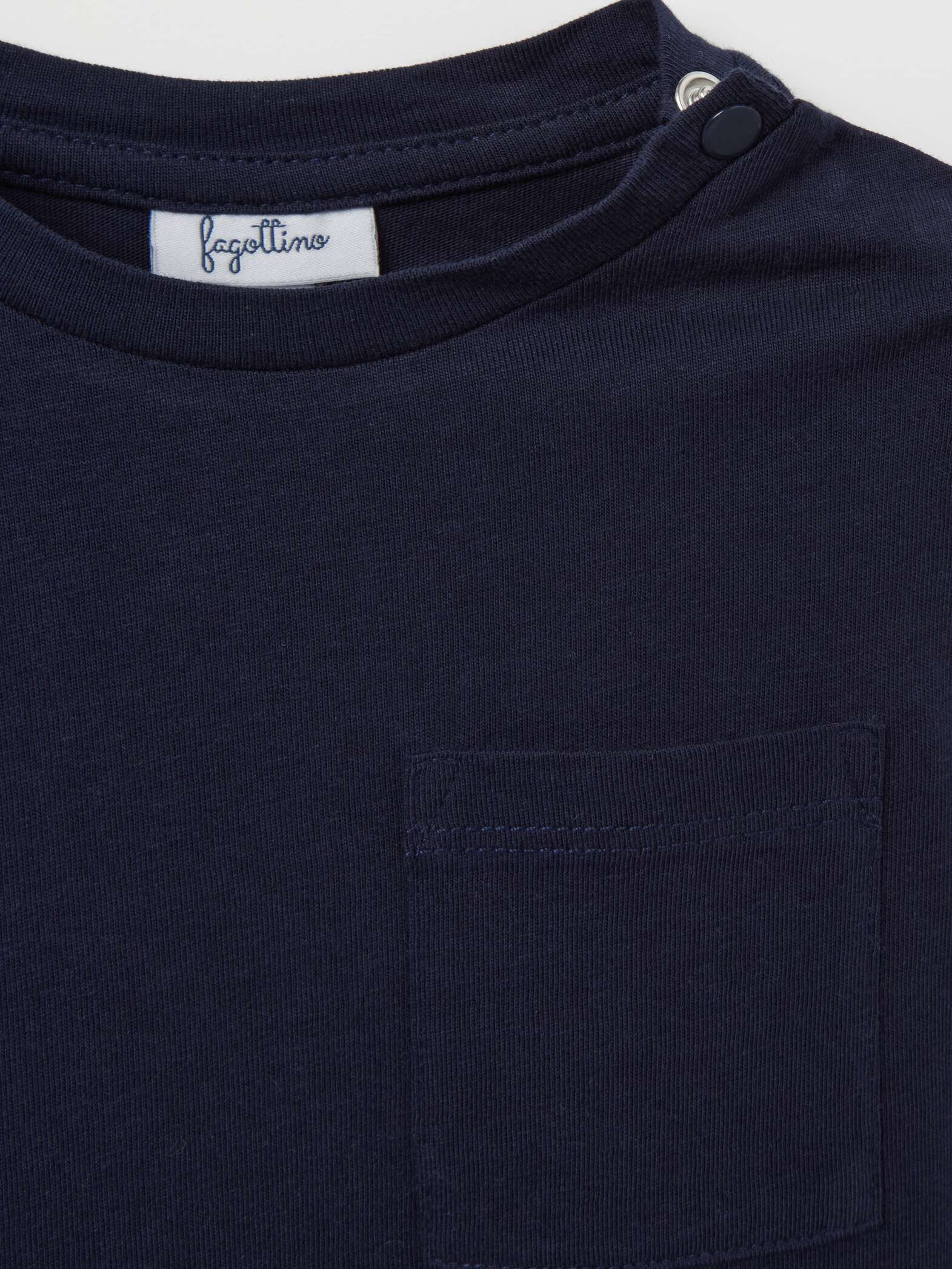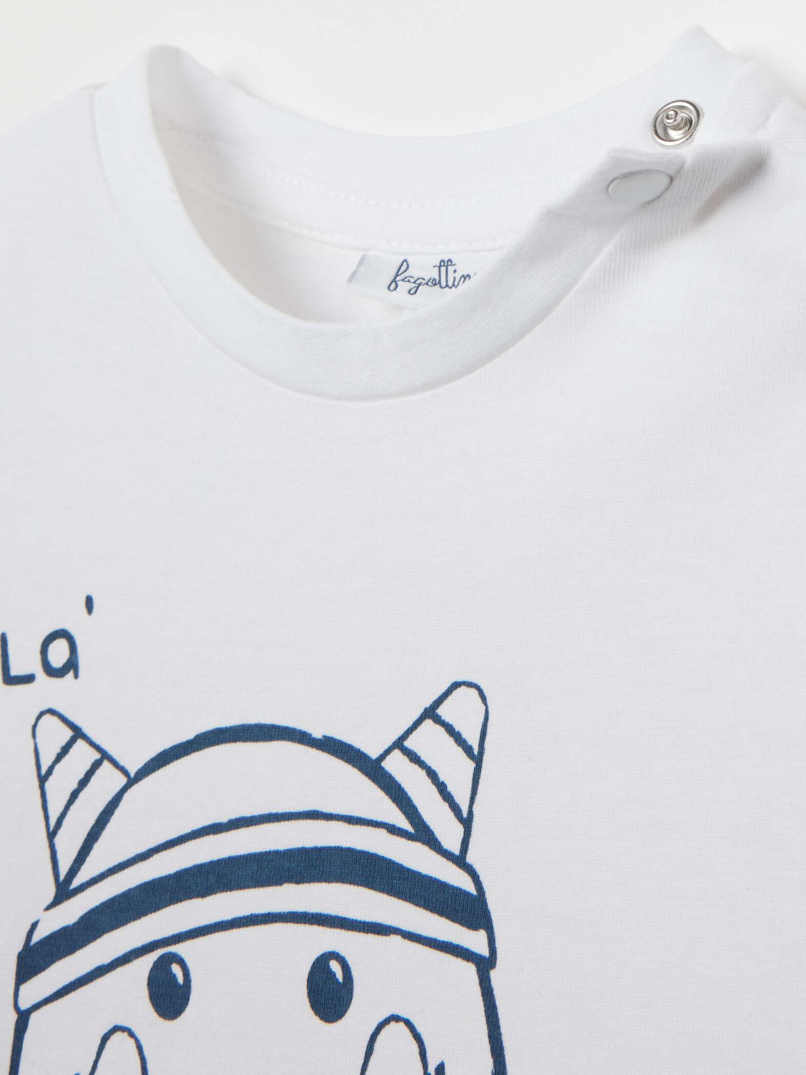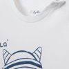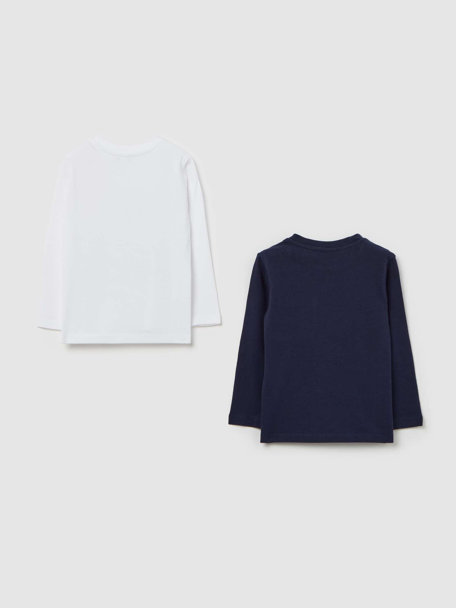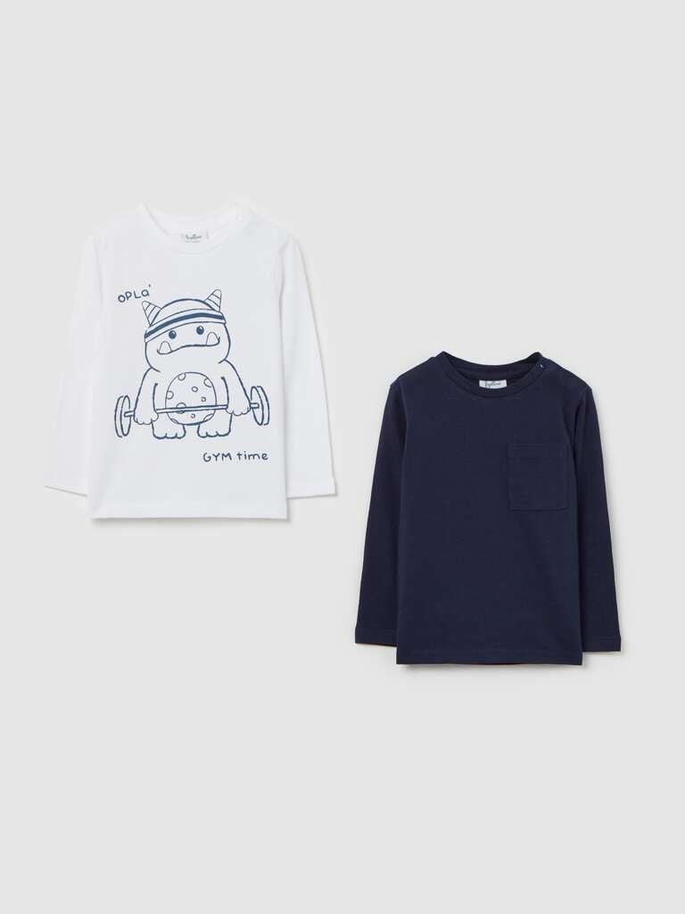 Lot de deux T-shirts 100% coton à manches longues. Col rond avec boutons pression sur l’épaule. Un T-shirt avec imprimé monstre bodybuilder sur le devant. Un T-shirt uni avec poche plaquée sur le côté.