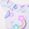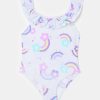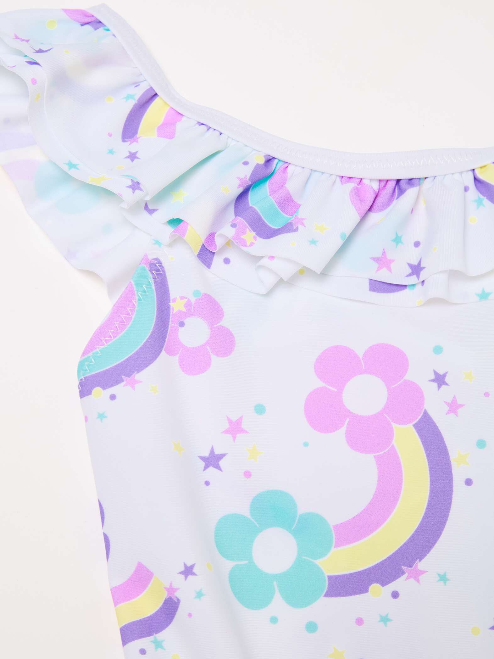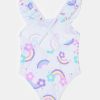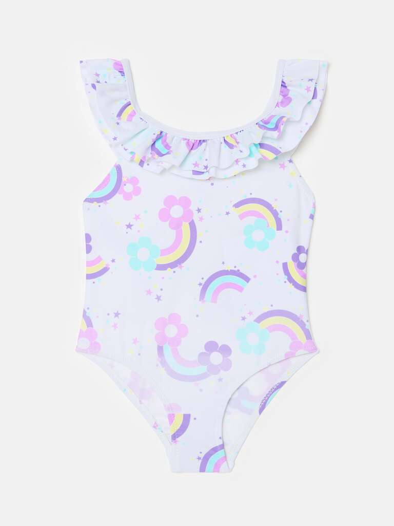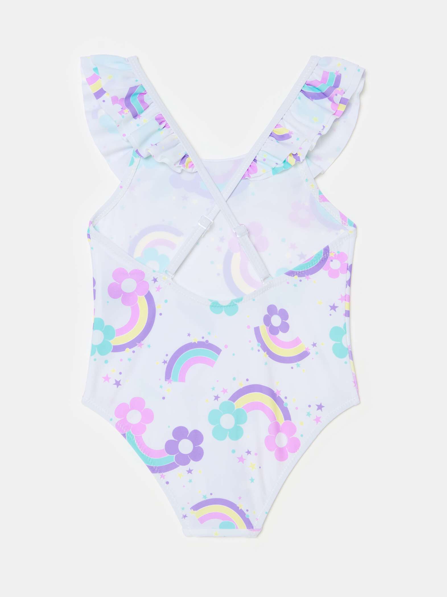 One-piece swimsuit in recycled polyamide. Neckline and crossover shoulder straps on the back with flounce. All-over flowers and rainbows print.