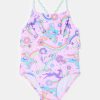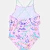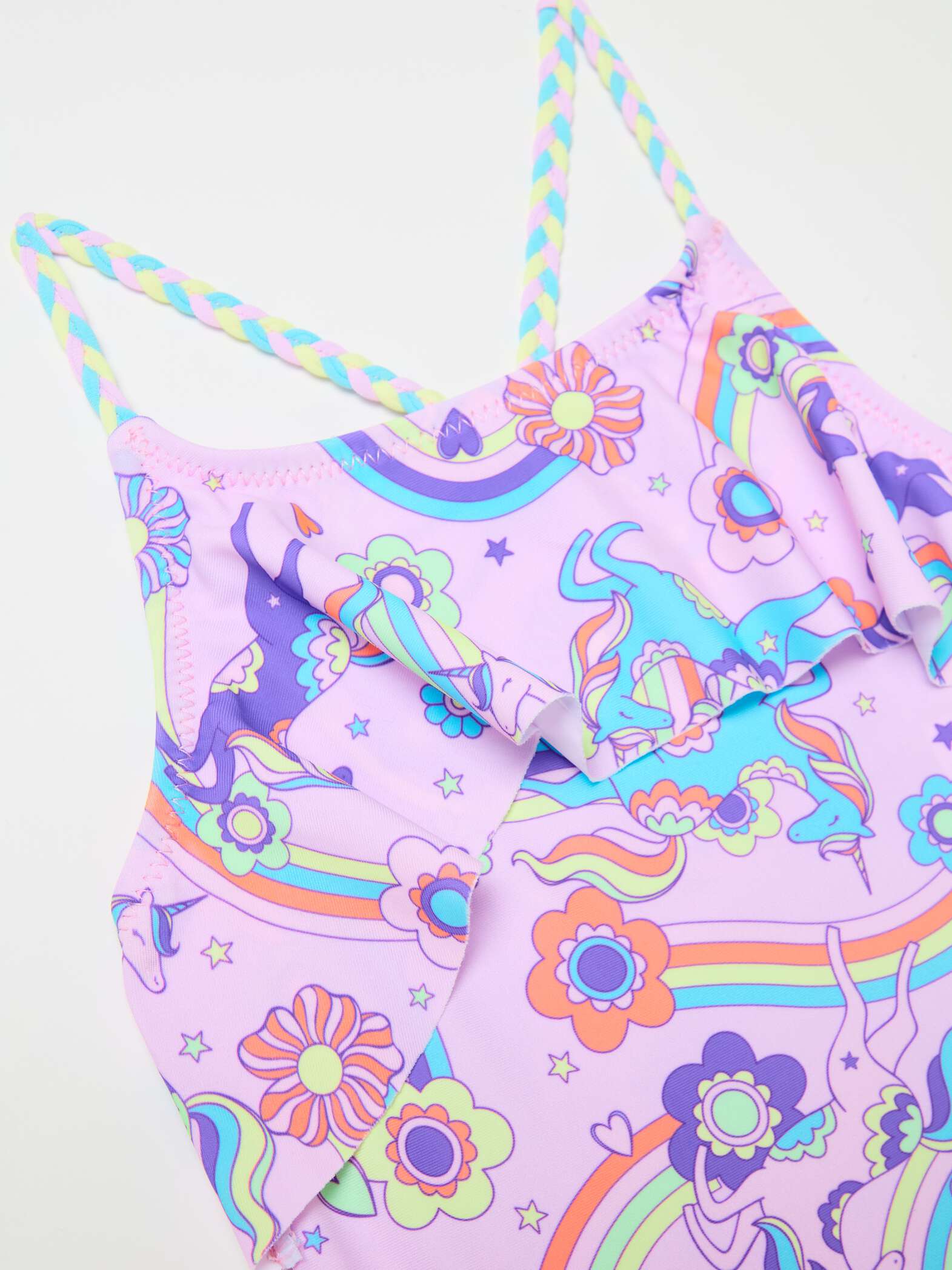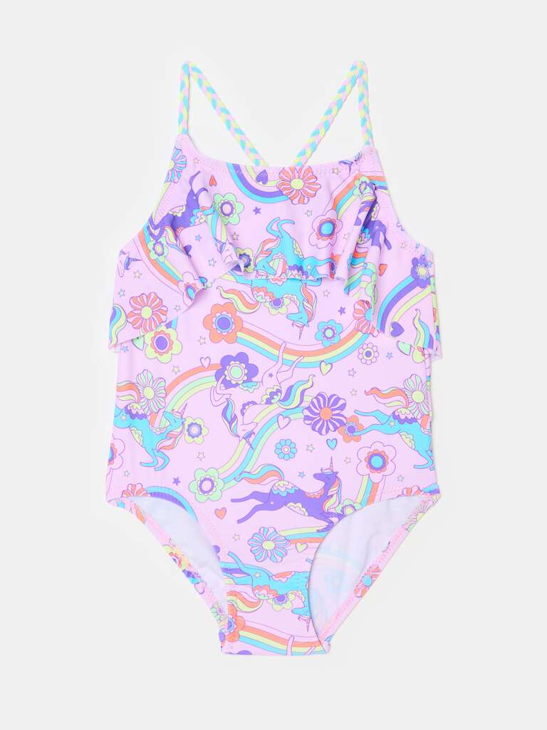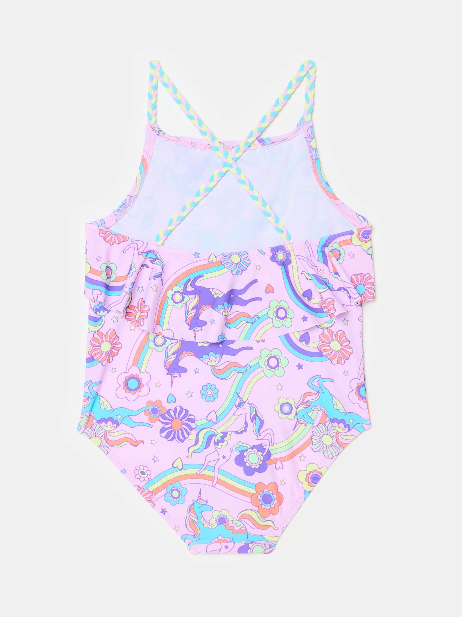 Maillot de bain une pièce à imprimé licornes et arcs-en-ciel avec fleurs all-over. Volant le long de l’encolure devant et dos. Bretelles croisées multicolores au dos. Cet article est fabriqué à partir de polyester recyclé.