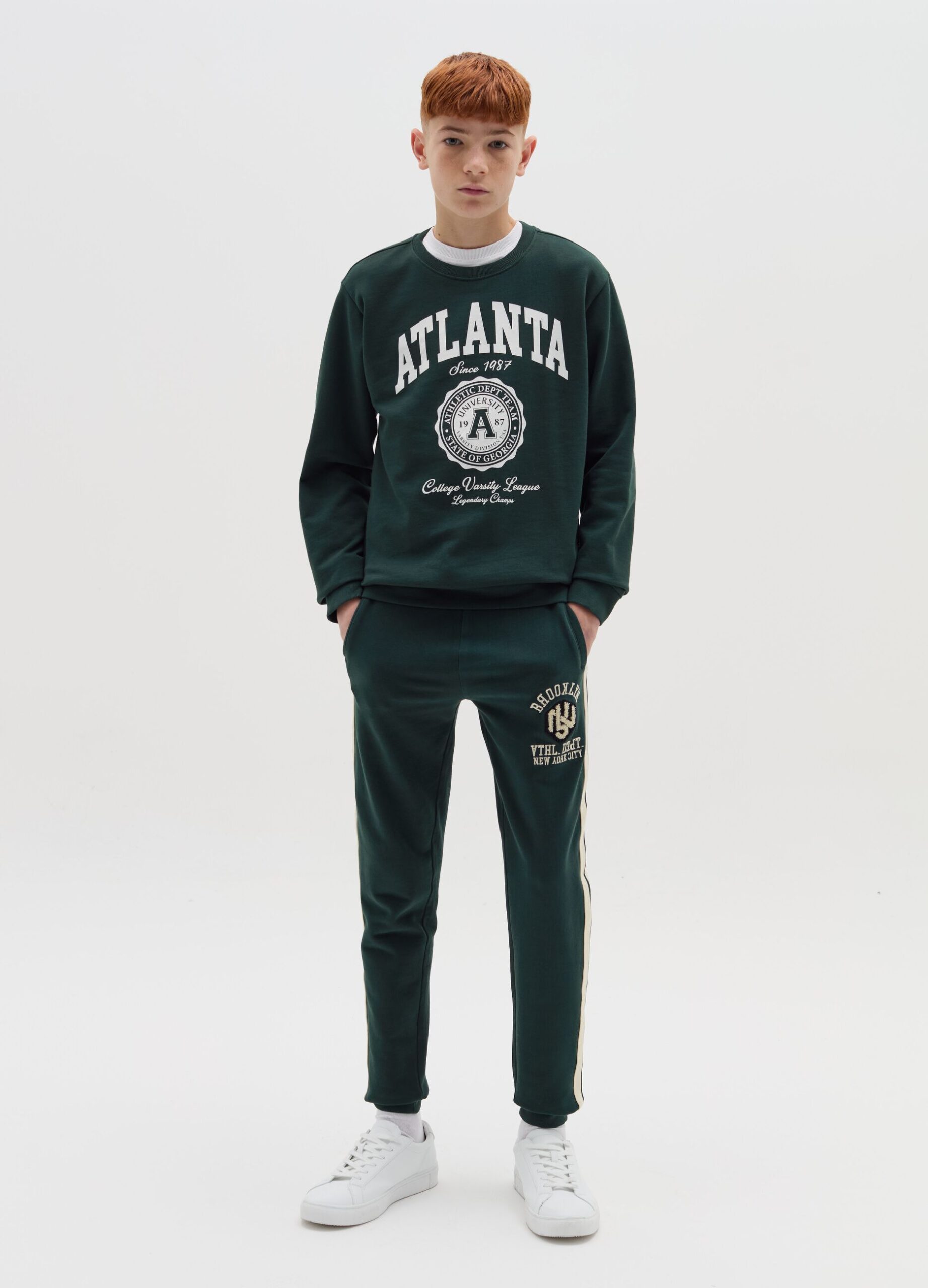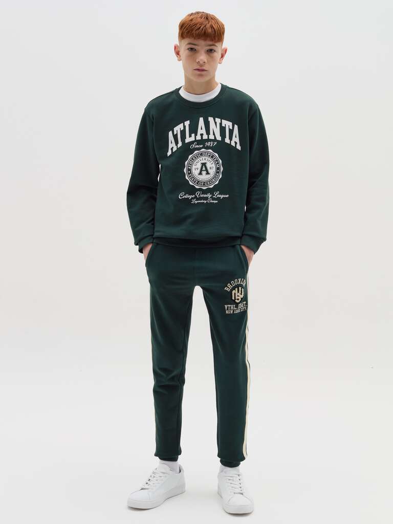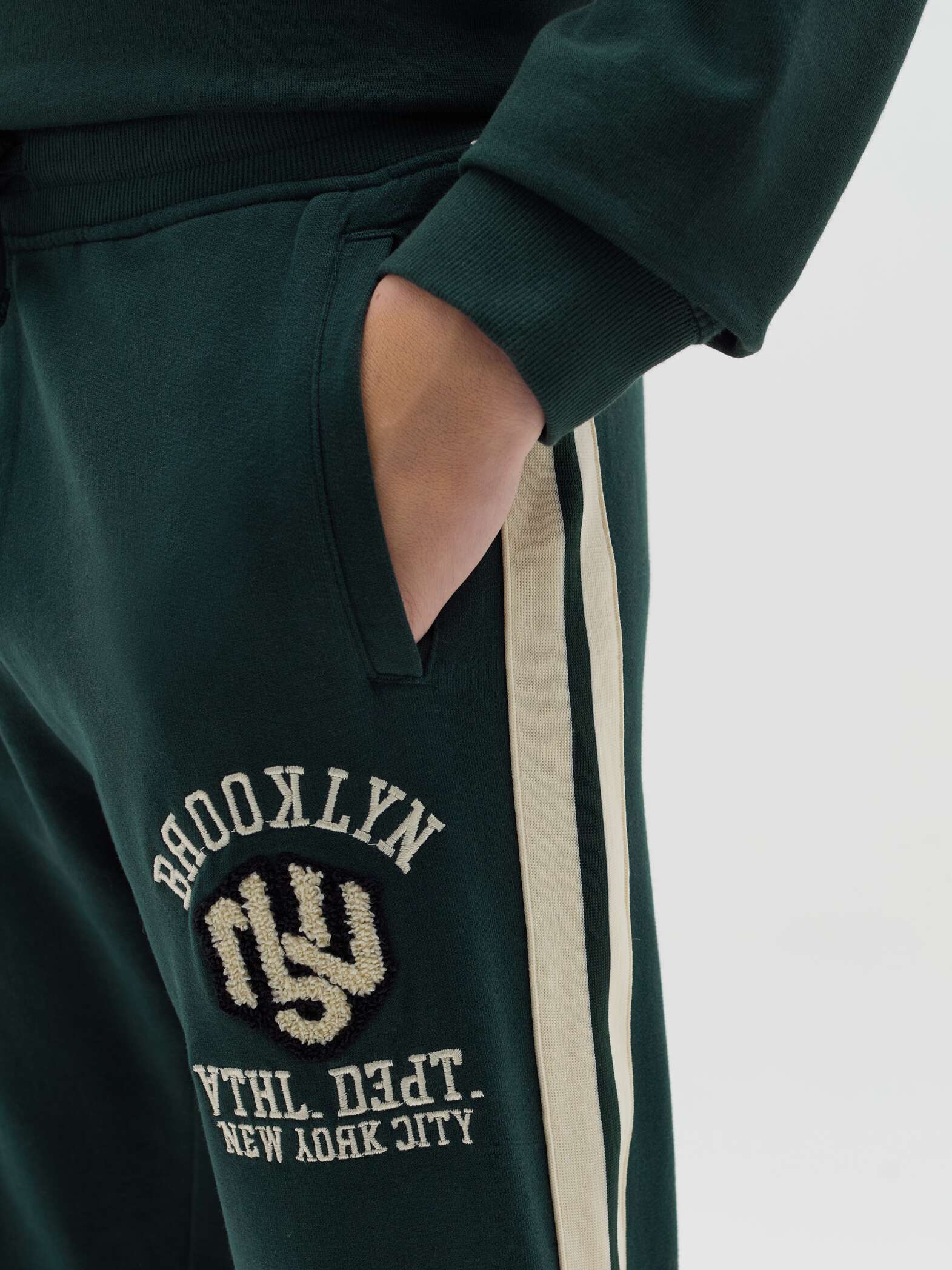Pantalon de jogging en molleton 100% coton avec cordon de serrage en ruban. Bandes latérales contrastées. Deux poches verticales et une poche plaquée au dos. Broderie lettrage « Brooklyn Athl. Dept. New York City » avec patch effet bouclé sur le côté. Bords côtelés aux chevilles.