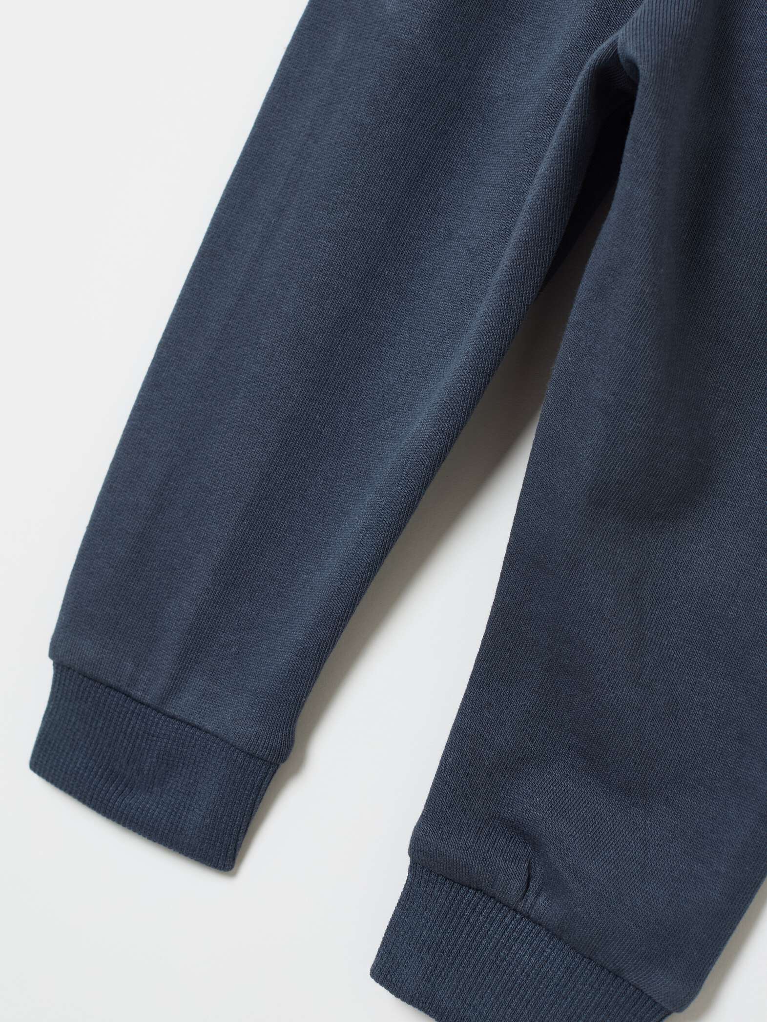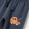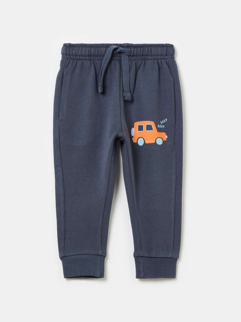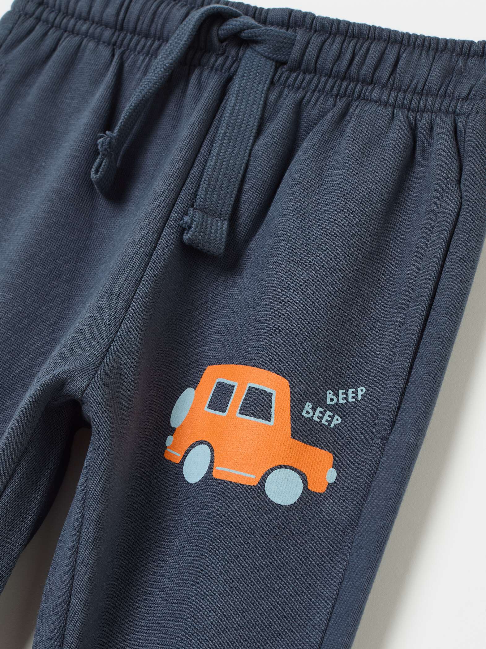 Pantalon de jogging en molleton 100% coton avec cordon de serrage en ruban. Imprimé voitures et lettrage sur le côté. Deux poches verticales. Bords côtelés aux chevilles.