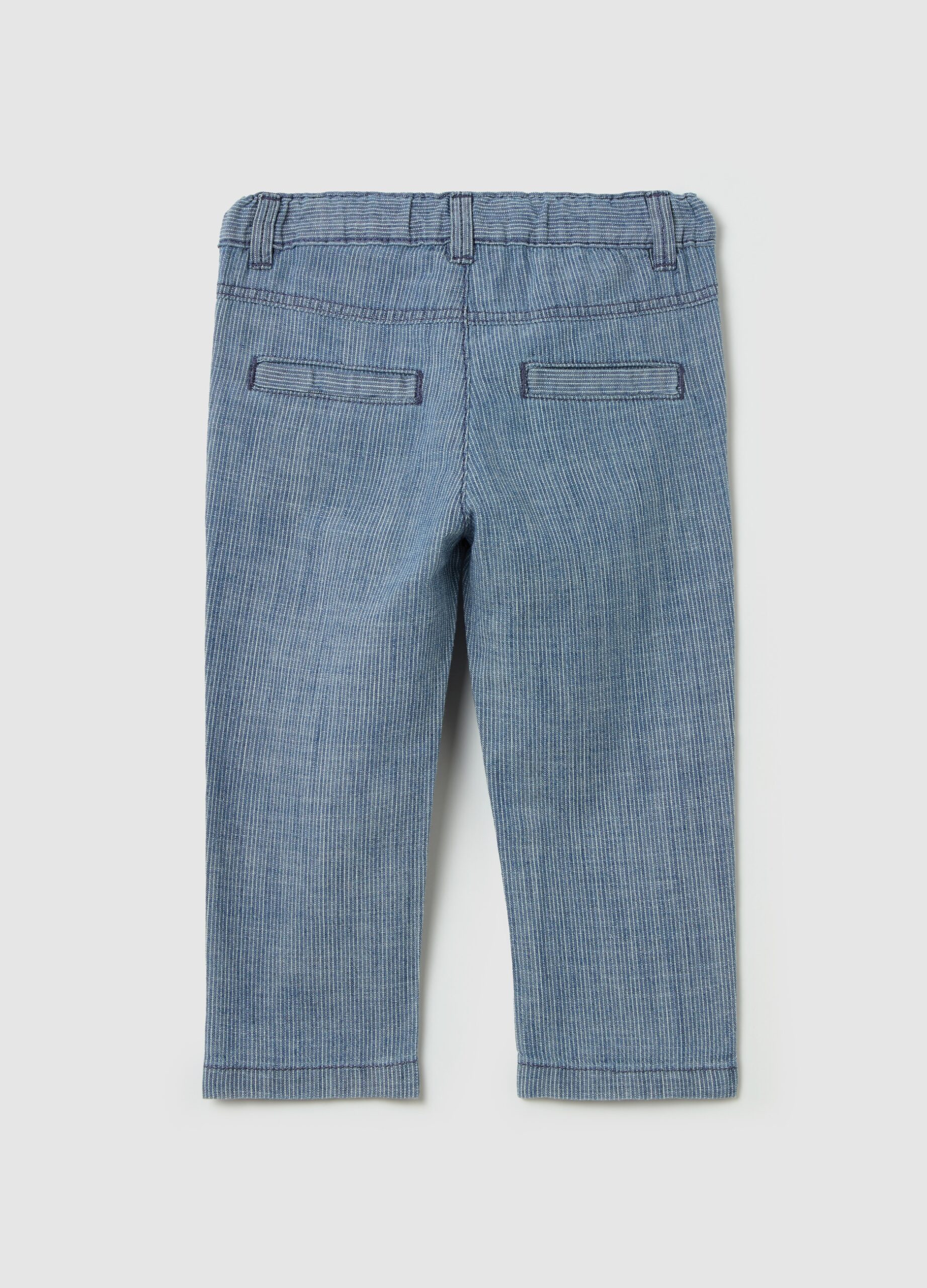 Pantalon 100% coton. Bande de taille élastique avec réglage intérieur. Deux poches inclinées et deux poches de Welt à l’arrière. Motif à rayures fin. Fixation des bouton.