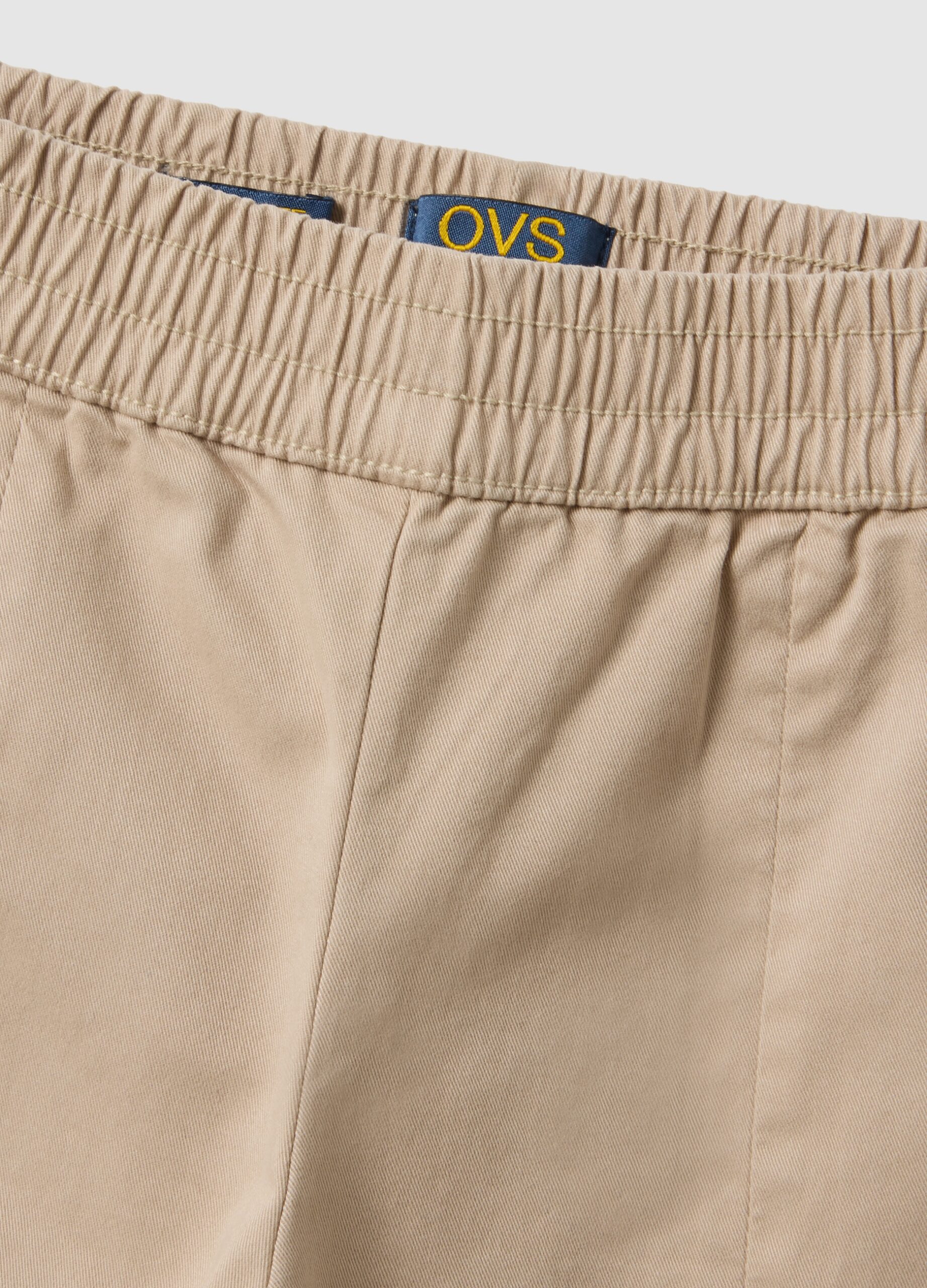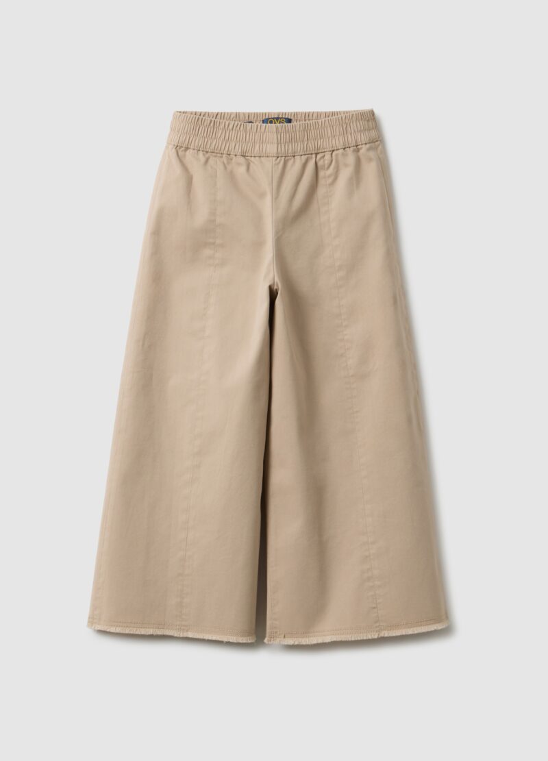Ce pantalon jupe-culotte beige de la ligne OVS KIDS est confectionné en coton stretch, assurant confort et liberté de mouvement aux filles de 3 à 10 ans. La couleur beige et le design moderne avec un bord frangé offrent un look jeune, parfait pour les saisons printemps et été.
