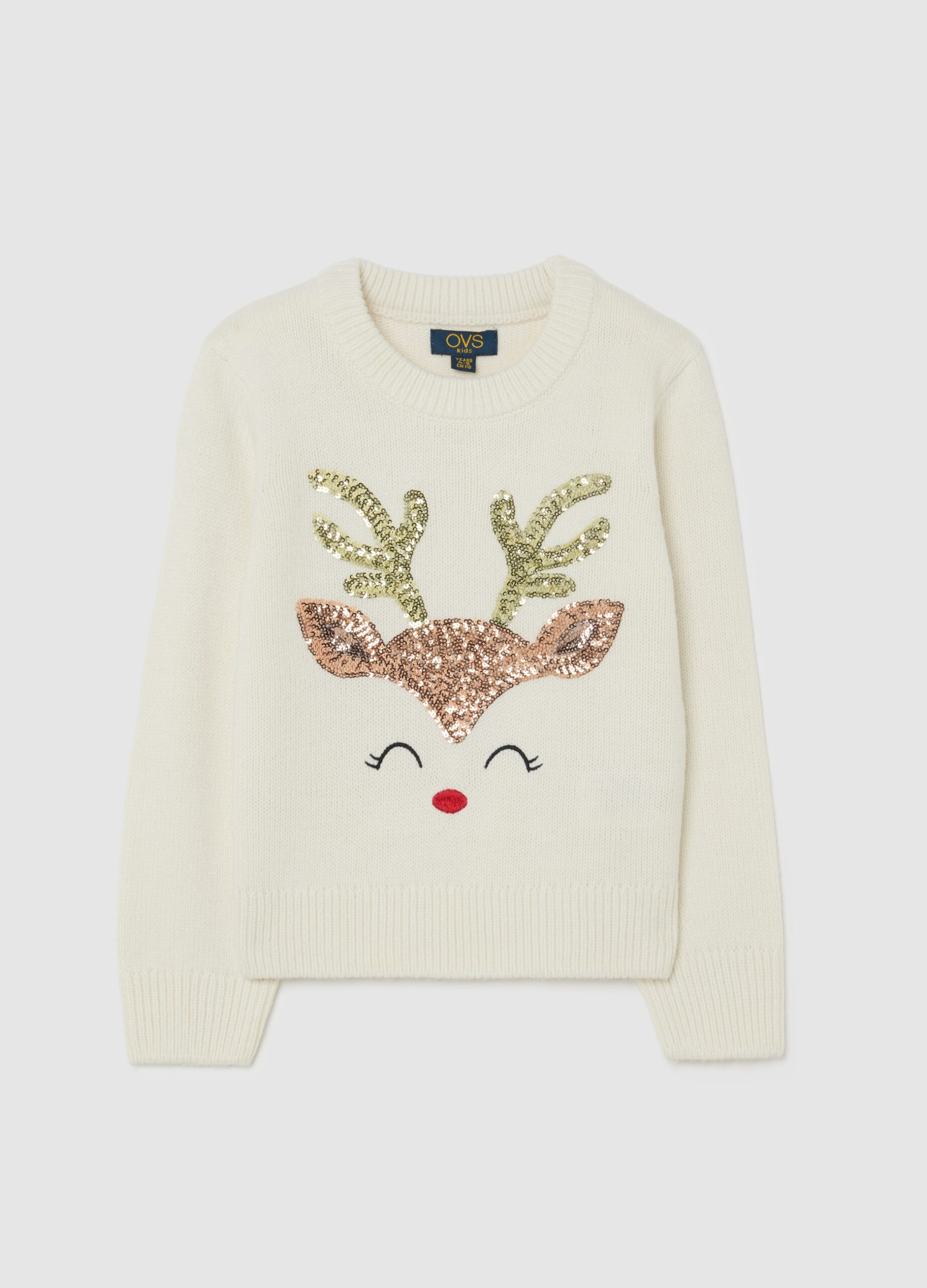 Ce pull blanc de la ligne OVS KIDS est destiné aux filles de 3 à 10 ans et présente un design amusant avec un renne pailleté qui égaye les journées froides. Il apporte chaleur et confort avec sa coupe régulière et ses manches longues, parfait pour la saison hivernale. Idéal pour ceux qui recherchent un look vif et confortable pendant les mois froids, rendant chaque tenue spéciale.