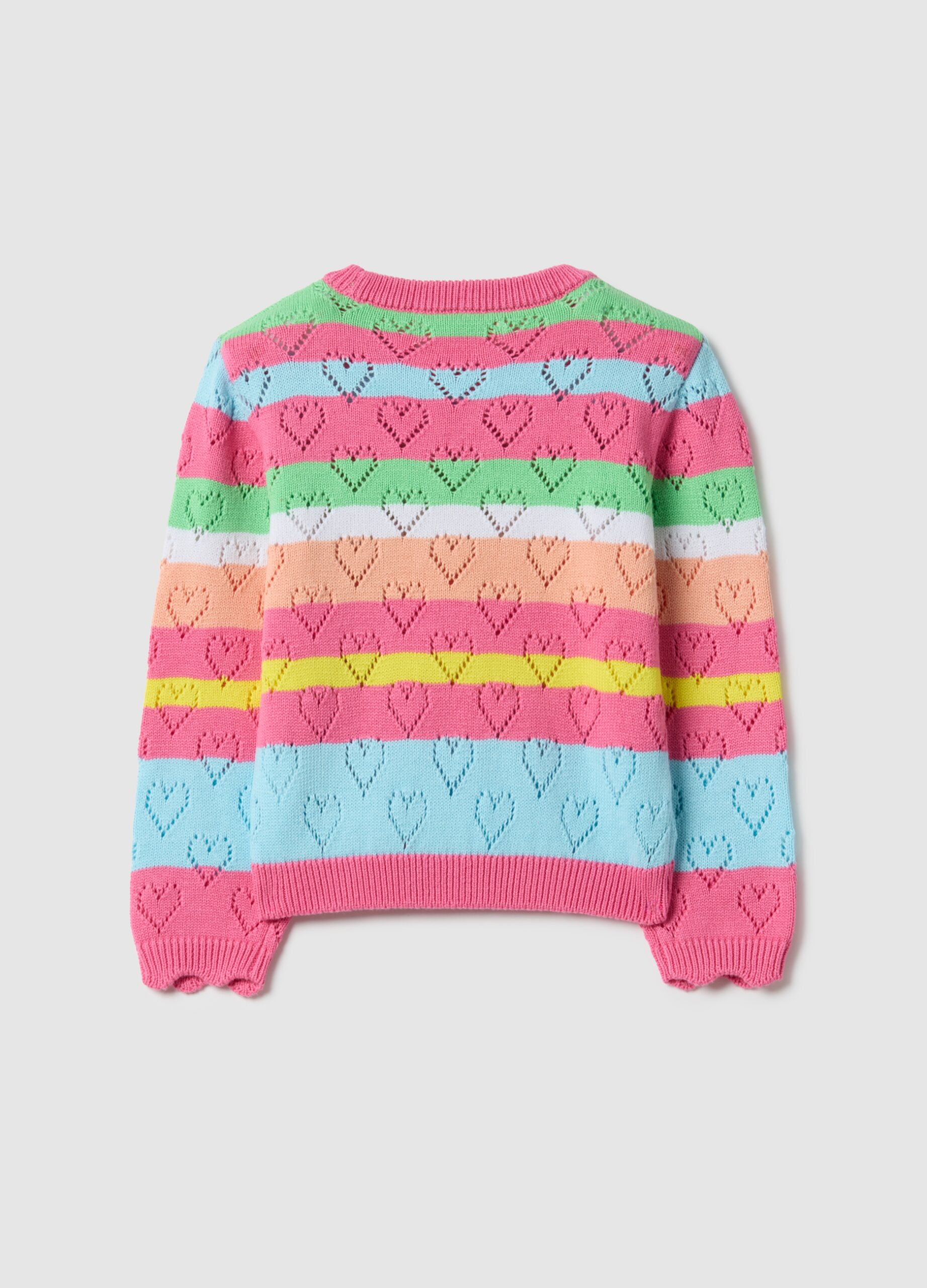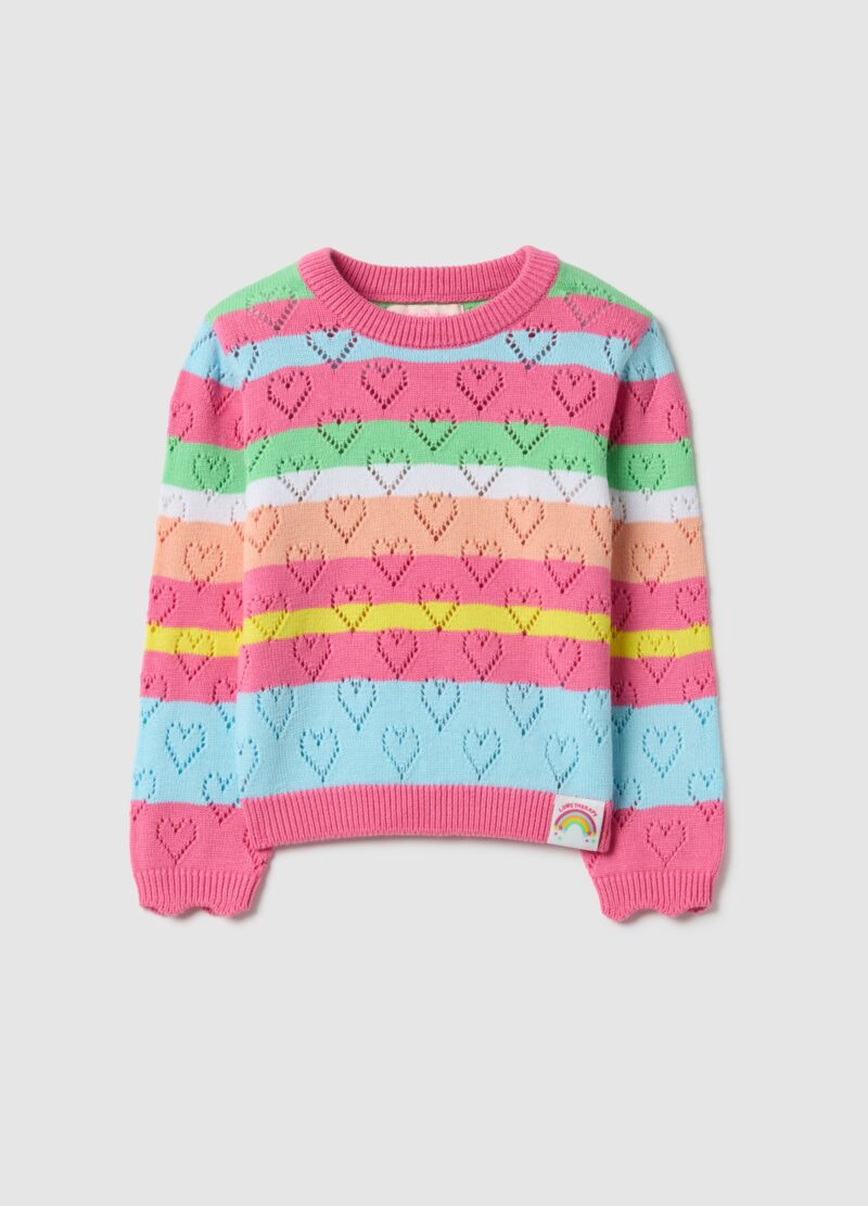 Ce pull vibrant en pur coton à rayures multicolores de la ligne ENFANT OVS est conçu pour les filles de 3 à 10 ans. Les adorables motifs en forme de cœur ajoutent une touche joyeuse à la garde-robe printanière. La coupe classique, avec un col ras du cou et des manches longues, assure confort et douceur, ce qui la rend idéale pour toutes les occasions.