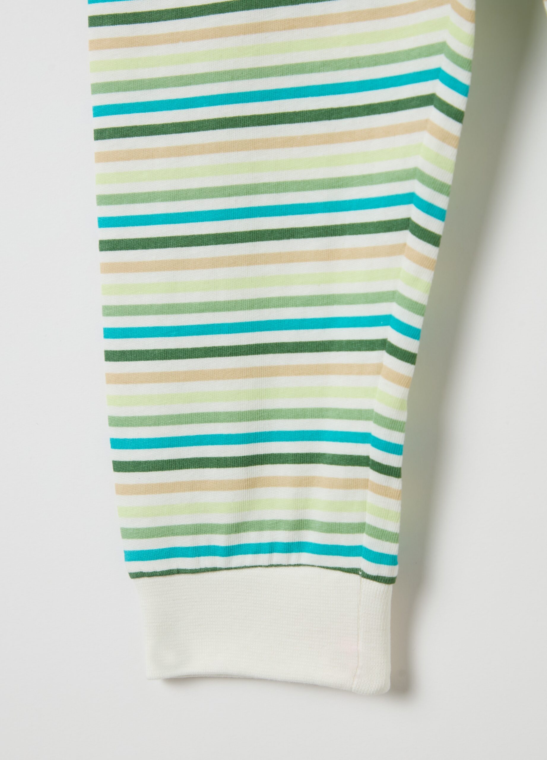 Pyjama long en 100% coton biologique. Haut à col rond et boutons pression sur l’épaule. Imprimé dinosaures et inscription »Living the wild life » sur le devant. Pantalon à motif rayures multicolores et taille élastiquée.