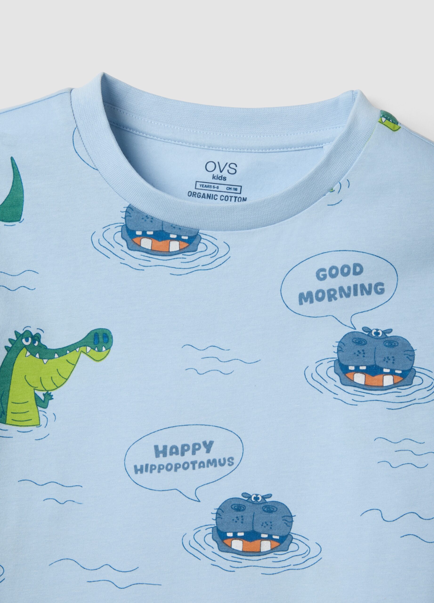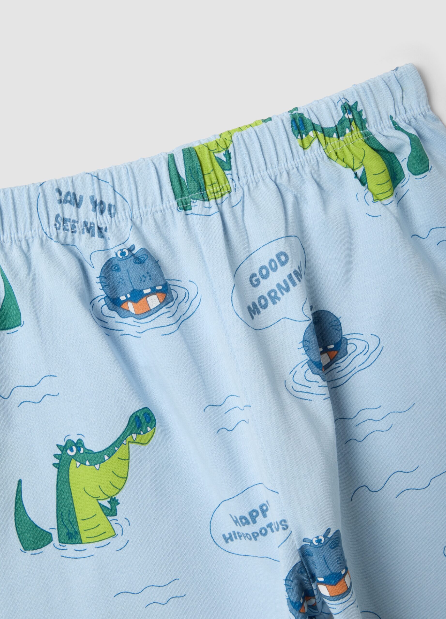 Le pyjama bleu ciel de la ligne OVS KIDS est conçu pour les enfants de 3 à 8 ans. Fabriqué en pur coton biologique, il assure un sommeil confortable et agréable. Orné d’imprimés ludiques d’hippopotames et de crocodiles, il offre du confort avec sa coupe Regular Fit. Parfaits pour les chaudes soirées d’été, ils allient style et praticité pour le repos des enfants avec un tissu doux et respirant.
