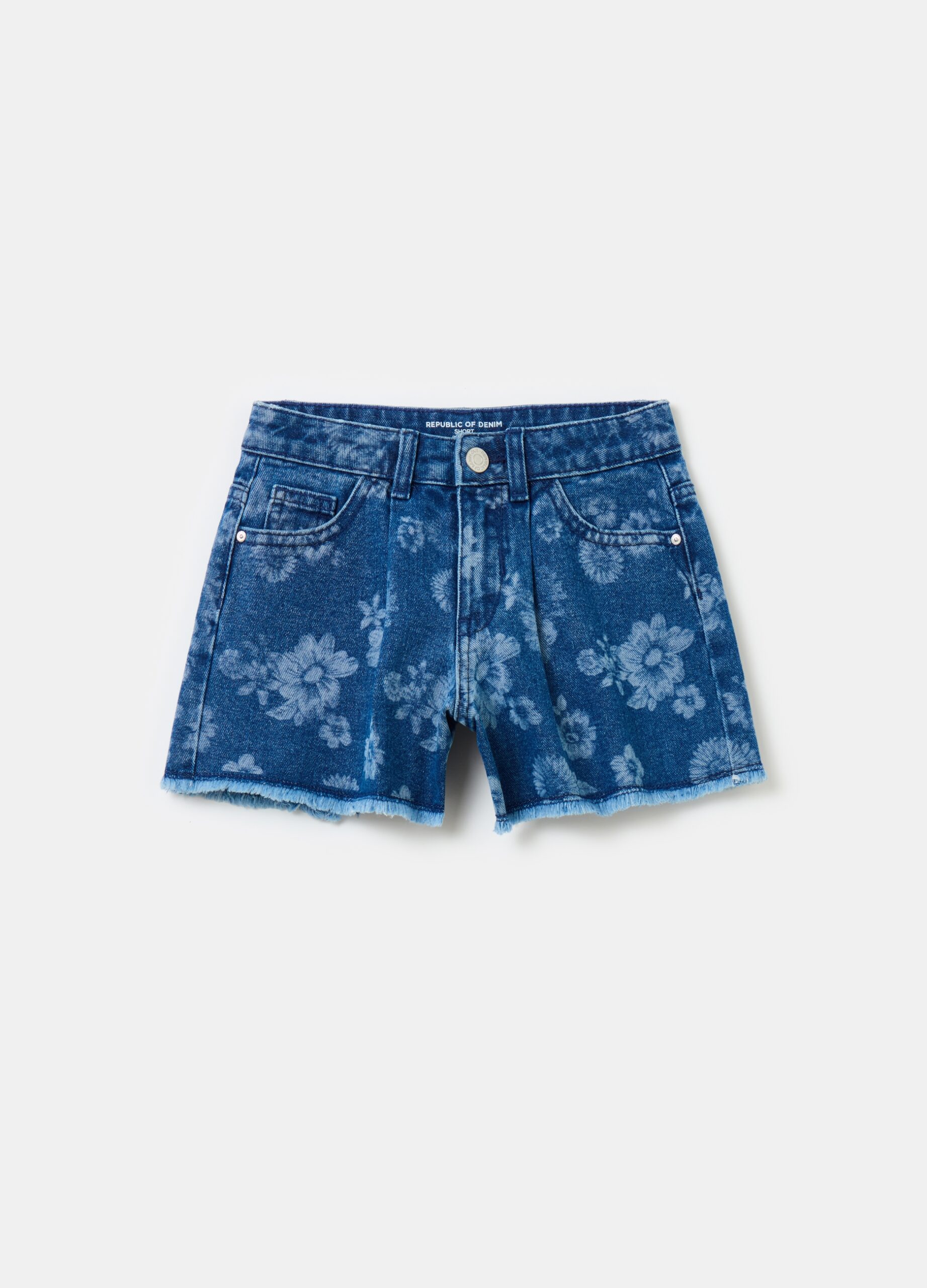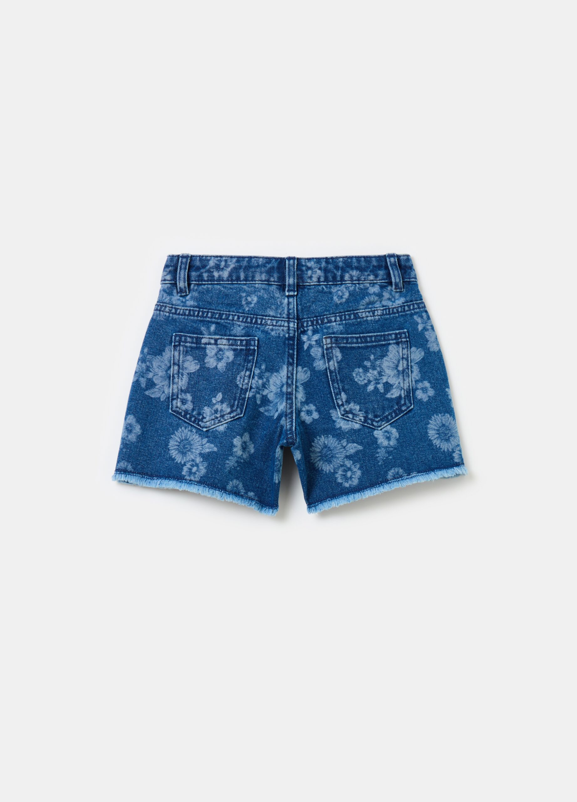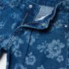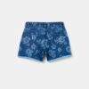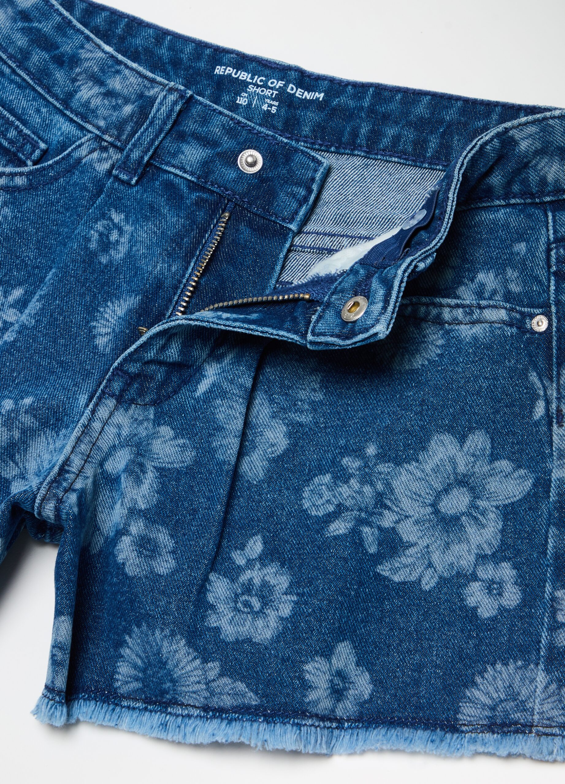Short en denim 100% coton recyclé. Taille réglable intérieurement avec pinces sur le devant. Cinq poches. Imprimé floral intégral. Bordure frangée. Fermetures zippées et boutons-pression.