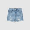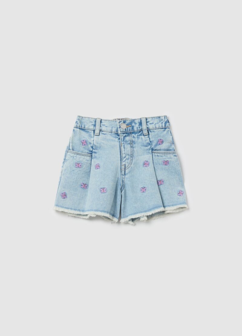 Shorts papillon en denim 100% coton avec des fléchettes à l’avant. Taille élastique à l’arrière avec un réglage interne. Deux poches de welt et deux poches de patch à l’arrière. Broderie de papillons à l’avant. Ourlet à franges.