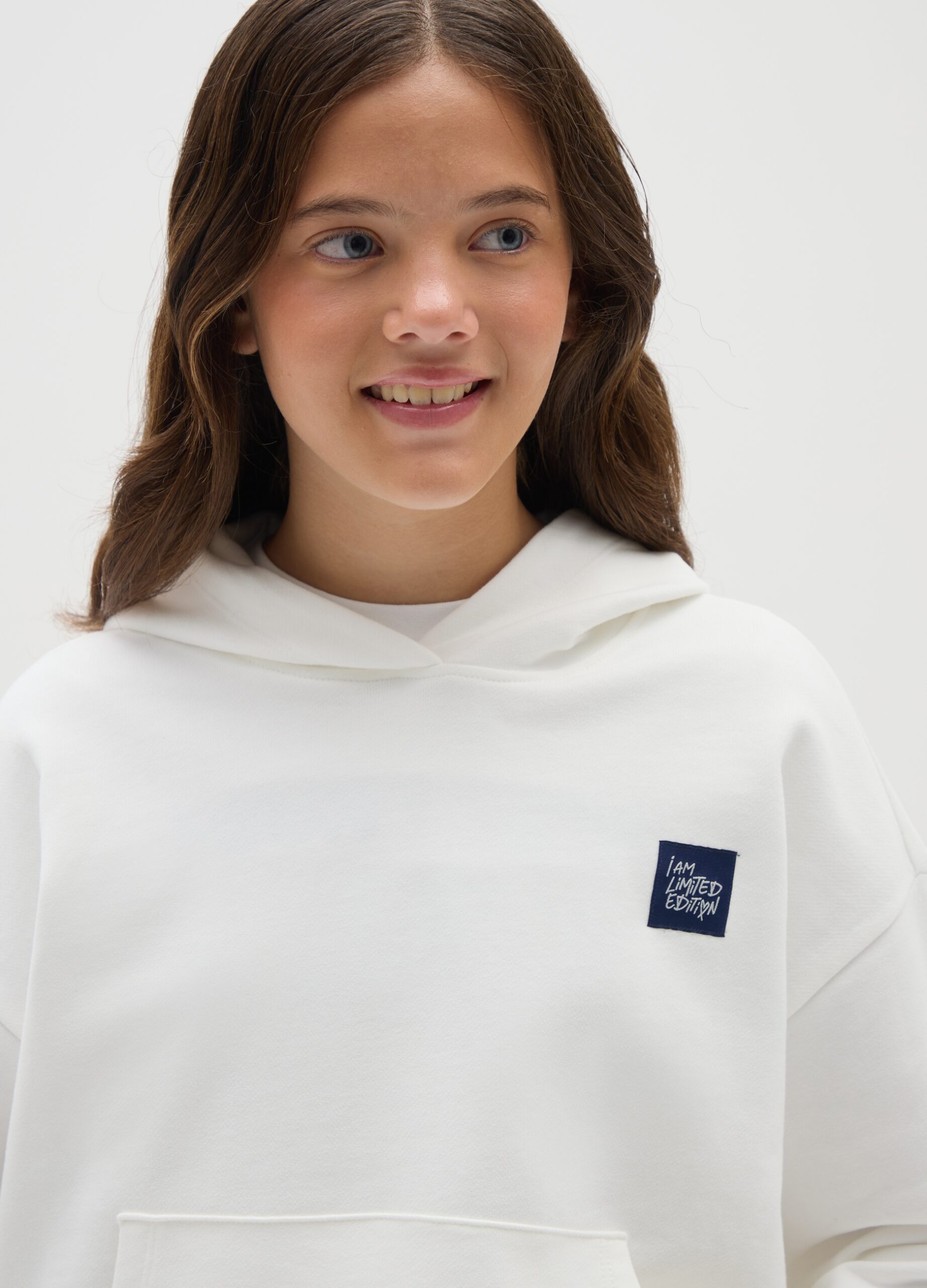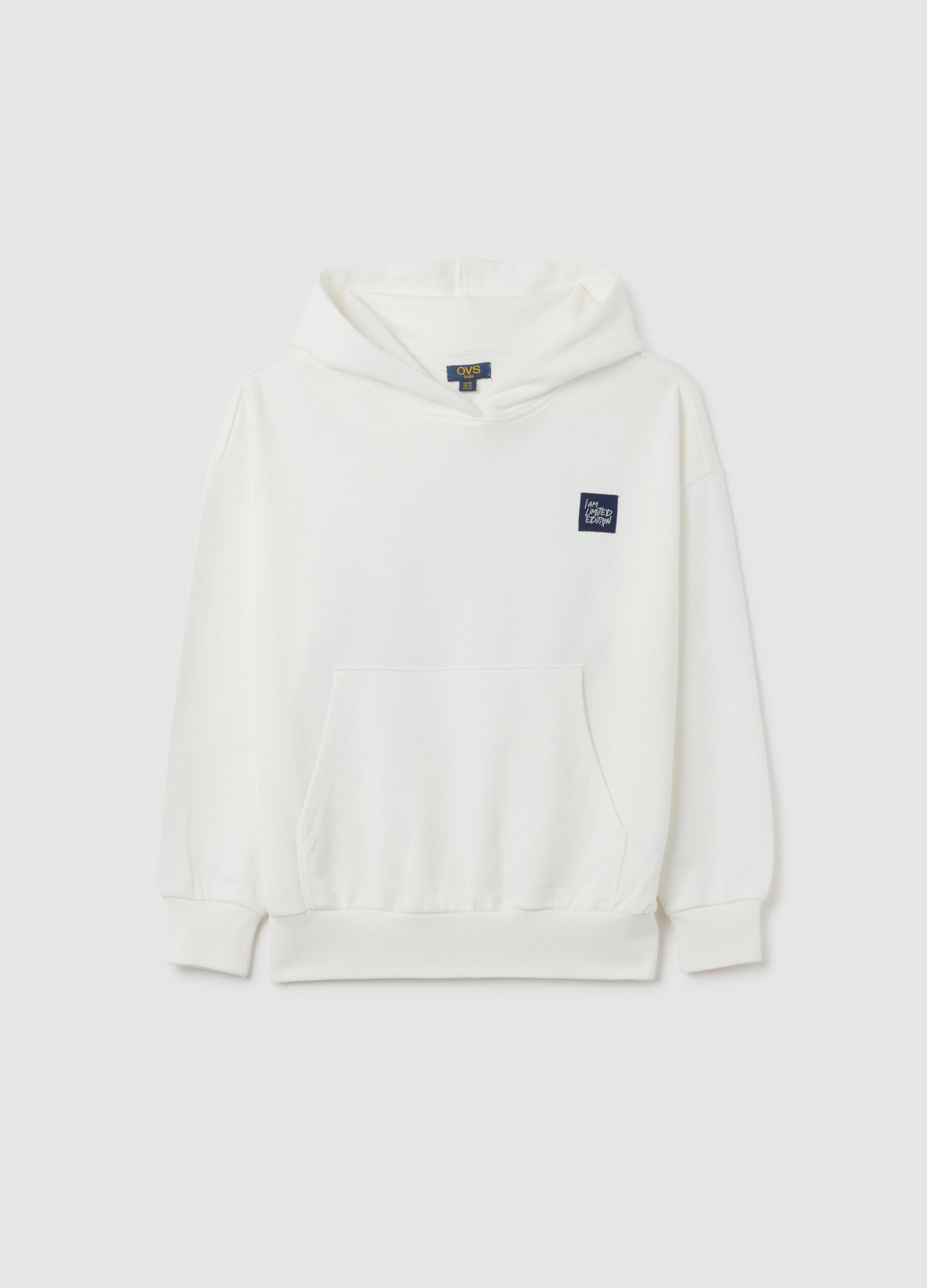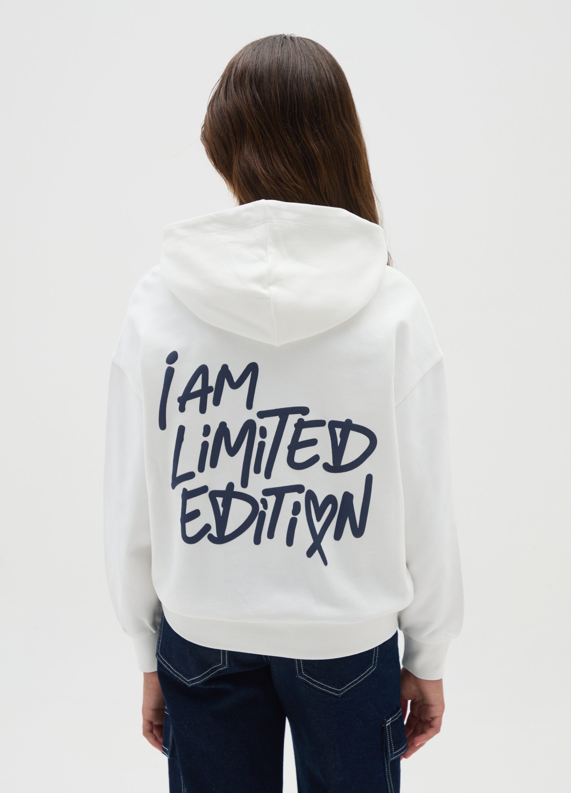 Ce sweat à capuche blanc est conçu pour les filles de 10 à 15 ans, fabriqué en pur coton pour garantir confort et praticité. Le modèle présente une poche kangourou sur le devant et une coupe surdimensionnée, parfaite pour un look décontracté. Au dos, la phrase « I am limited edition » ajoute une touche unique et distinctive au vêtement, le rendant idéal pour toute occasion informelle. Un incontournable de la ligne OVS Kids.