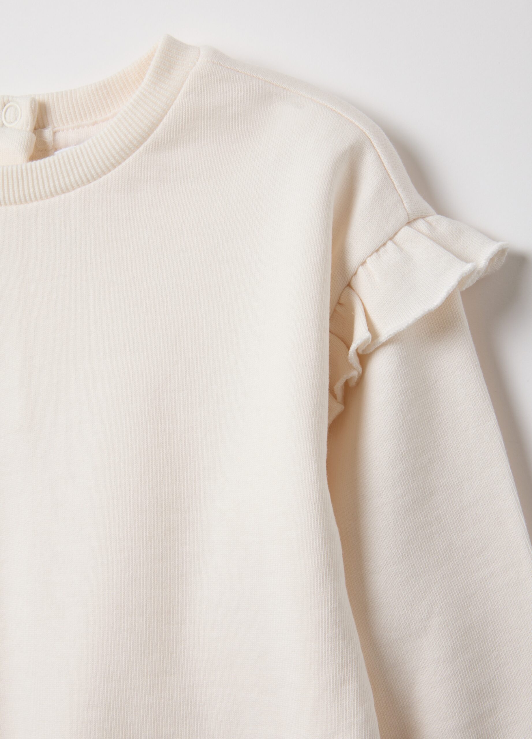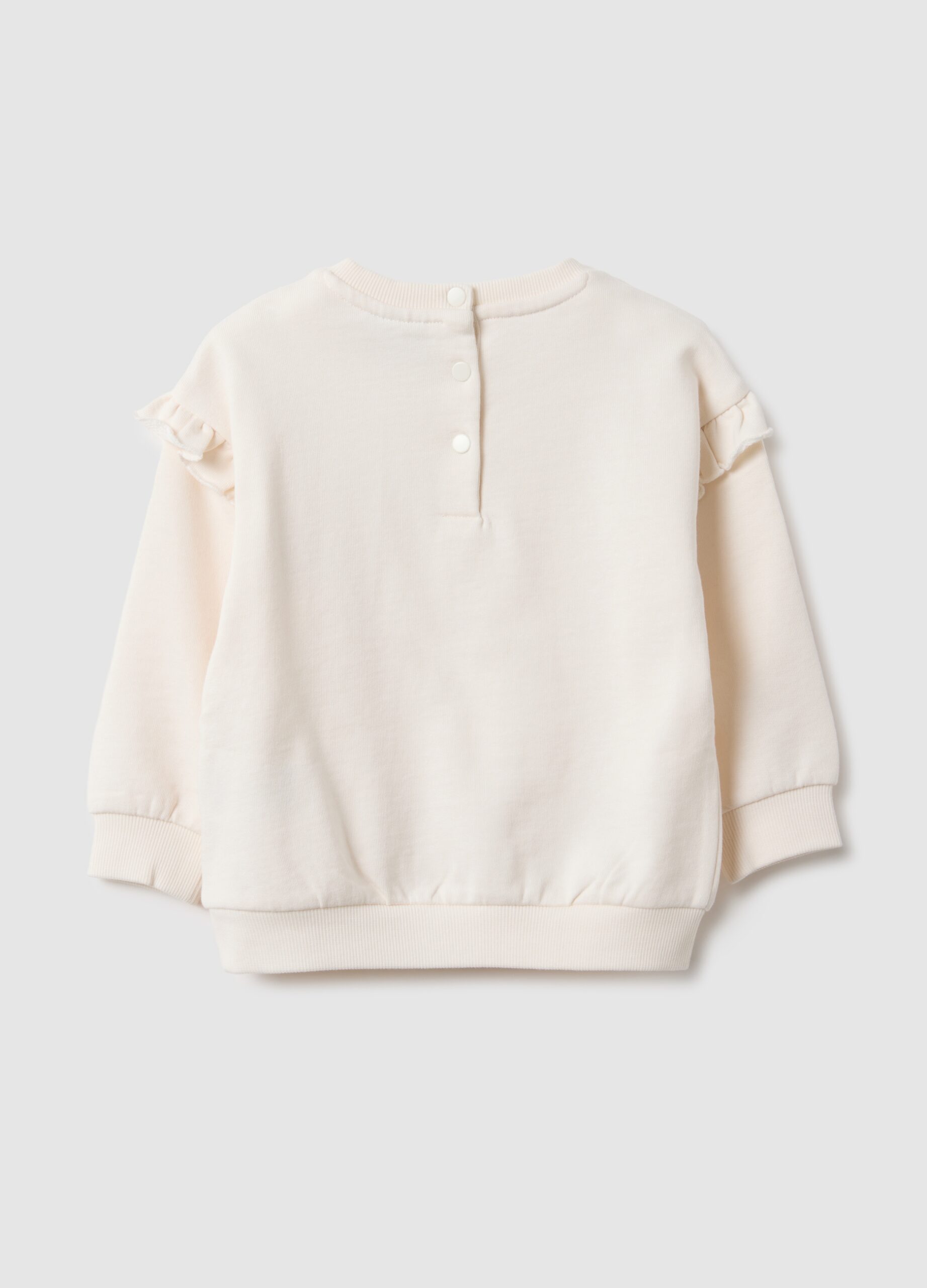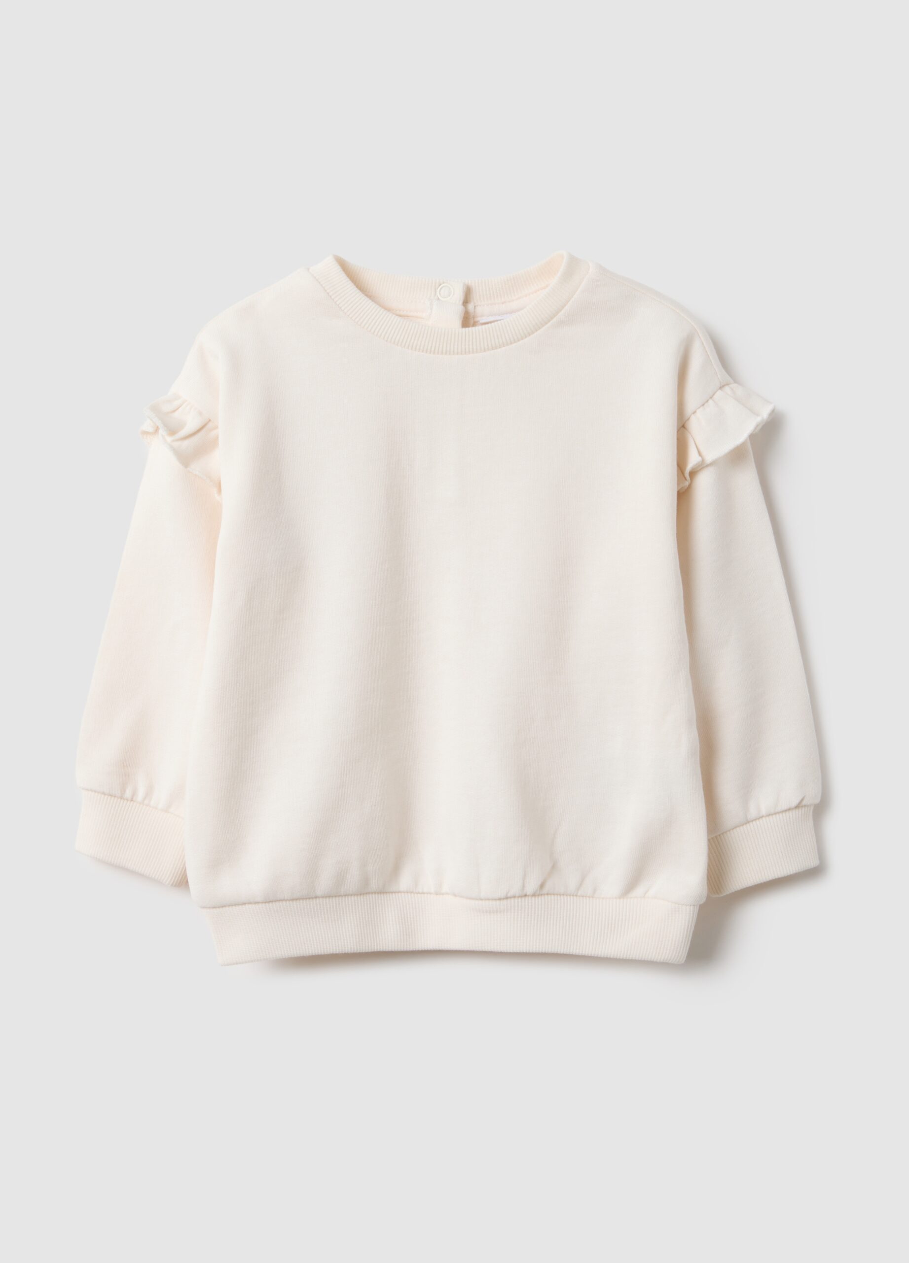 Ce sweat-shirt blanc de la ligne Fagottino, pour fille de 9 à 26 mois, est réalisé en pur coton Terry français bio, idéal pour le confort. Les détails de volants sur les manches longues et l’encolure ronde pratique le rendent parfait pour toutes les occasions. La fermeture boutonnée au dos facilite l’habillage, assurant praticité et fonctionnalité.