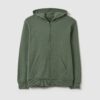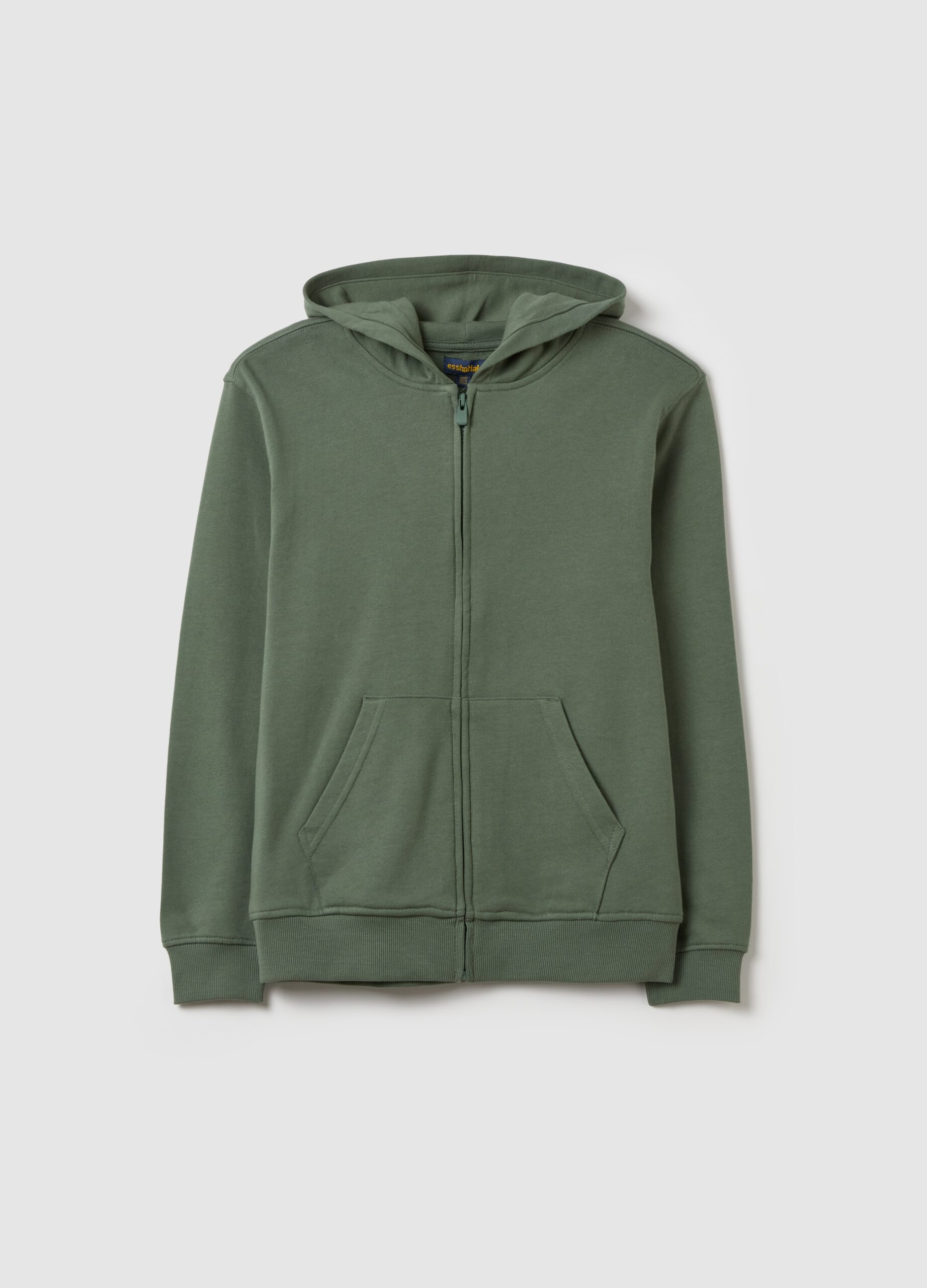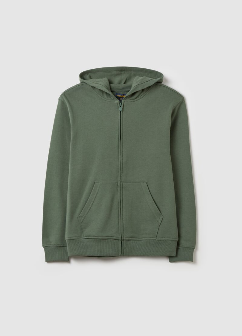 Sweat-shirt complet à zip en toison 100% coton avec capuche. Deux poches de poche. Poignets tricotés et ourlet.