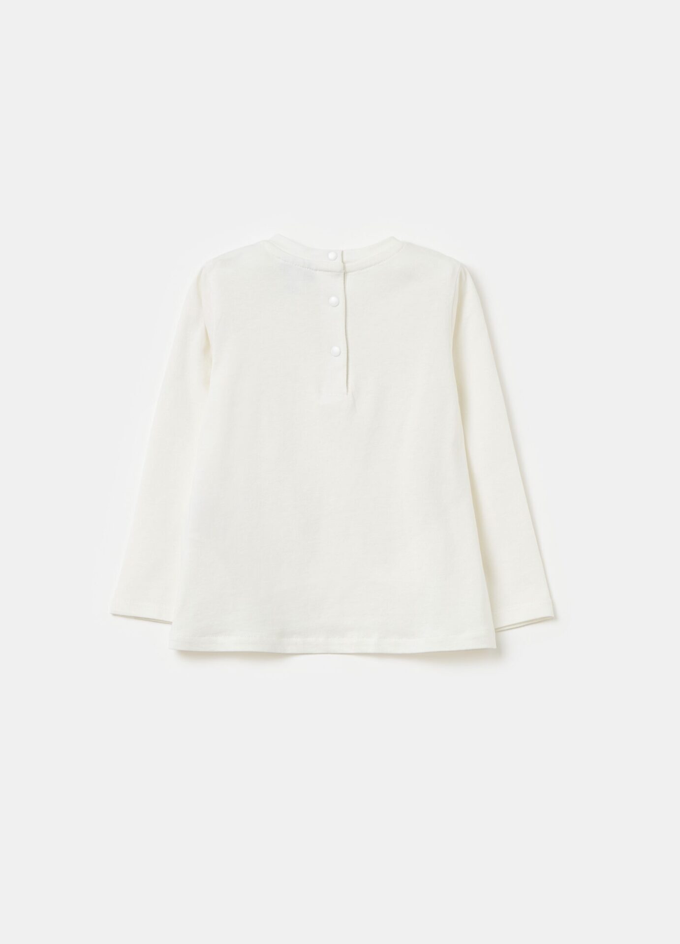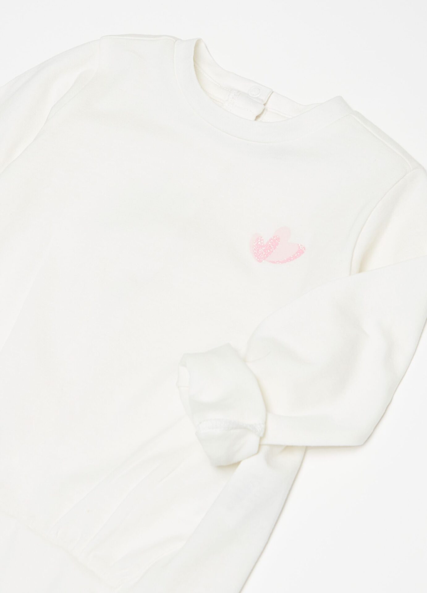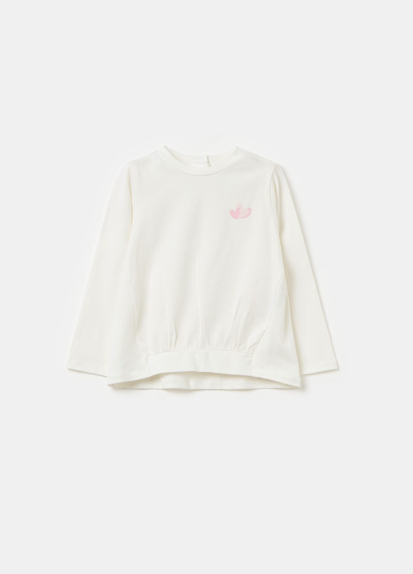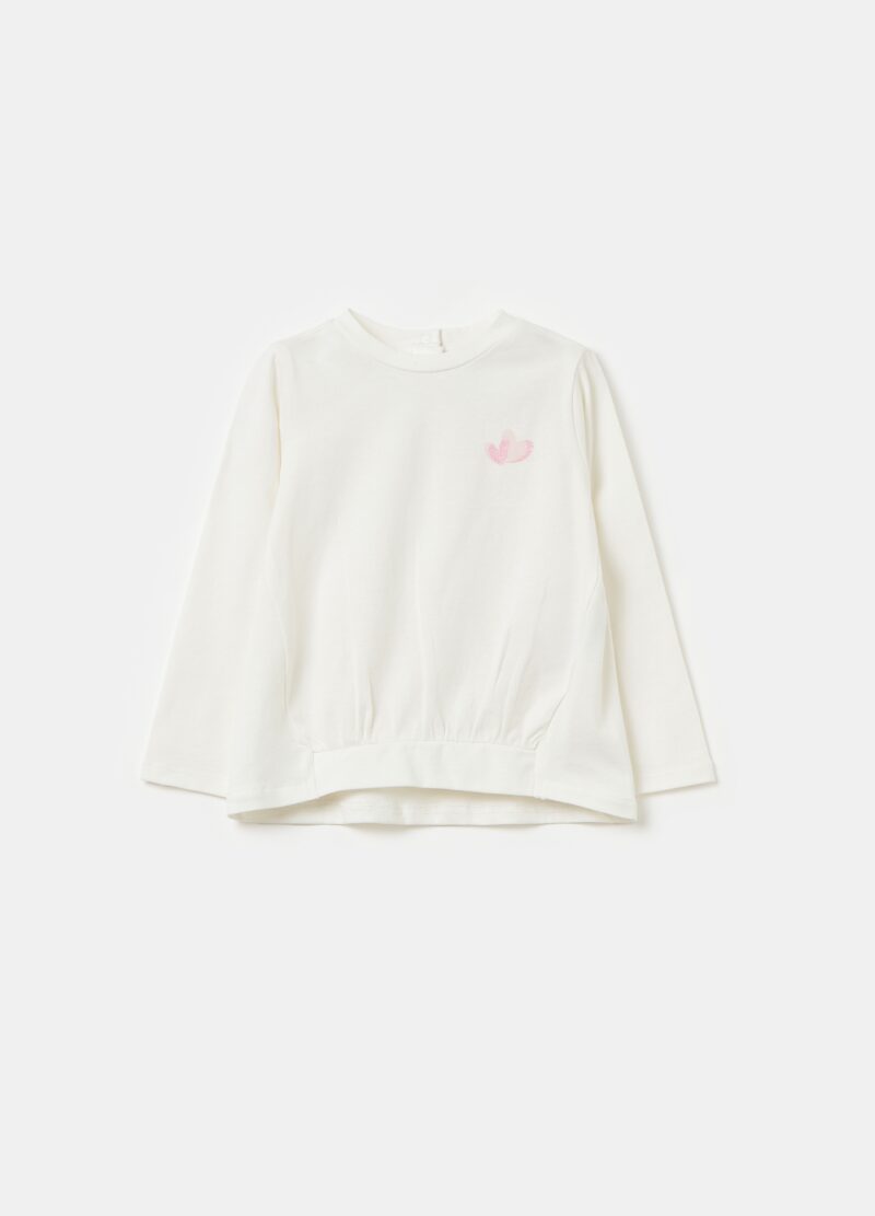T-shirt à manches longues en coton stretch. Col rond avec boutons pression au dos. Imprimé coeurs avec paillettes sur la poitrine. Base avec plissage sur le devant.