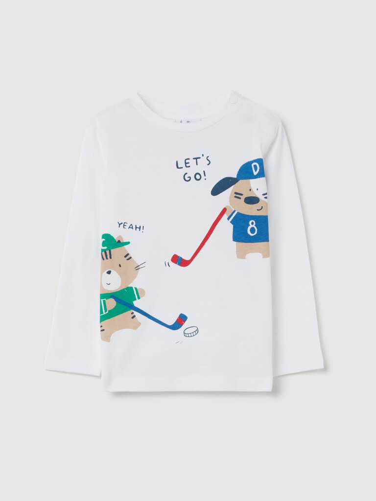 T-shirt 100% coton à manches longues. Col rond avec boutons pression sur l’épaule. Imprimé animaux joueurs de hockey et inscription « Let’s Go » sur le devant.