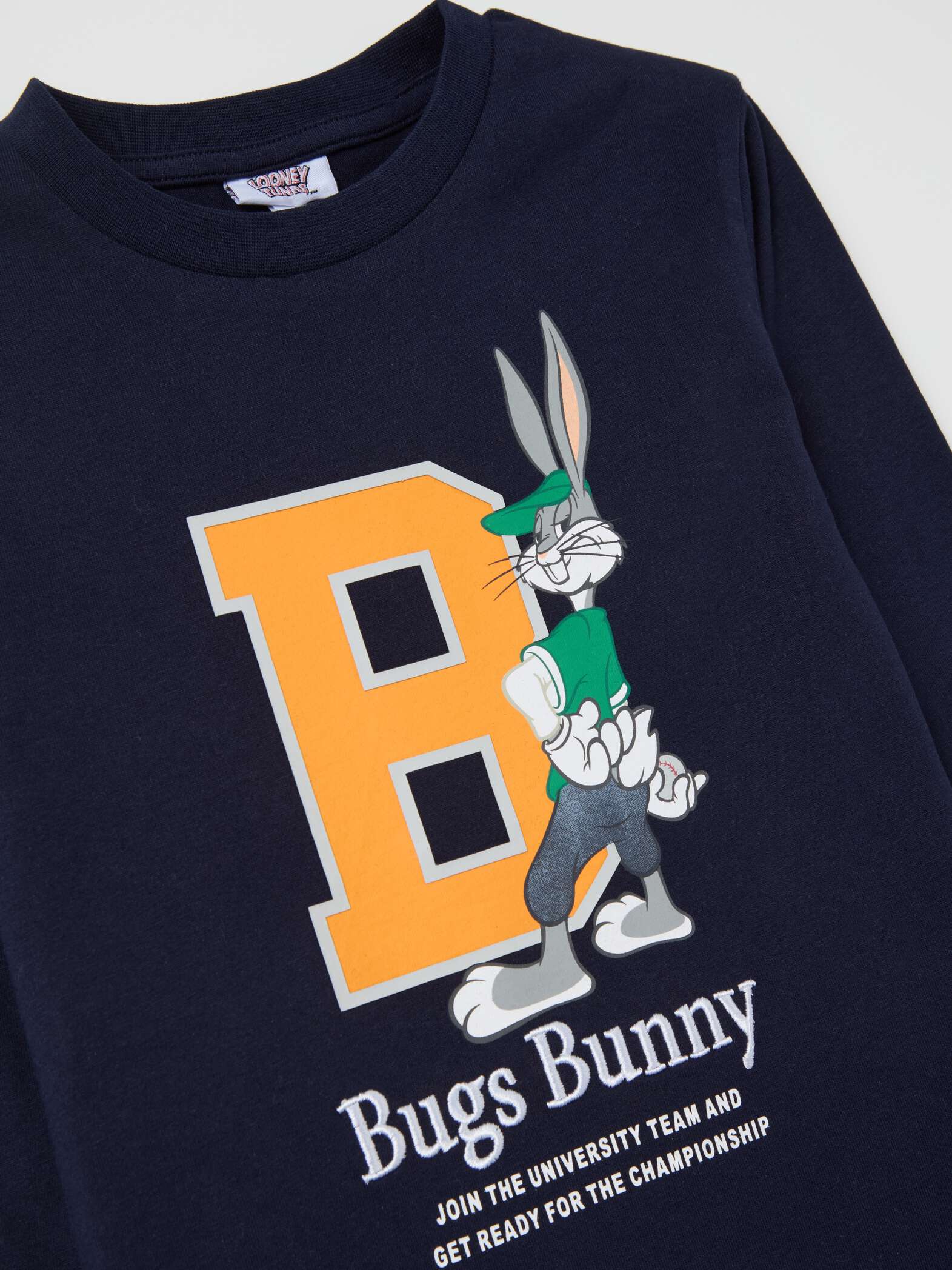 T-shirt 100% coton à manches longues. Col rond. Imprimé et lettrage du joueur de baseball Looney Tunes Bugs Bunny. Broderie lettrage « Bugs Bunny » sur le devant.
