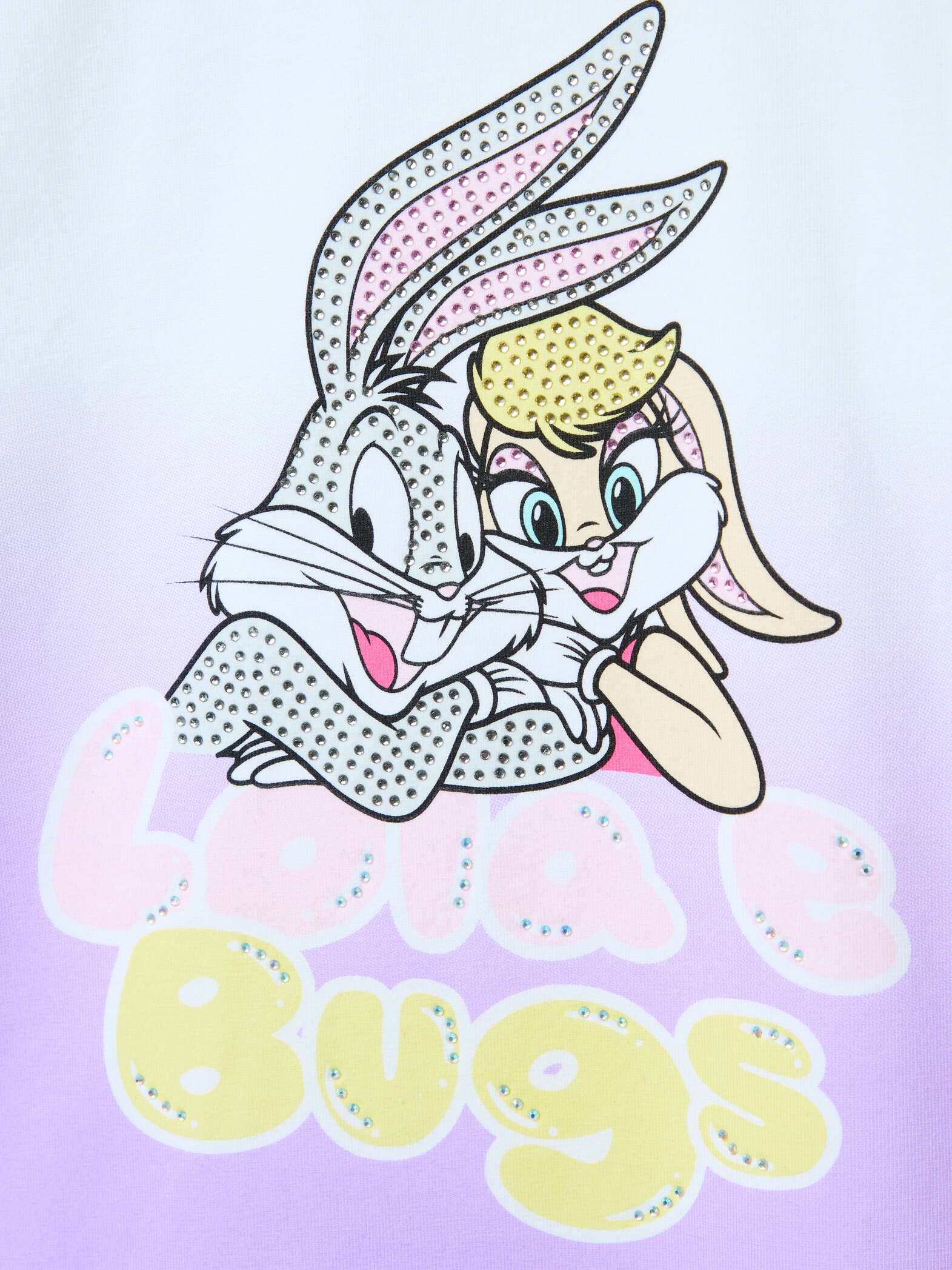 T-shirt en coton stretch. Col rond. Épaules tombantes. Motif dip dye. Imprimé Bugs Bunny et Lola Looney Tunes avec strass sur le devant.