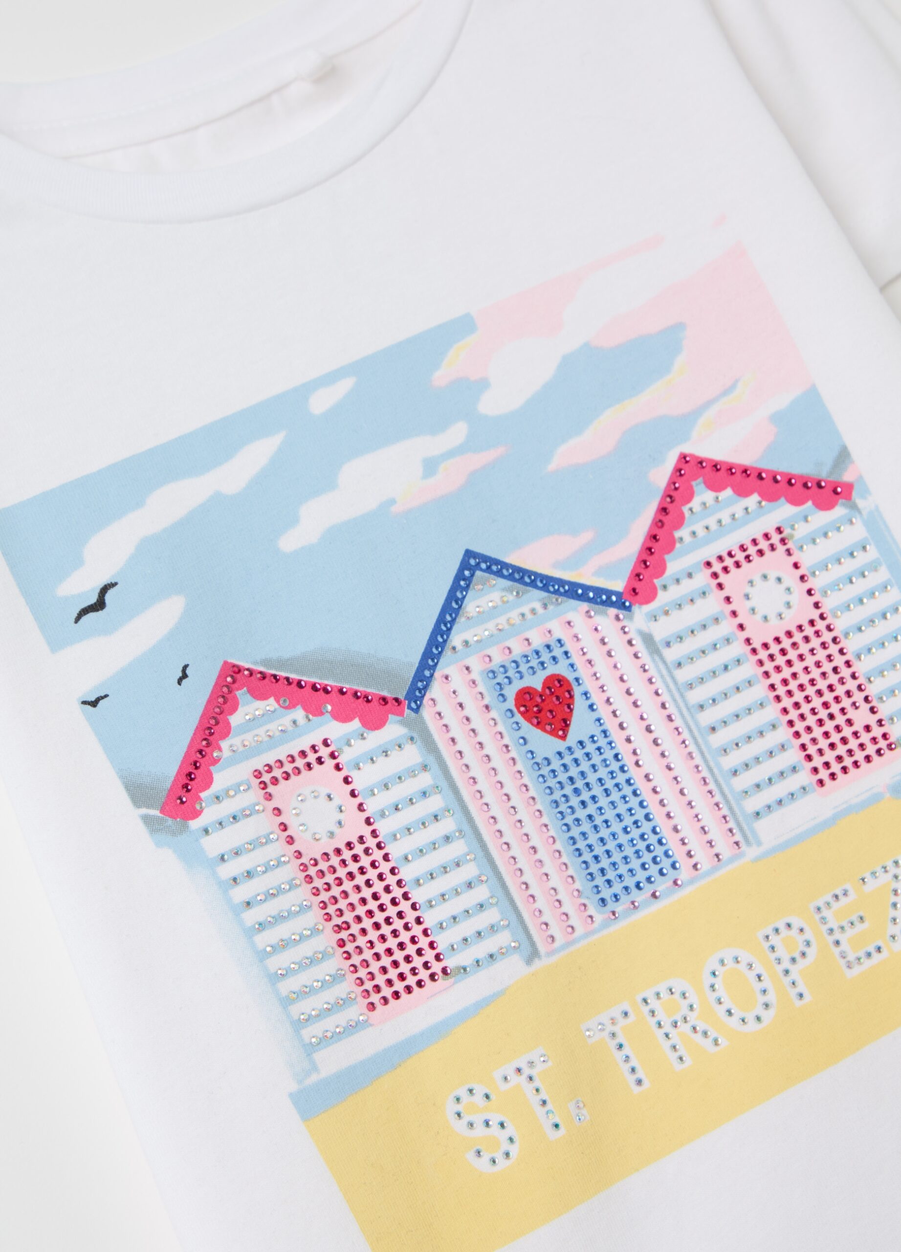 T-shirt en coton extensible. Nou rond. Cabins de plage imprimés et «St. Lettrage de Tropez avec des diamants multicolores sur le devant.