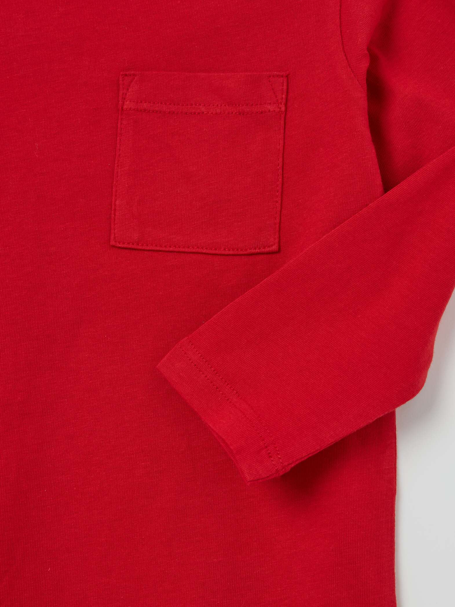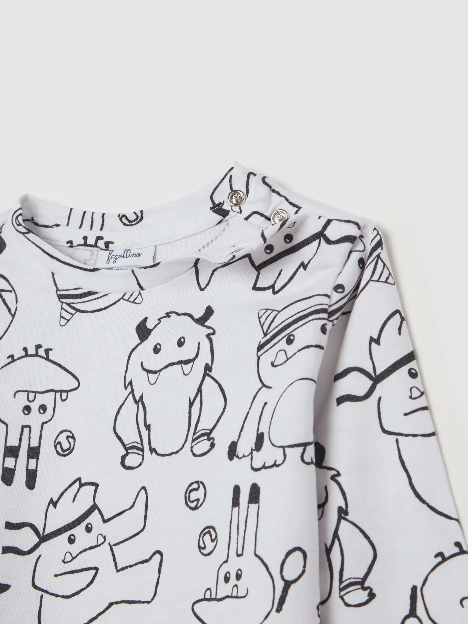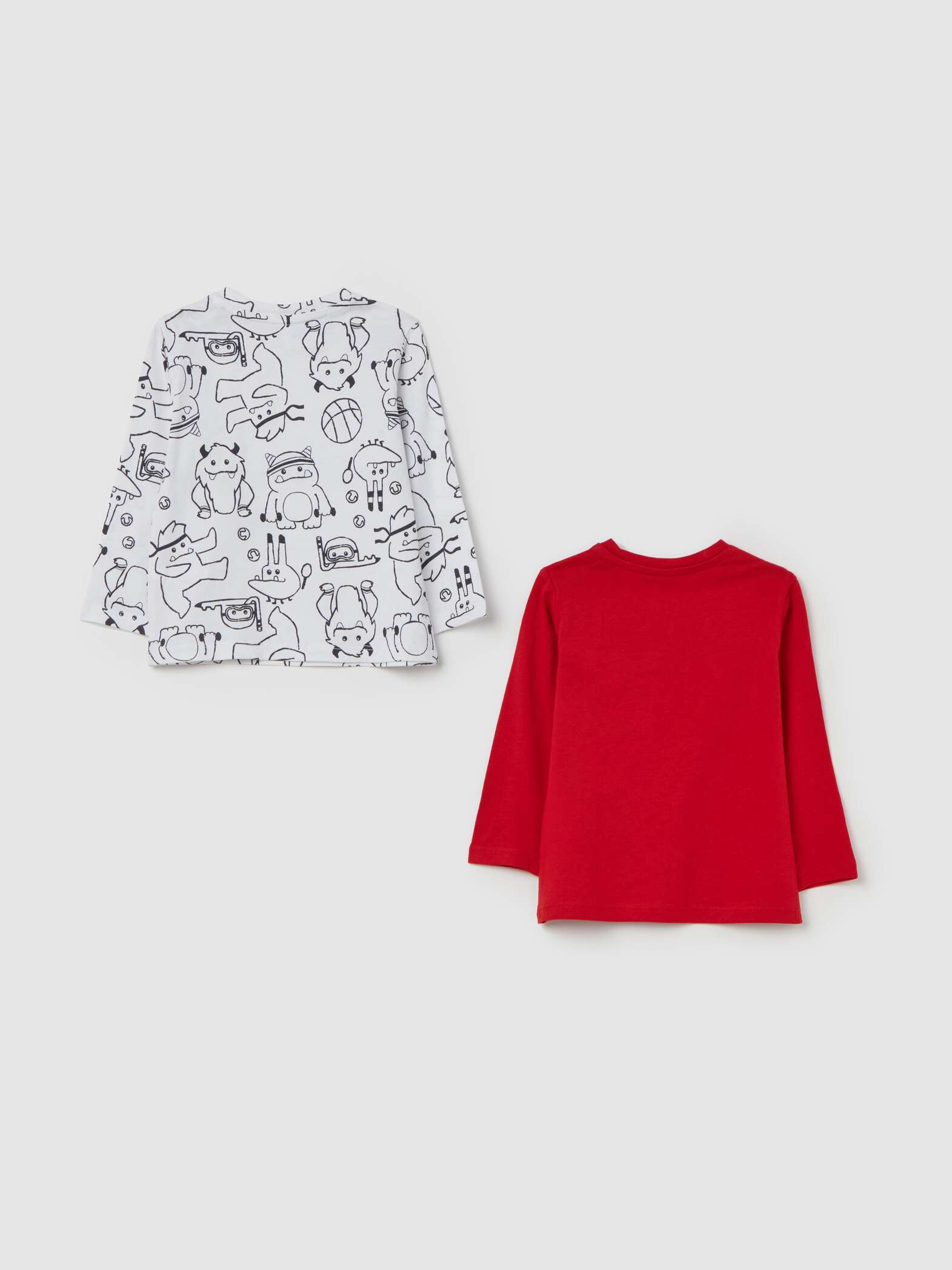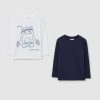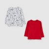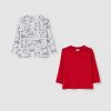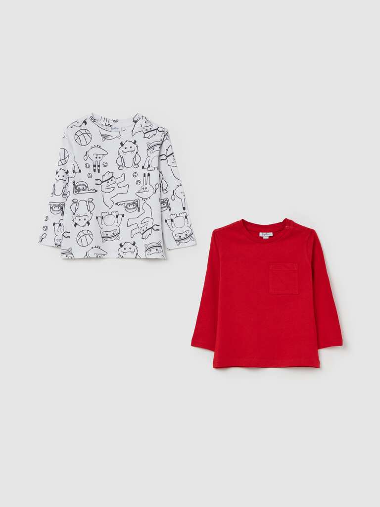 Set composto da due t-shirt a maniche longhe en pur coton. Tournez le rond avec les boutons automatiques sur l’espace. Un t-shirt avec impression all-over. Un t-shirt teinté avec une tâche appliquée sur le côté.