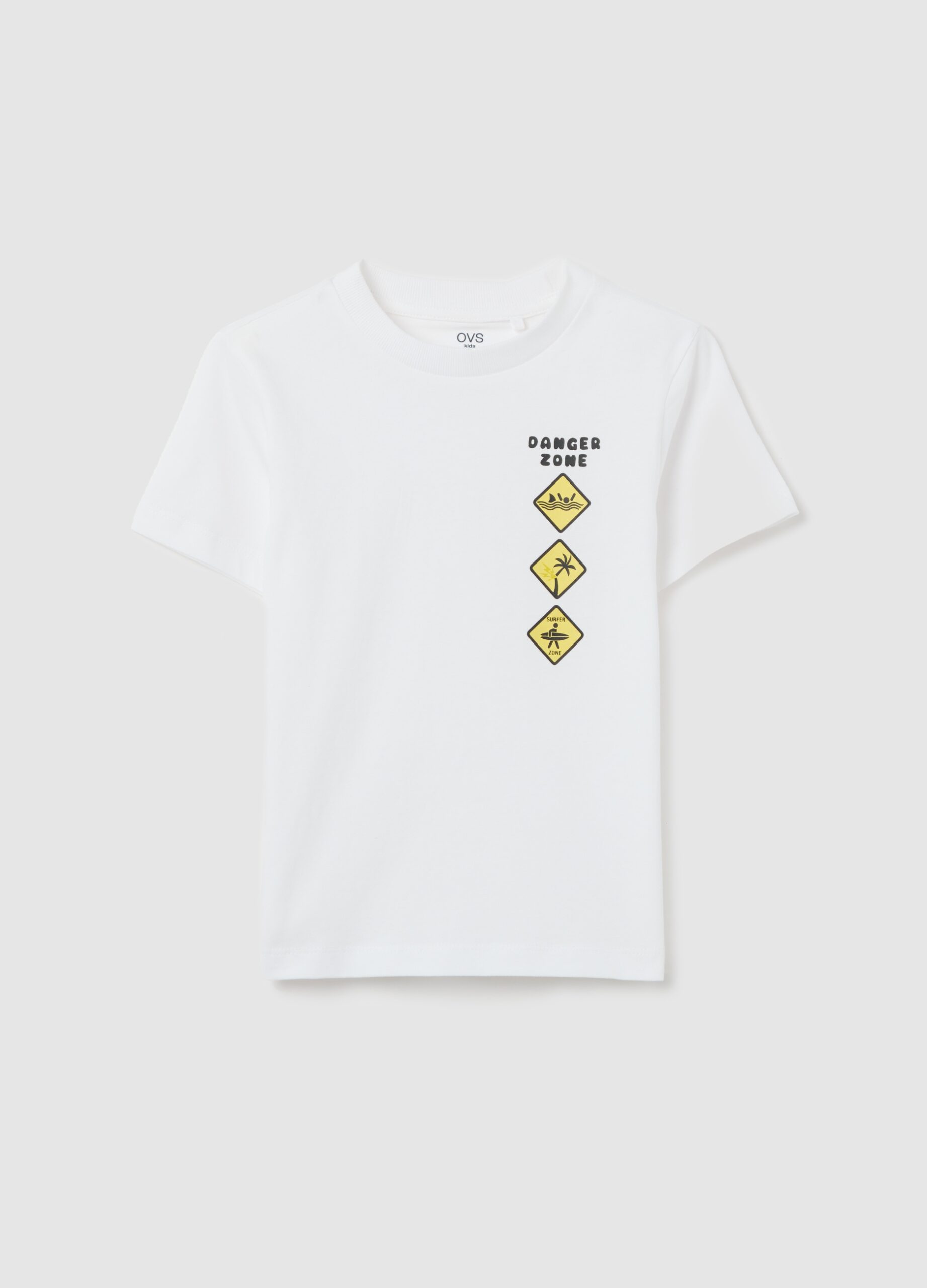 T-shirt de coton pur ovs pur avec un graphique de zone de danger. Manches courtes et col rond. Parfait pour un look décontracté et confortable.