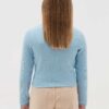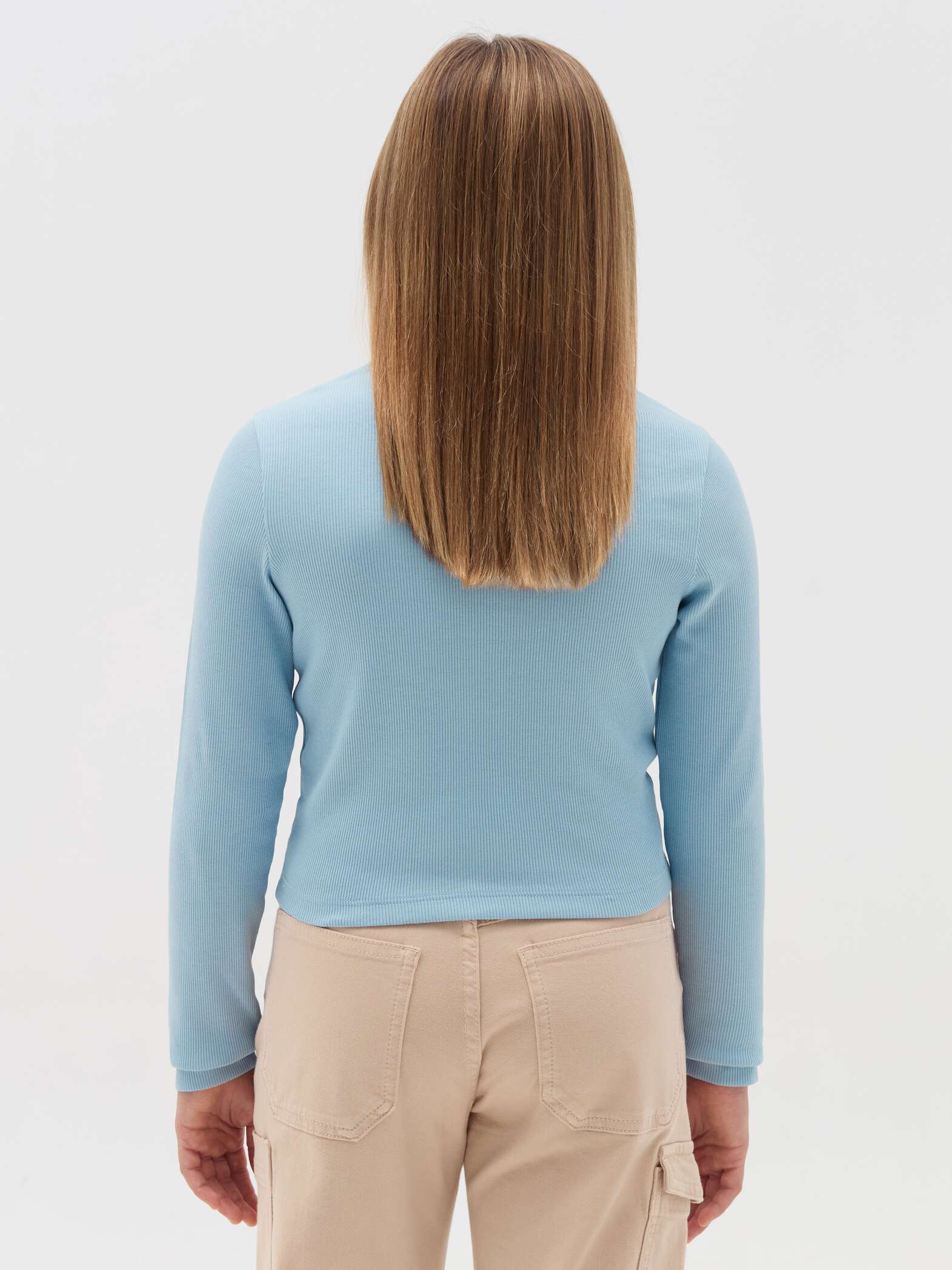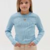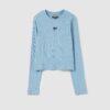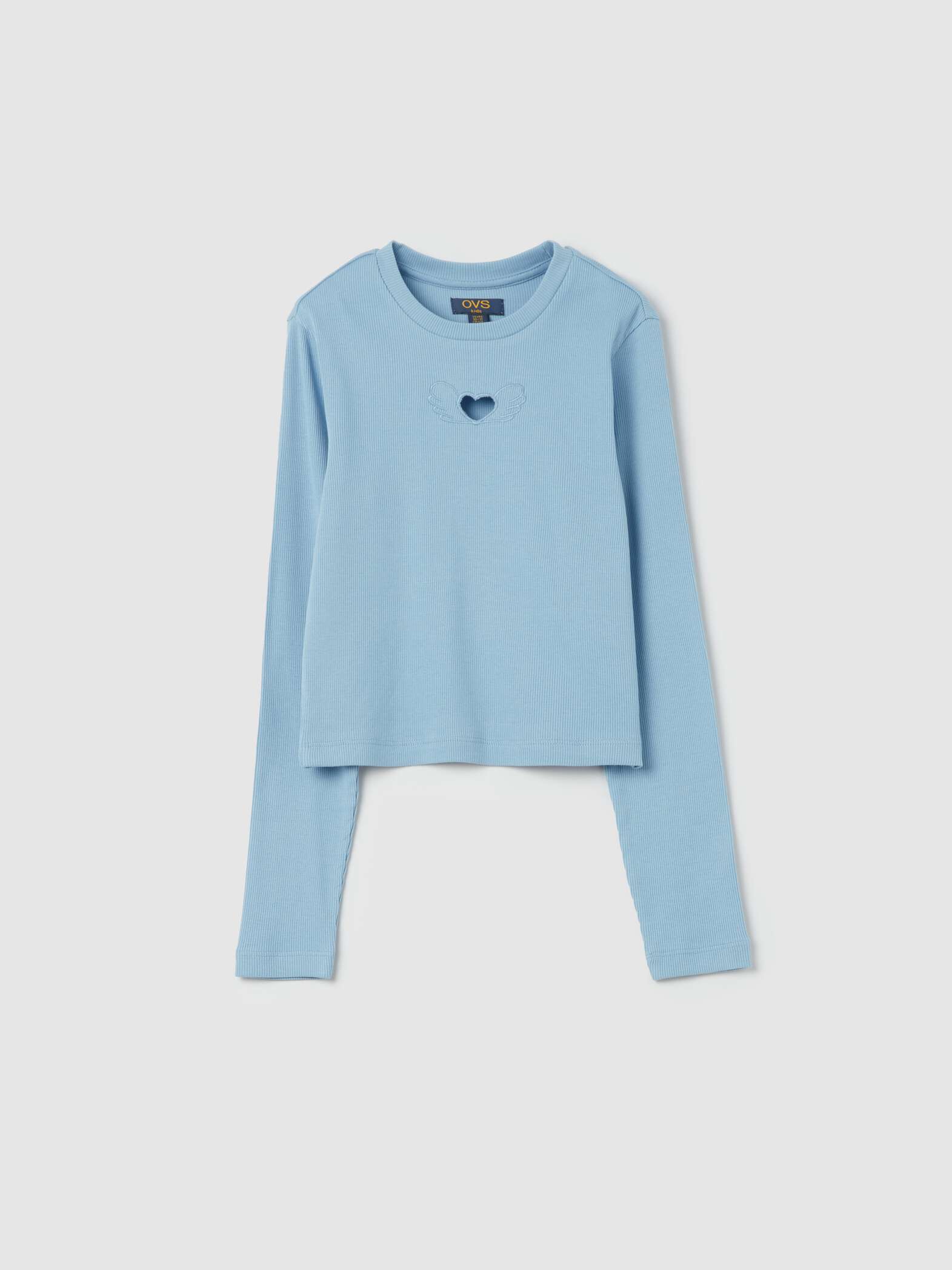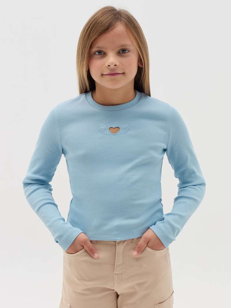 T-shirt court en coton côtelé extensible. Col rond. Manches longues. Broderie cœur ajouré avec ailes sur la poitrine.