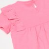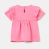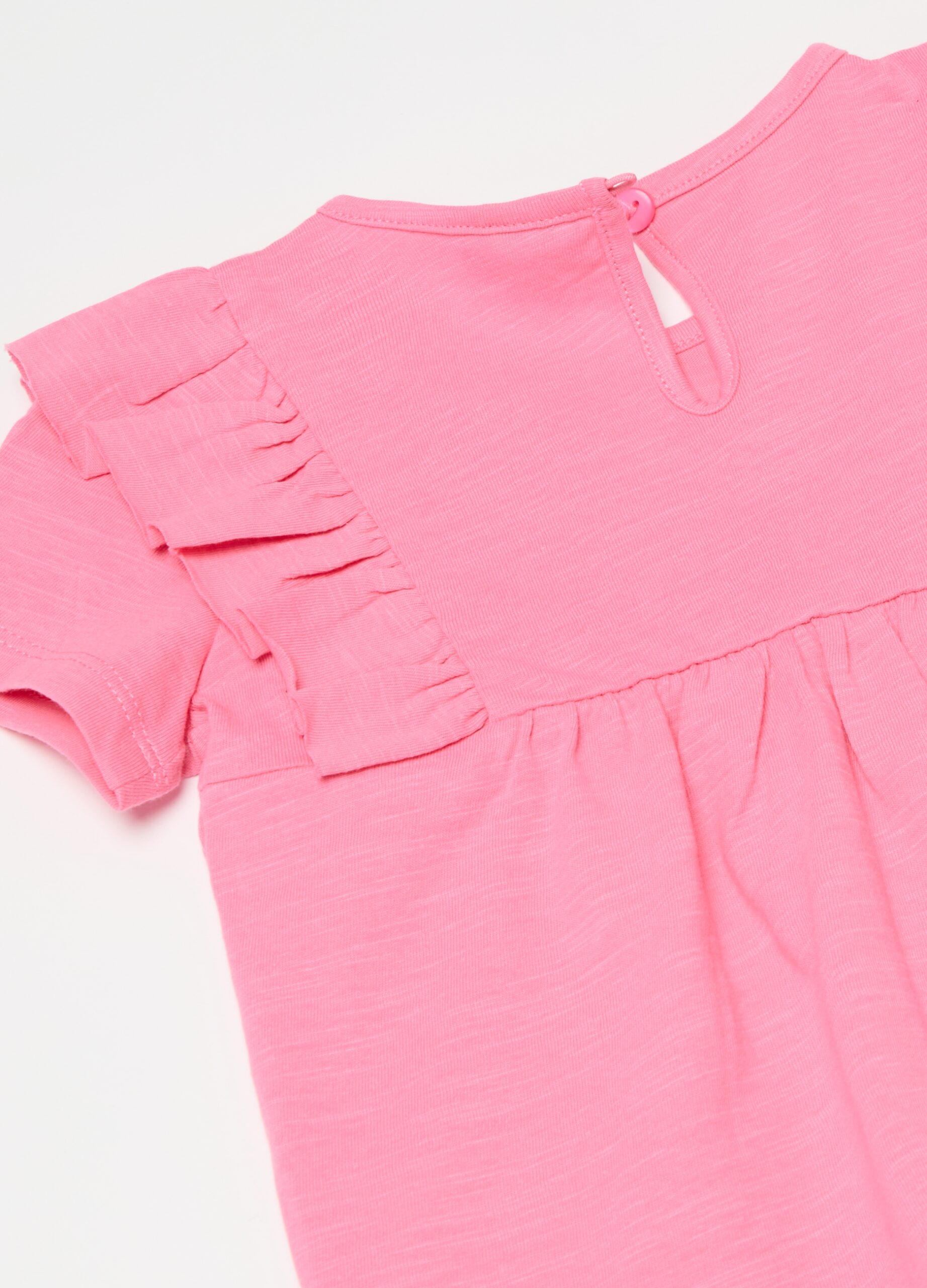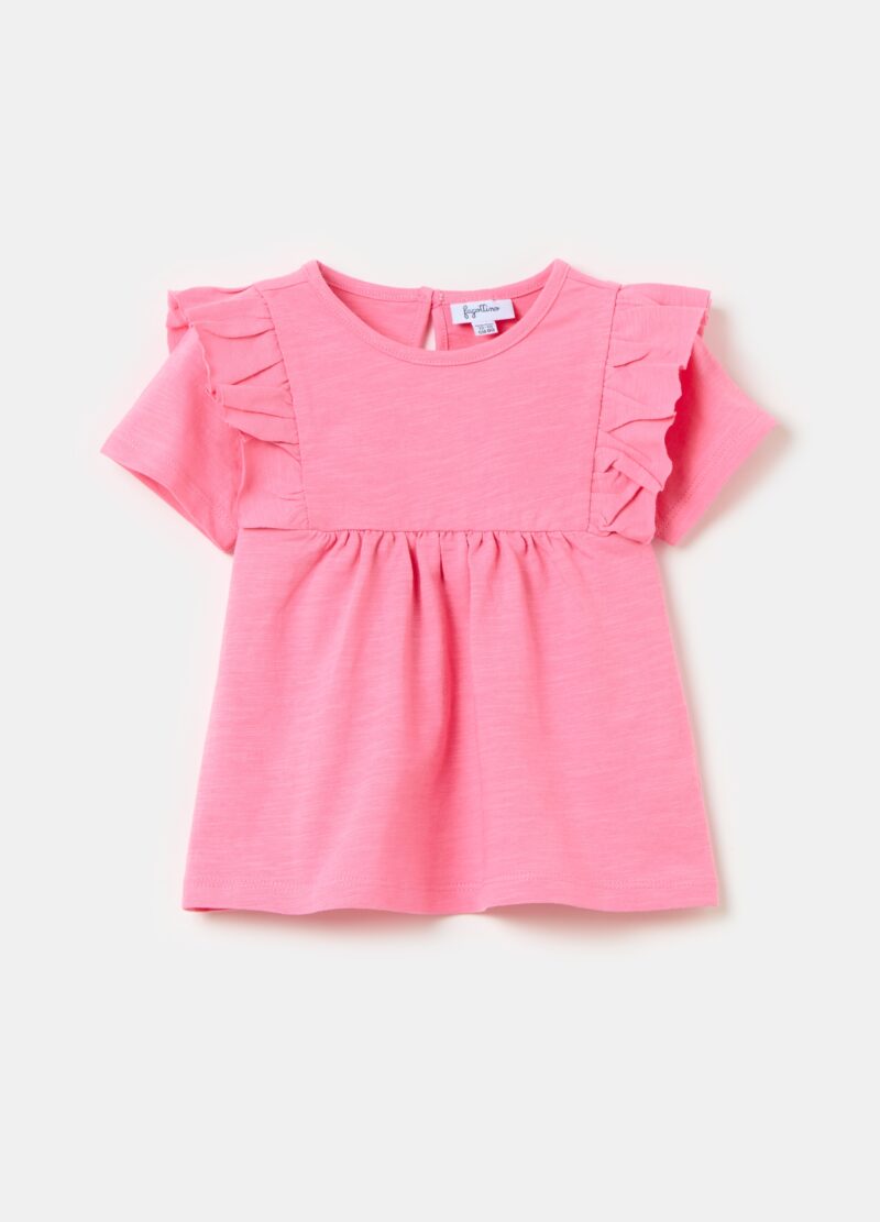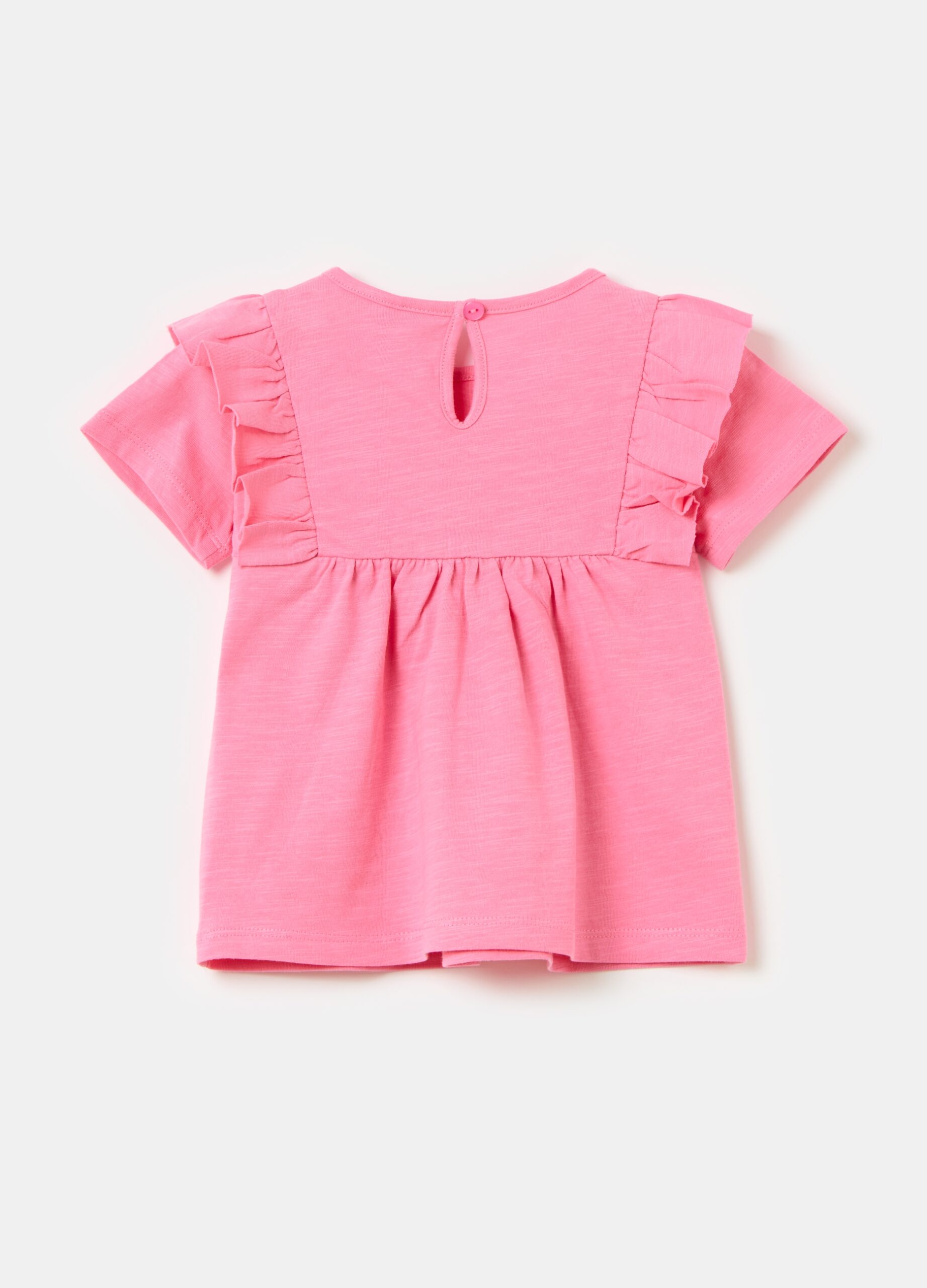 T-shirt 100% coton effet irisé. Col rond. Volant appliqué sur les bras. Ouverture goutte d’eau avec fermeture boutonnée au dos.