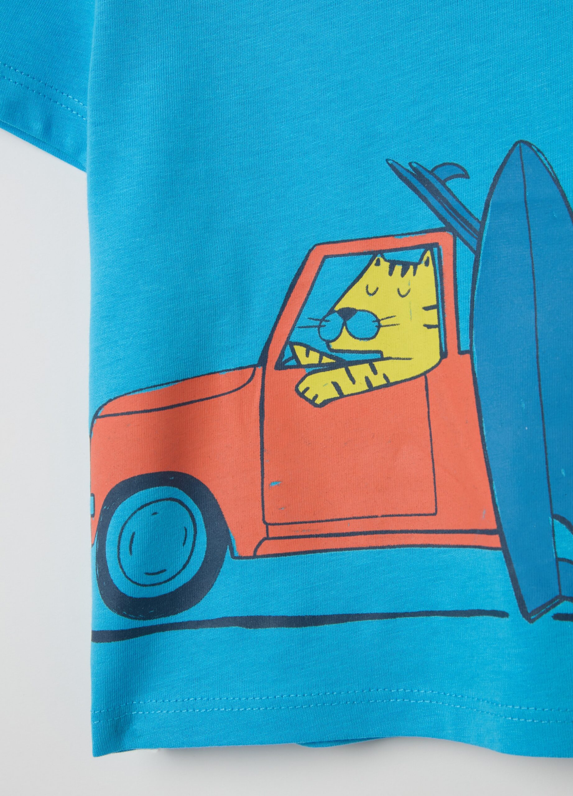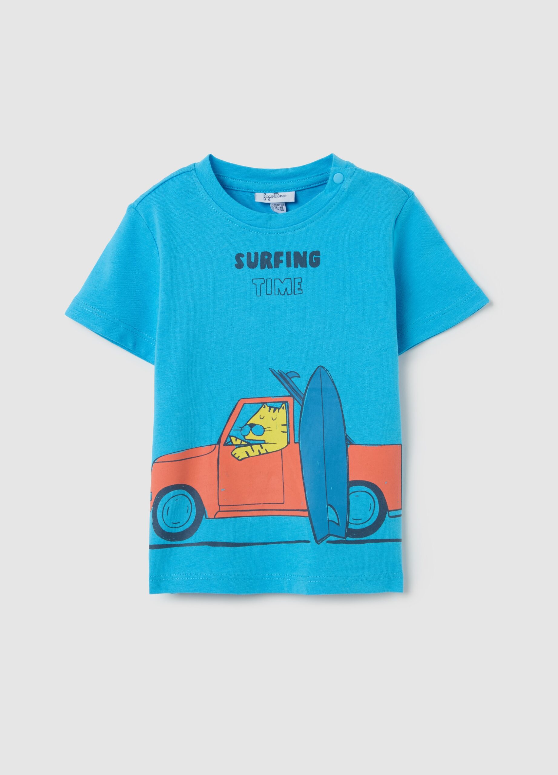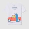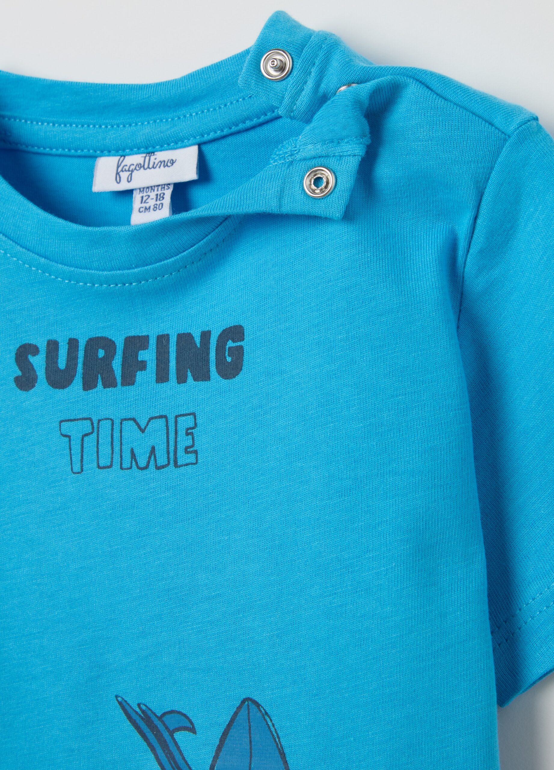 T-shirt 100% coton. Cou rond avec boutons instantanés sur l’épaule. Le lettrage des tigres de surfeur et un lettrage du «temps de surf» à l’avant.