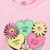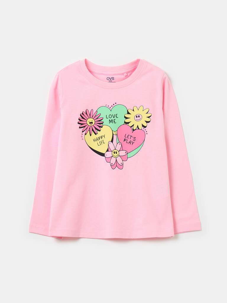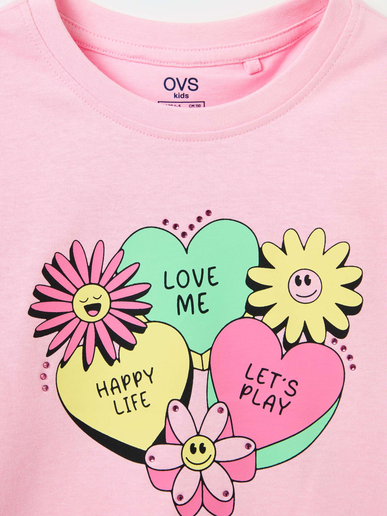 T-shirt 100% coton à manches longues. Col rond. Imprimé coeurs et fleurs avec lettrage et strass sur la poitrine.