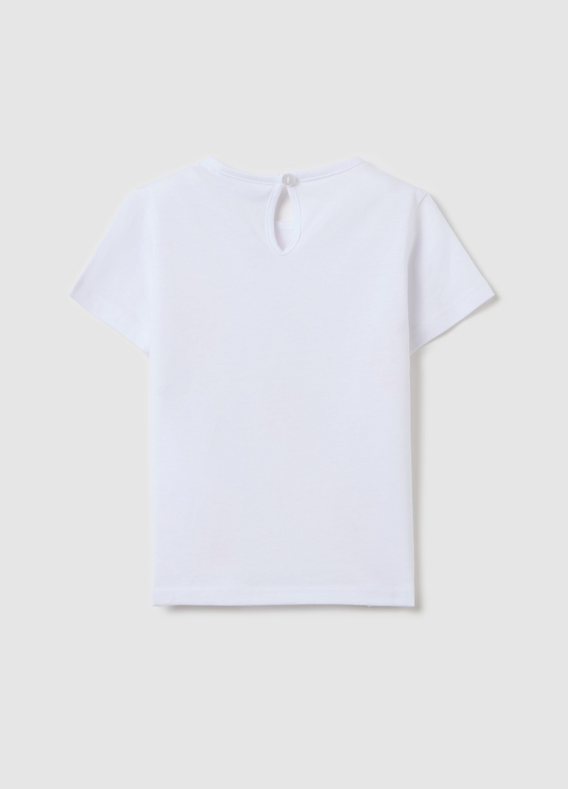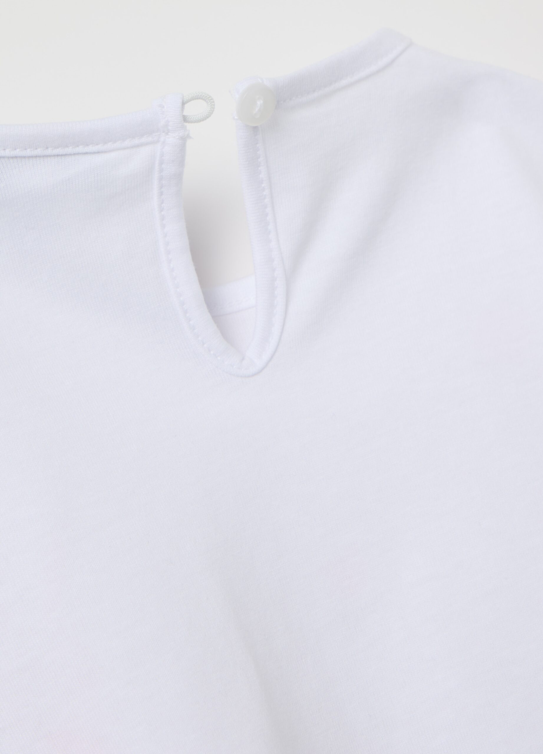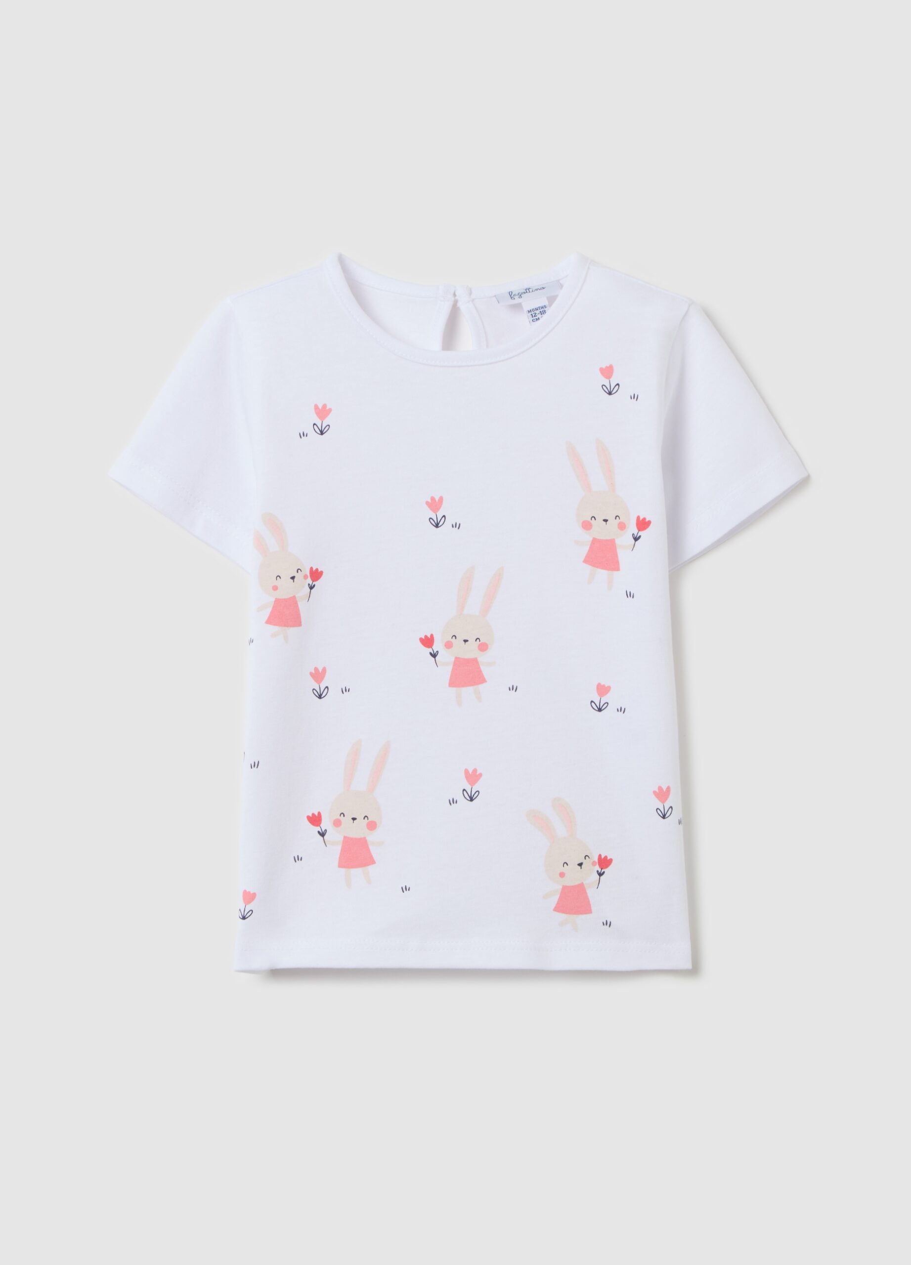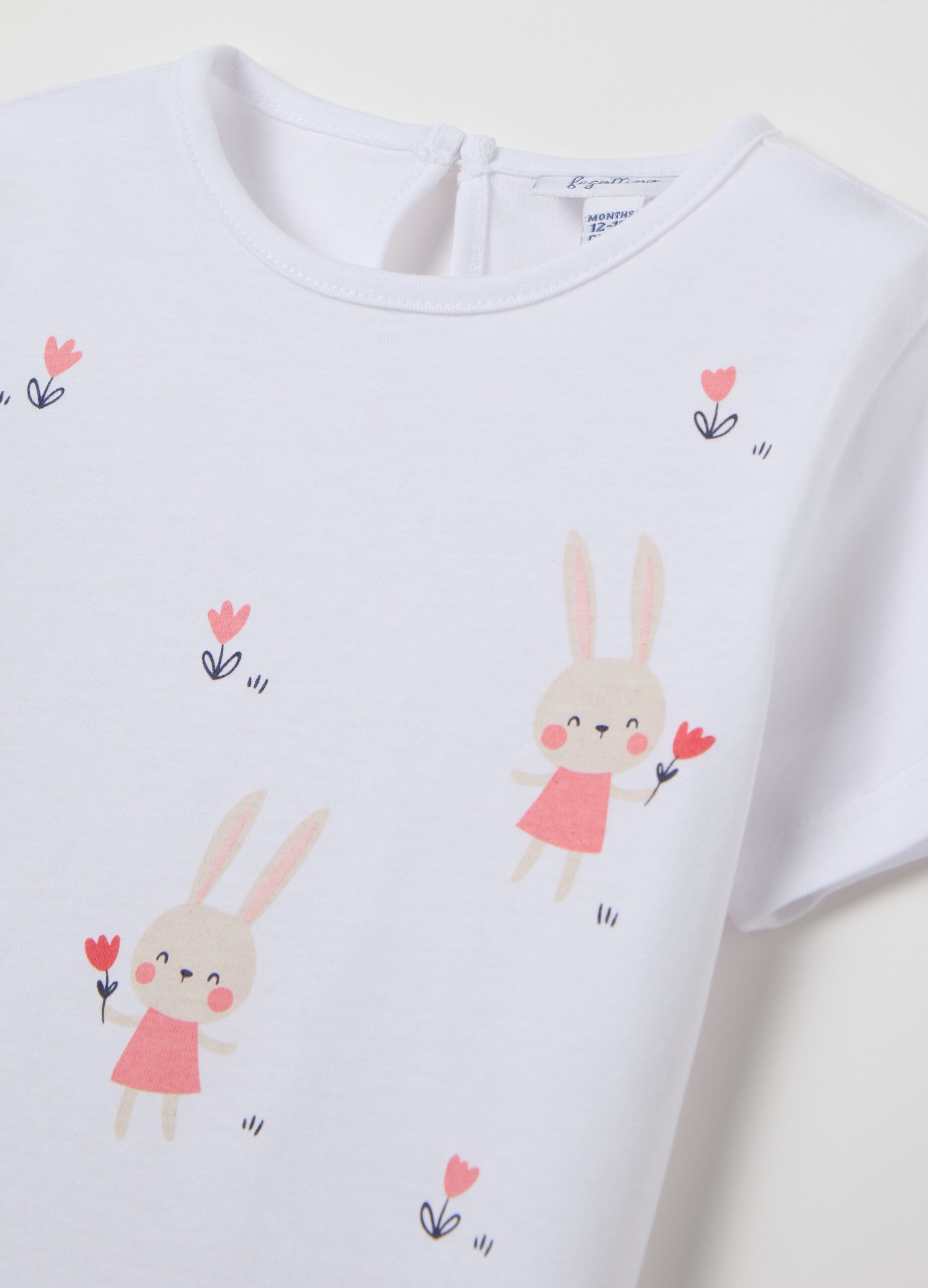 T-shirt 100% coton. Nou rond. Les lapins impriment avec des fleurs sur le devant. Ouverture de trou de serrure avec une attache de bouton à l’arrière.